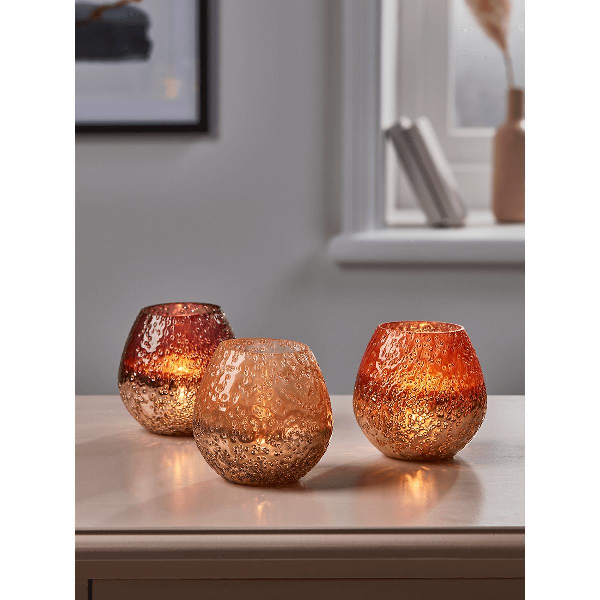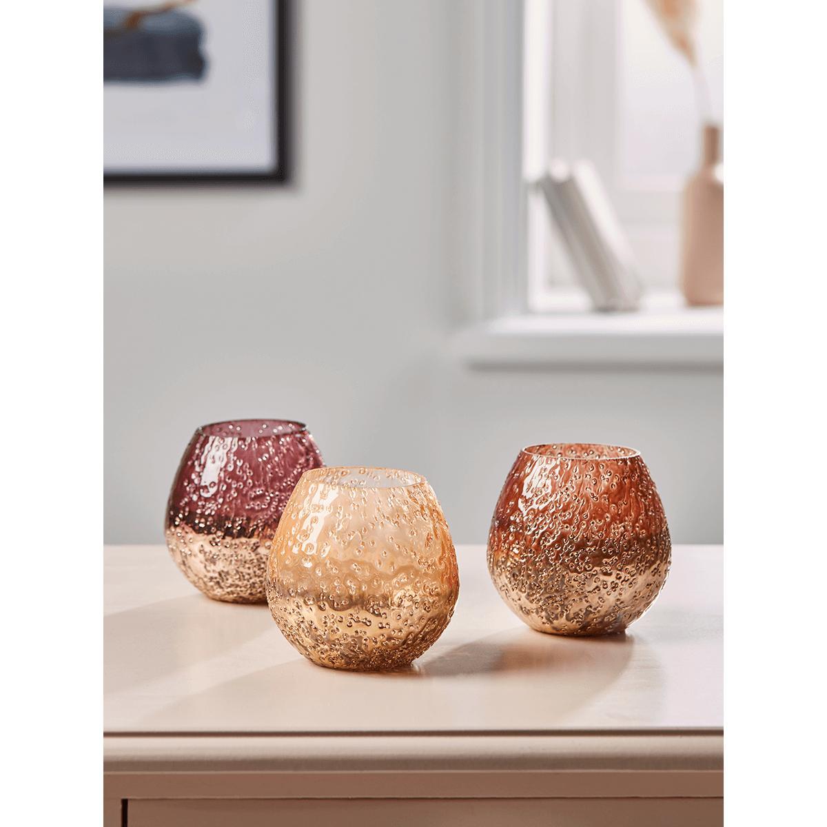 I love these glass tealight holders for their versatile, textured finish which adds warmth and interest to any space. They work particularly well in contemporary or boho interiors, where their three-tone glass surface creates an inviting glow. For styling tips, I recommend grouping them on a coffee table or mantle for a cosy focal point, or lining them up along a windowsill for subtle ambient lighting. Their size and shape make them easy to combine with other decorative objects like ceramics or greenery, allowing for an effortless yet stylish display. These holders are a practical way to introduce colour and texture, making them a great addition to both everyday and special occasion setups.