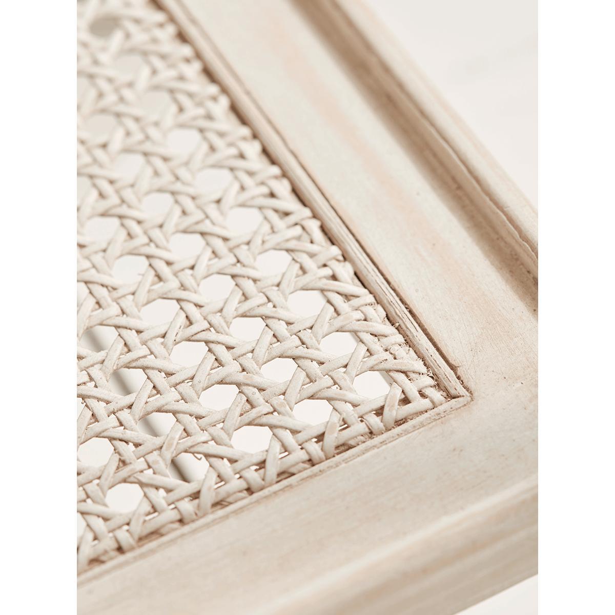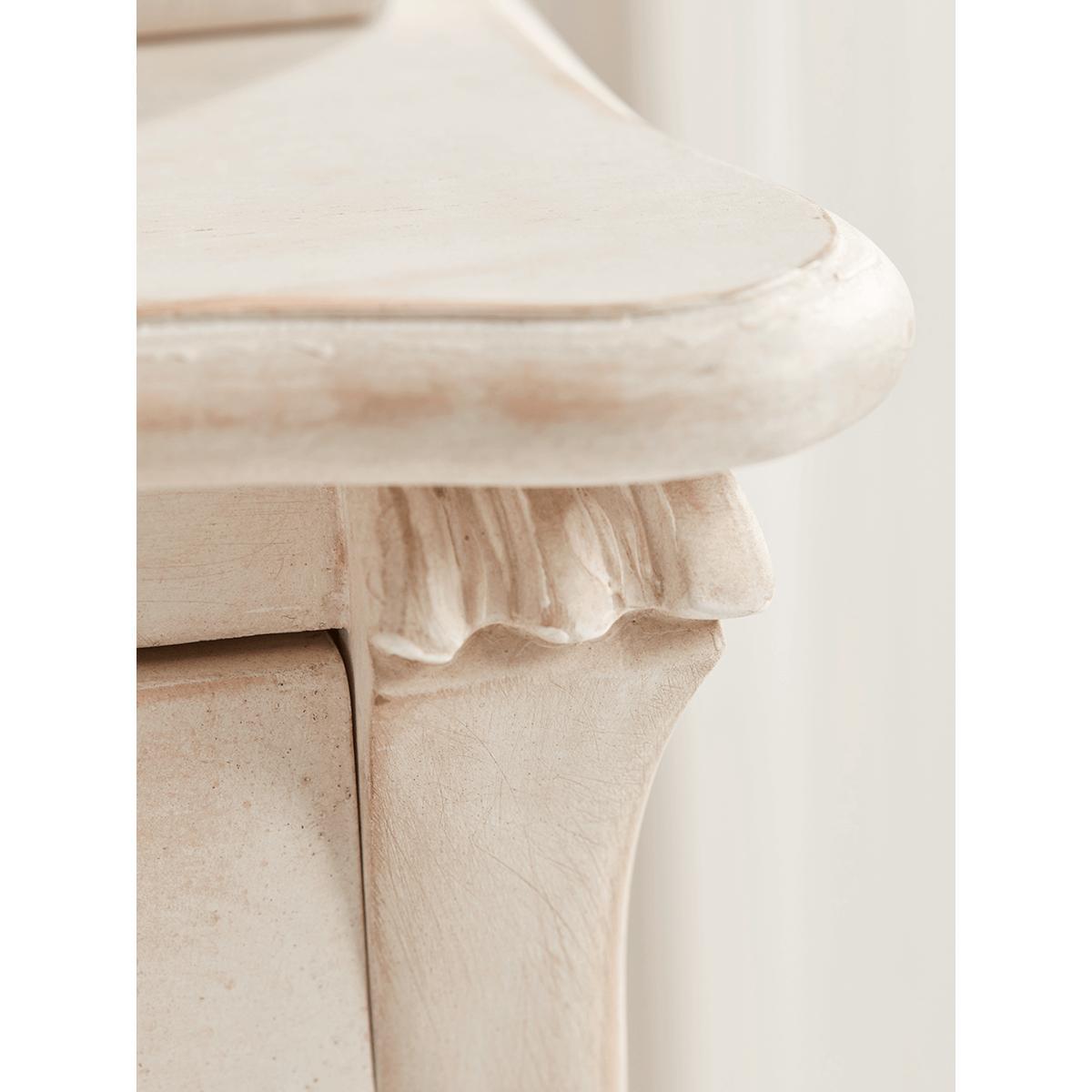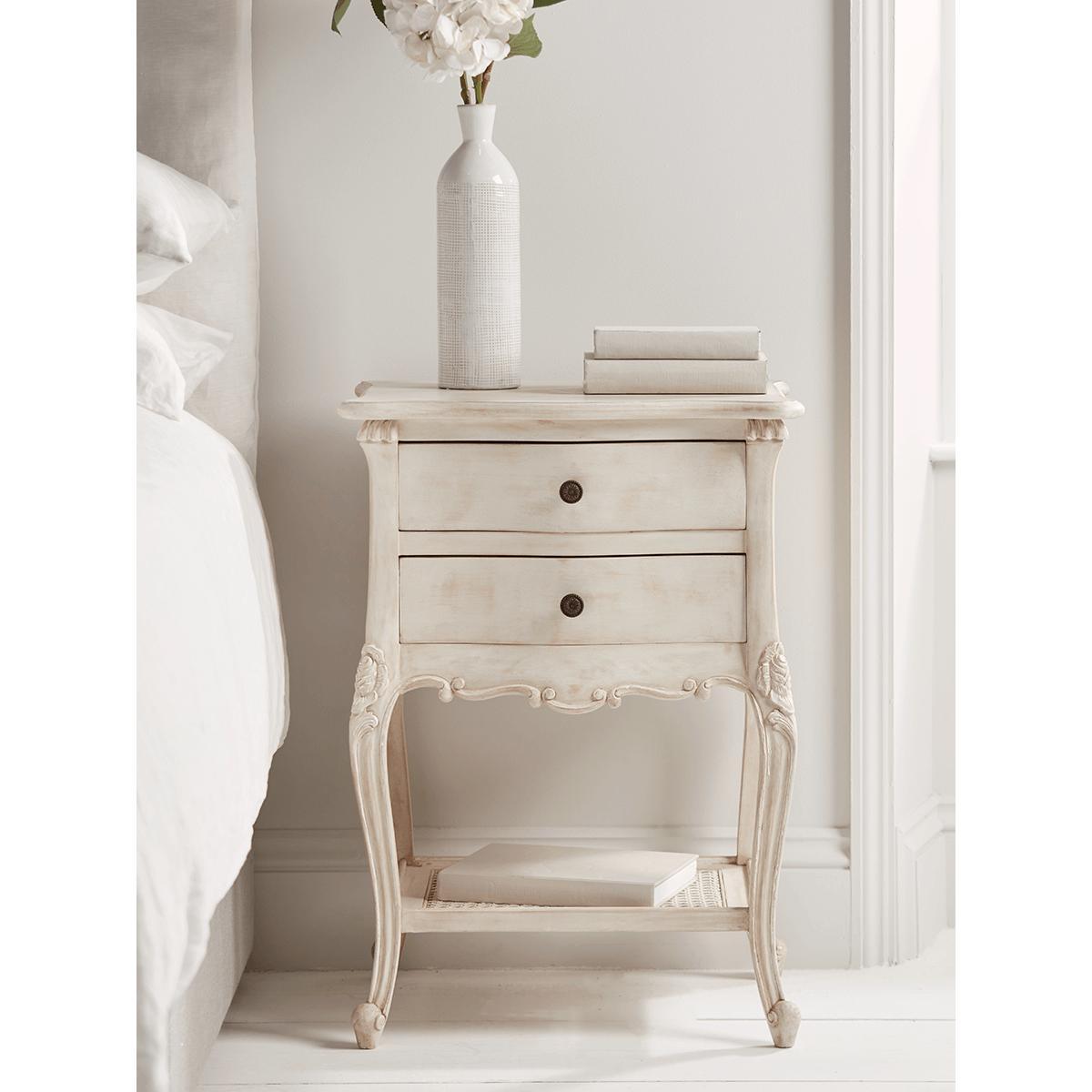 Inspired by French country style and full of the aged charm of a vintage piece, this elegant bedside table is crafted from mahogany with a washed finish for a distinctive look. Two drawers and a lower rattan shelf offer a place to stow bedside accessories whilst the decorative touches featured on each cabriole leg deliver a gentle, romantic touch, just right for the bedroom.