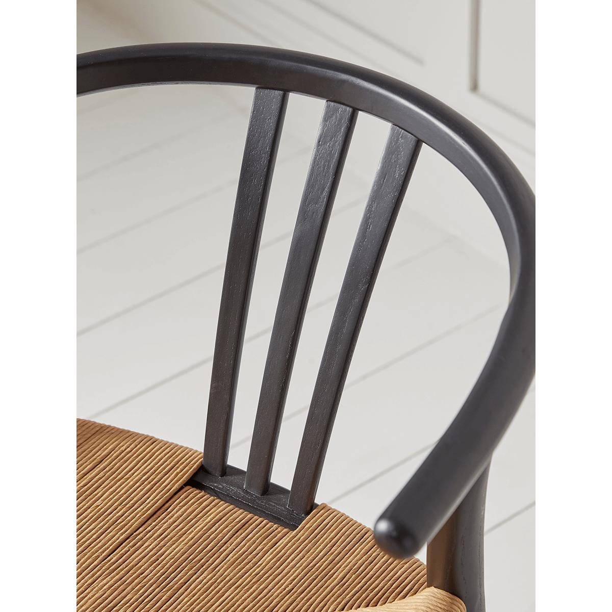 I love these chairs for their sleek black finish and minimalist design, which make them incredibly versatile. They work well in both contemporary and Scandinavian-inspired interiors, especially when paired with natural wood or neutral-toned dining tables. The two-bow back offers good support while adding visual interest, and the woven seat introduces a touch of texture that balances comfort with style. For practical styling tips, consider layering with soft textiles like patterned cushions or placing a statement rug underneath to define the space. These chairs are an excellent choice for those seeking a sophisticated, timeless look that can adapt as your interior style evolves.
