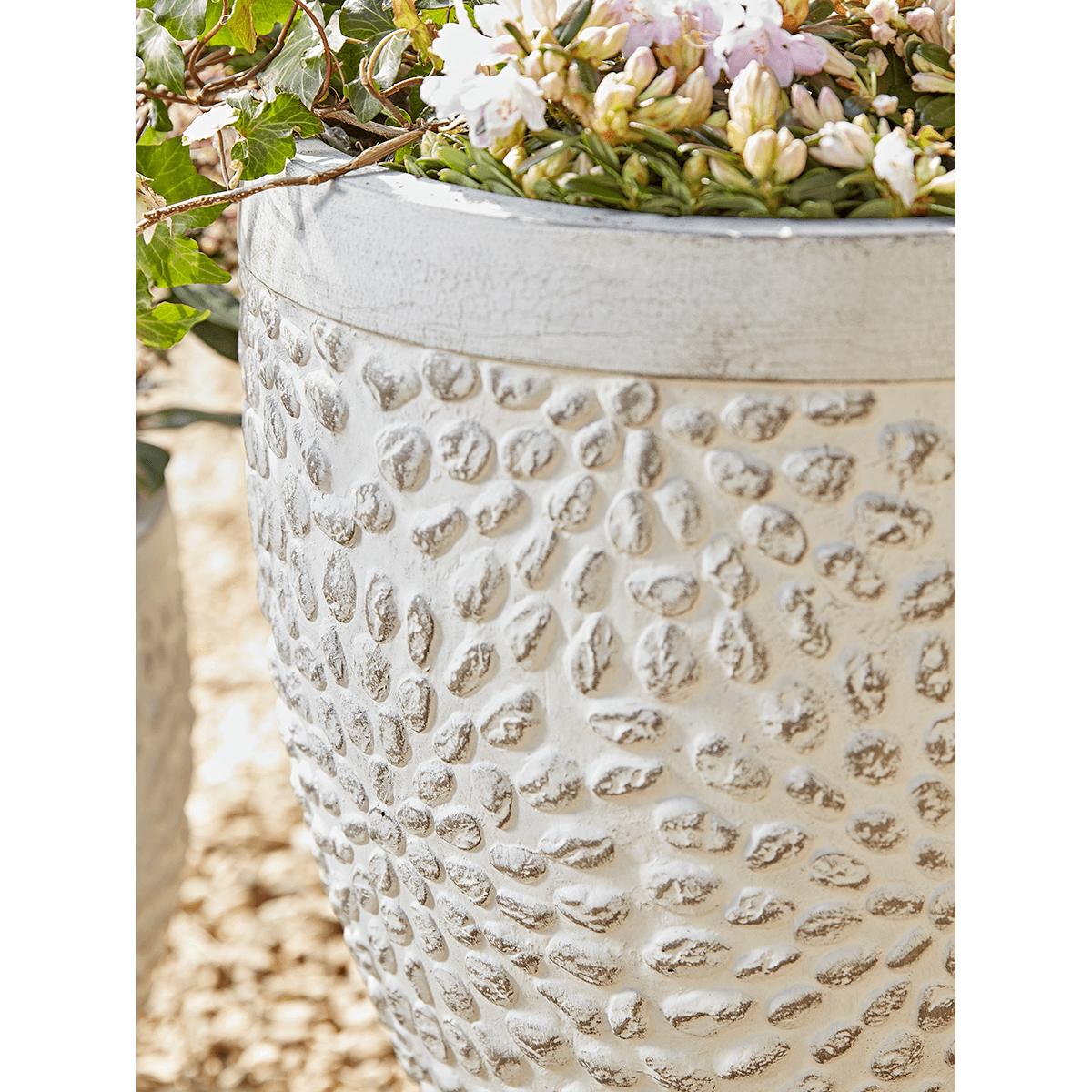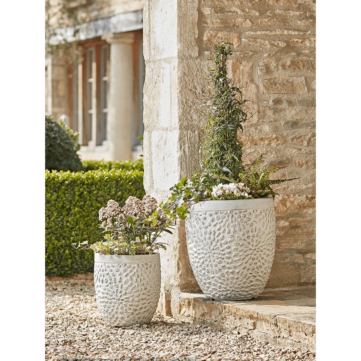 Handcrafted with an embossed pebble mosaic design, this set of two planters will elevate the look of your outdoor space in relaxed style. They will look as stylish on a deck or balcony as they will in larger courtyards or rambling acres, and each set contains one large and one small planter.