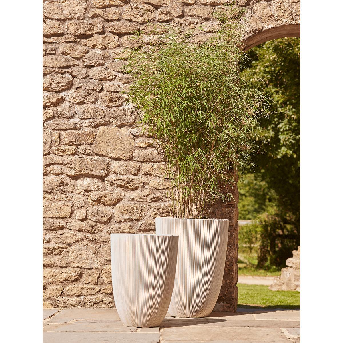There’s a very current edge to this set of planters. With tall fluted sides and narrow reeded detailing on an antiqued white base colour, they will stand out dramatically against lush green lawns or on a gravel drive. Despite their very solid appearance they are actually made from a resilient plastic, meaning they are lightweight and weather and UV resistant. Our set includes one large and one small planter. Perfect for grouping together or placing separately in your. Outdoor living space.