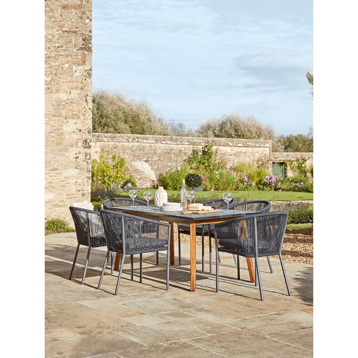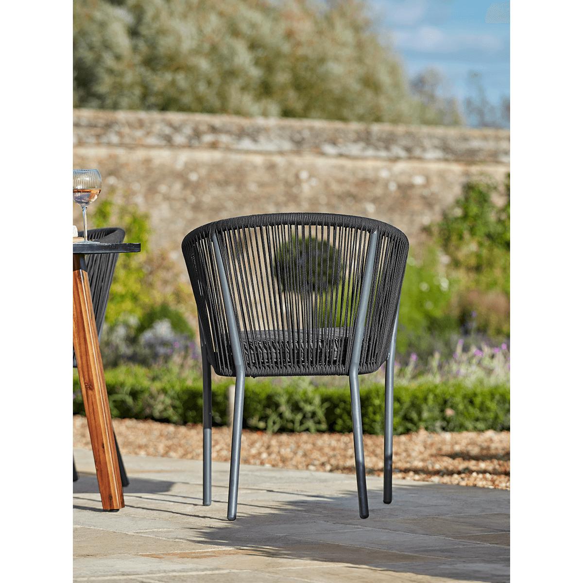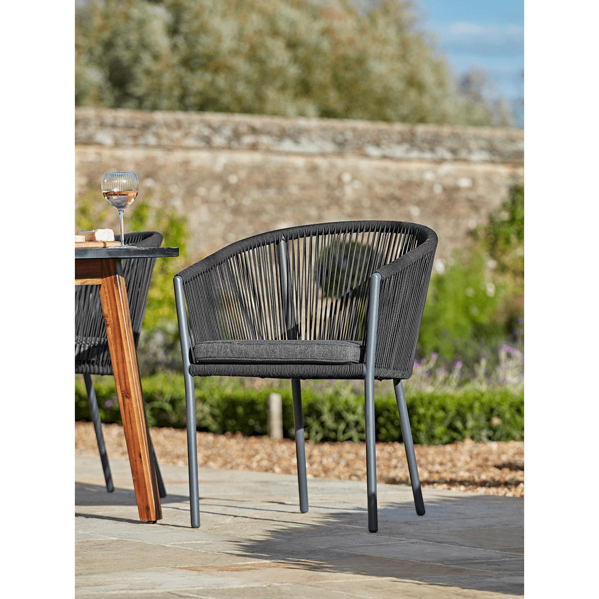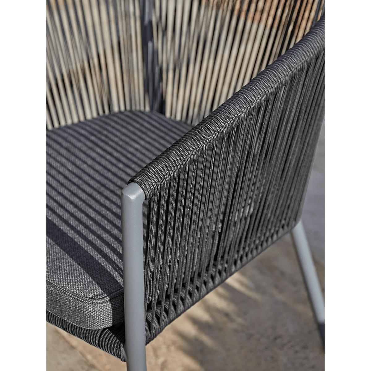 Crafted from water repellent, incredibly strong braided spun polyester rope, our Genoa dining chairs will dress your outdoor space beautifully. The clean lines of the rope construction delivers a contemporary look whilst the open silhouette brings a relaxed tone. Water repellent cushions in a toning shade provide further comfort and these chairs have the additional attraction of being stackable, making them ideal for smaller spaces.