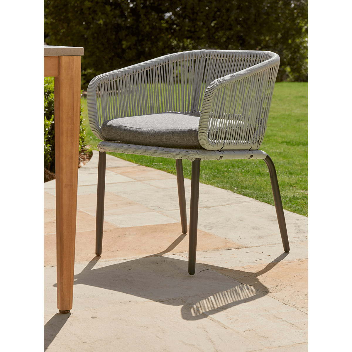 Inspired by the iconic Acapulco chair design and adapted for comfort and style, our pair of grey string dining chairs will make a stylish addition to your outdoor gatherings. Each chair has a rectangular frame wound with grey plastic string and a comfortable grey seat cushion.