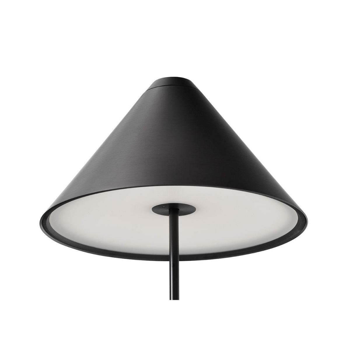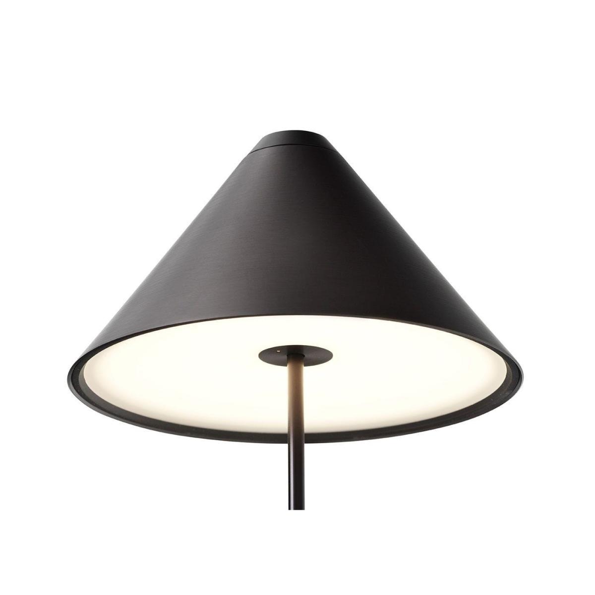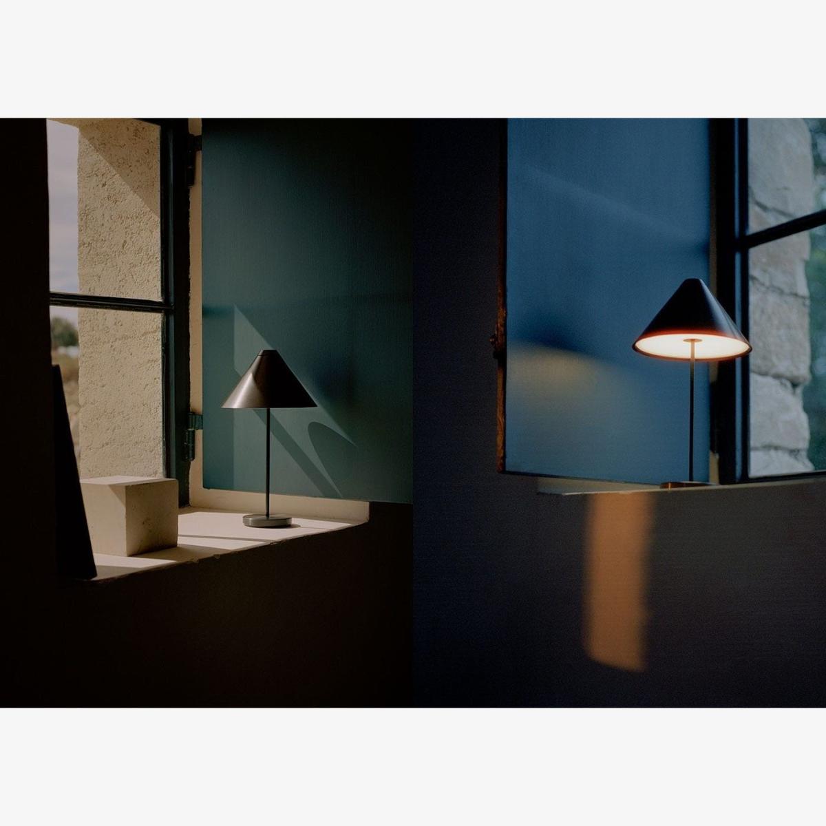 Brolly is a portable table lamp made in brushed steel, which demonstrates the strength of simplistic shapes. Precise and considered, this elegant little light displays the kind of thoughtful, almost deceptive, simplicity that makes it a timeless detail in any interior. Although the design adheres to strict geometry, the lamp attains a finely whimsical presence from the seemingly delicate rod supporting the conical lampshade. The lamp is charged with a magnetic charger, which attaches seamlessly underneath the lamp base, allowing for the light to still be in use while charging. A three-step dimmer switch at the peak of the lampshade is integrated intelligently in the design and makes for straightforward use of the lamp.