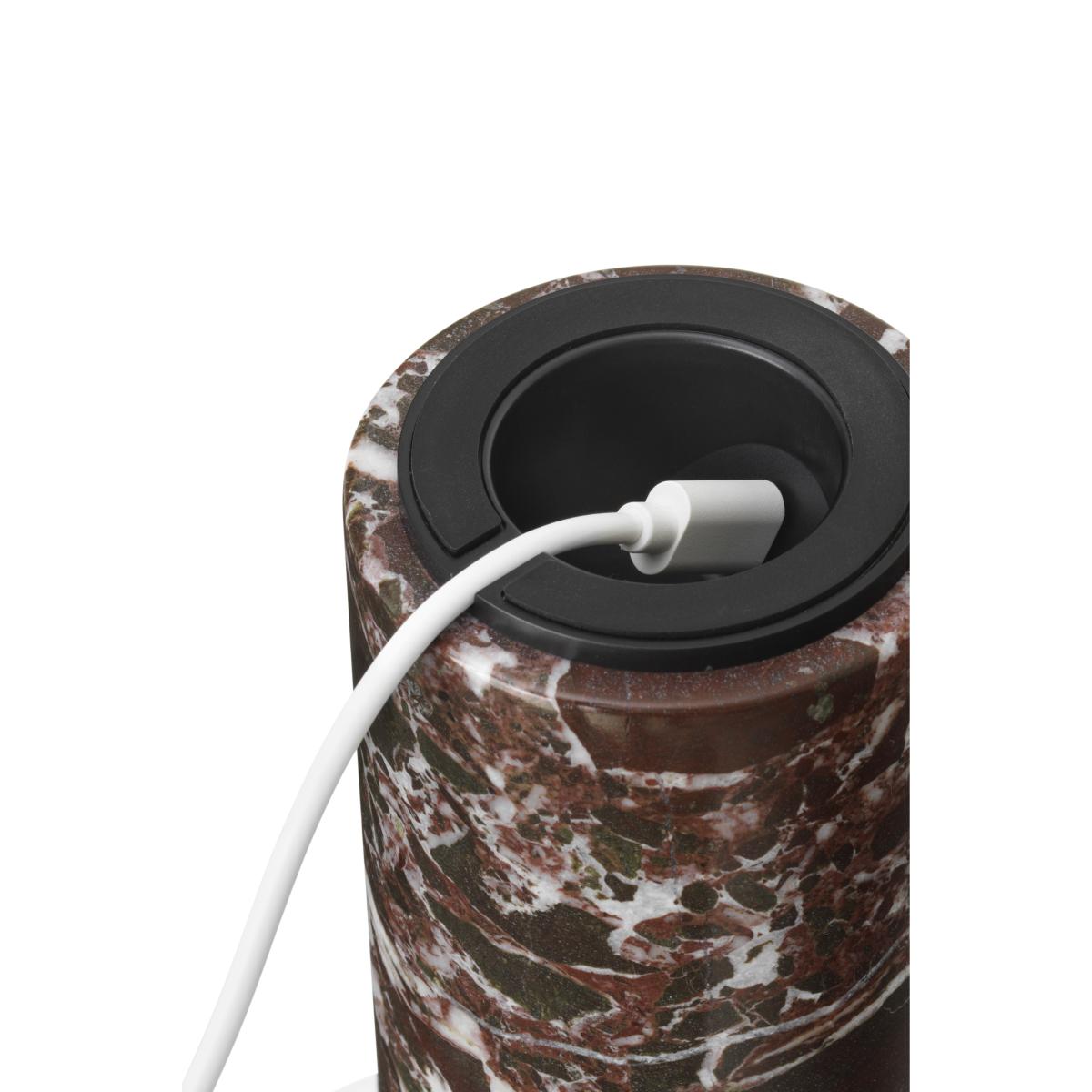 I love this lamp for its modern yet tactile appeal - the combo of the rounded white shade and the textured Rosso Levanto marble base makes it a versatile piece. It works particularly well in contemporary or minimalist interiors, where its sculptural silhouette can be showcased on side tables or desks. Practical styling tips include pairing it with neutral textiles or layered accessories to highlight its sculptural quality, or using it as a statement piece on a bedside table for added visual interest. Its portable nature makes it ideal for creating cosy, flexible lighting that can easily move as your space evolves.