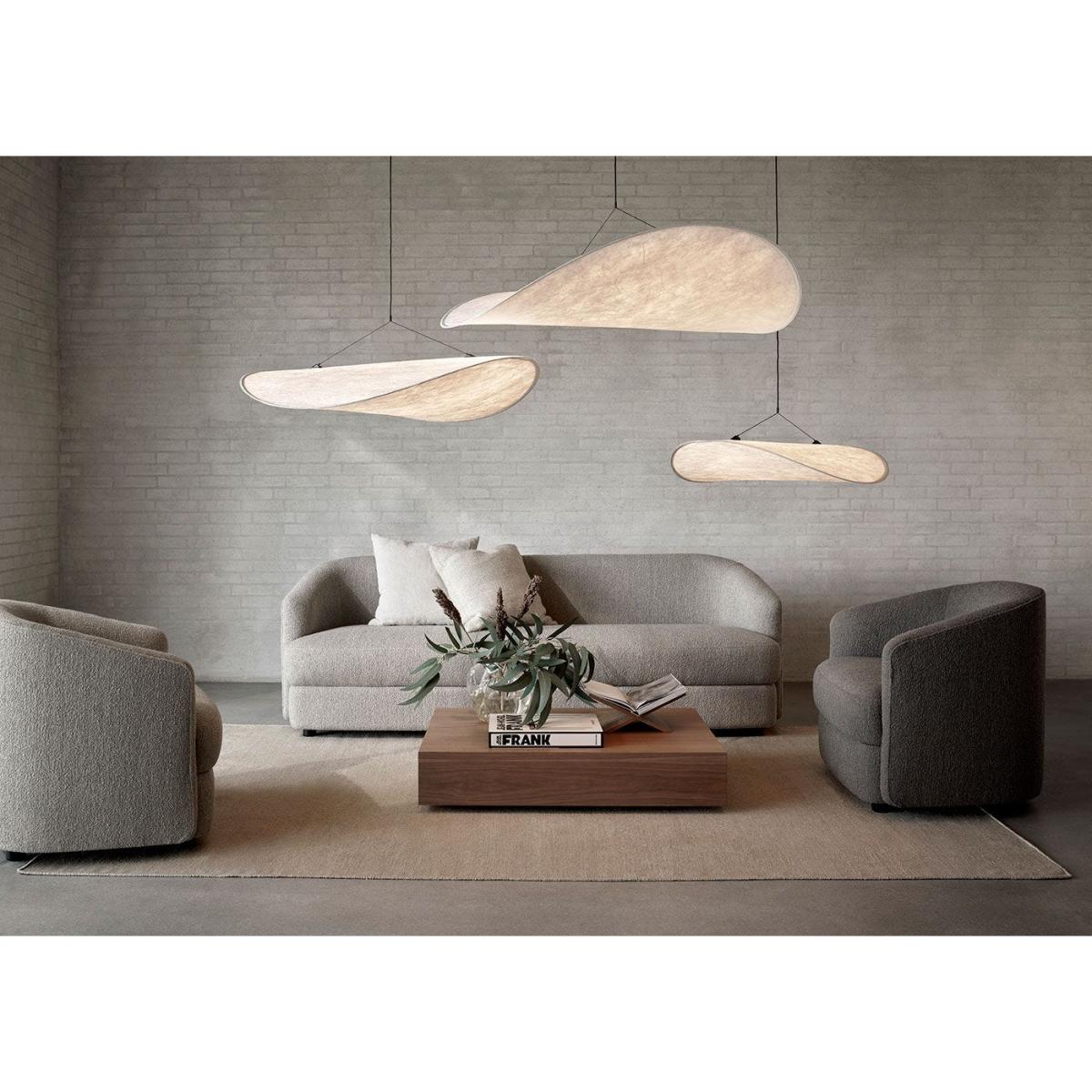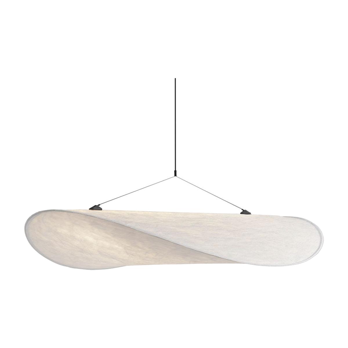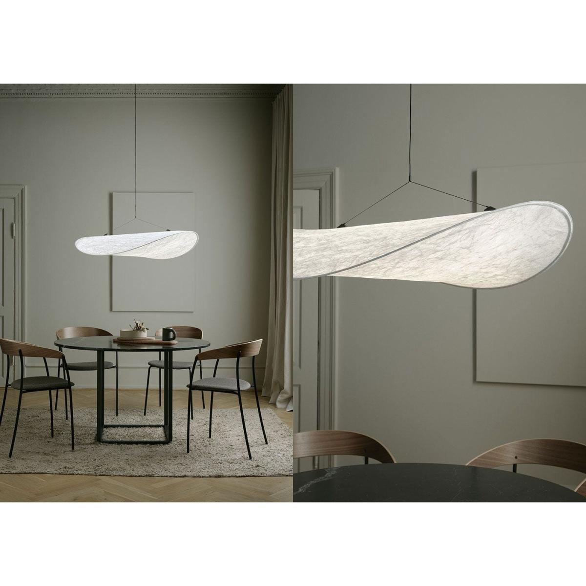 Stretching to over one metre in length, the Tense pendant lamp appears like a soft cloud has floated in. A truly modern construction, its soft Tyvek diffuser represents a material both durable and soft – whilst being 100% recyclable. The flexibility of this paper-like diffuser allows its slim frame to accentuate the cloud like qualities of the Tense pendant lamp. Finished with a slimline LED light source, all components fit into a tube for ease of transport. A truly modern approach to lighting.