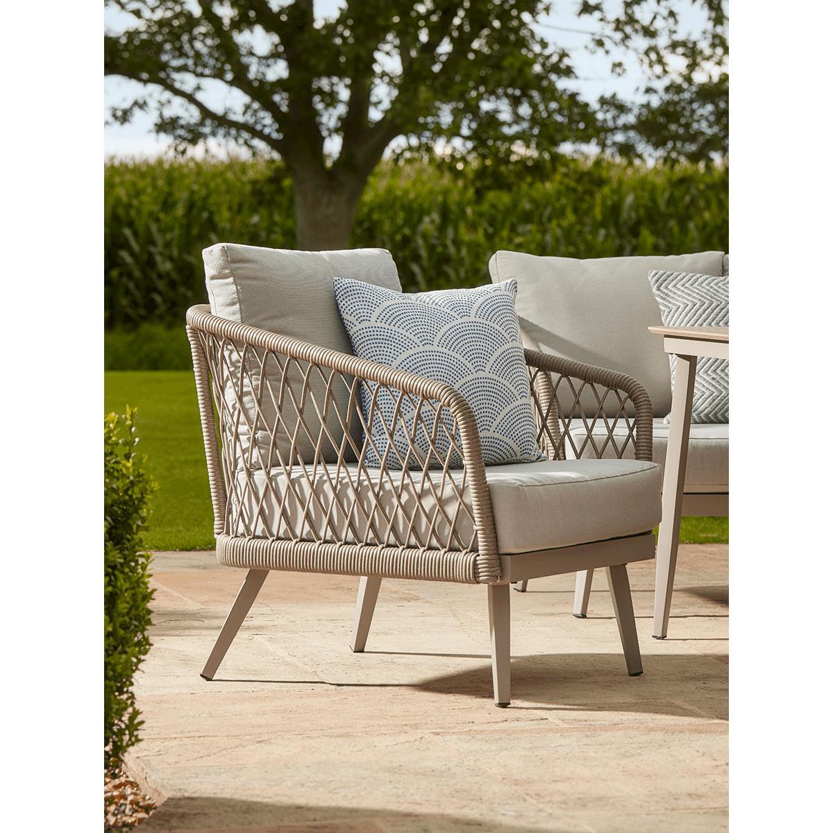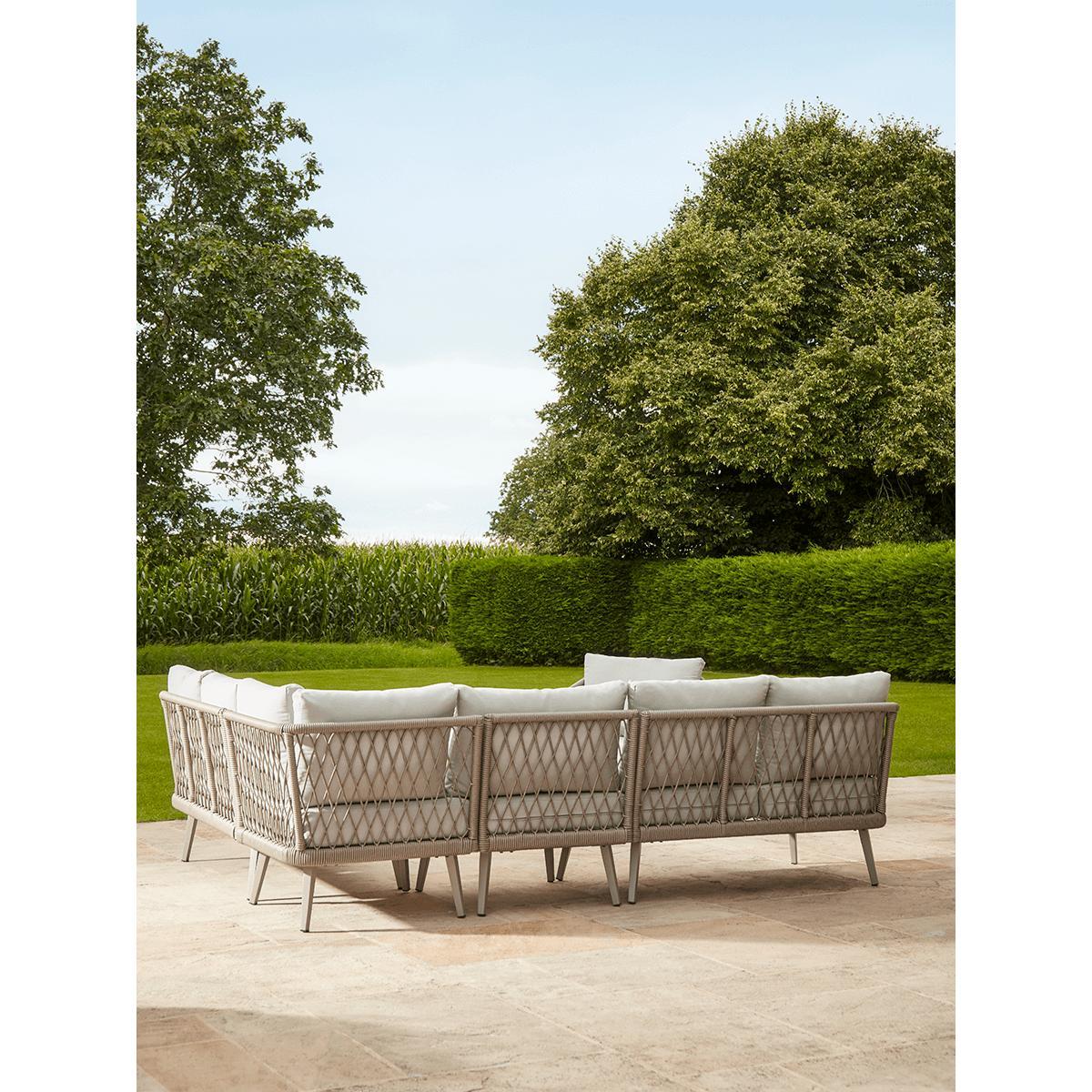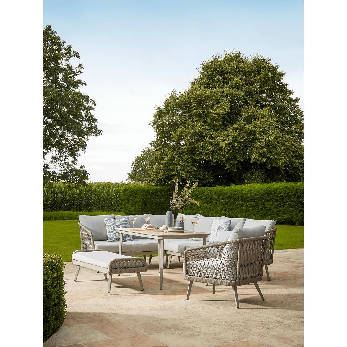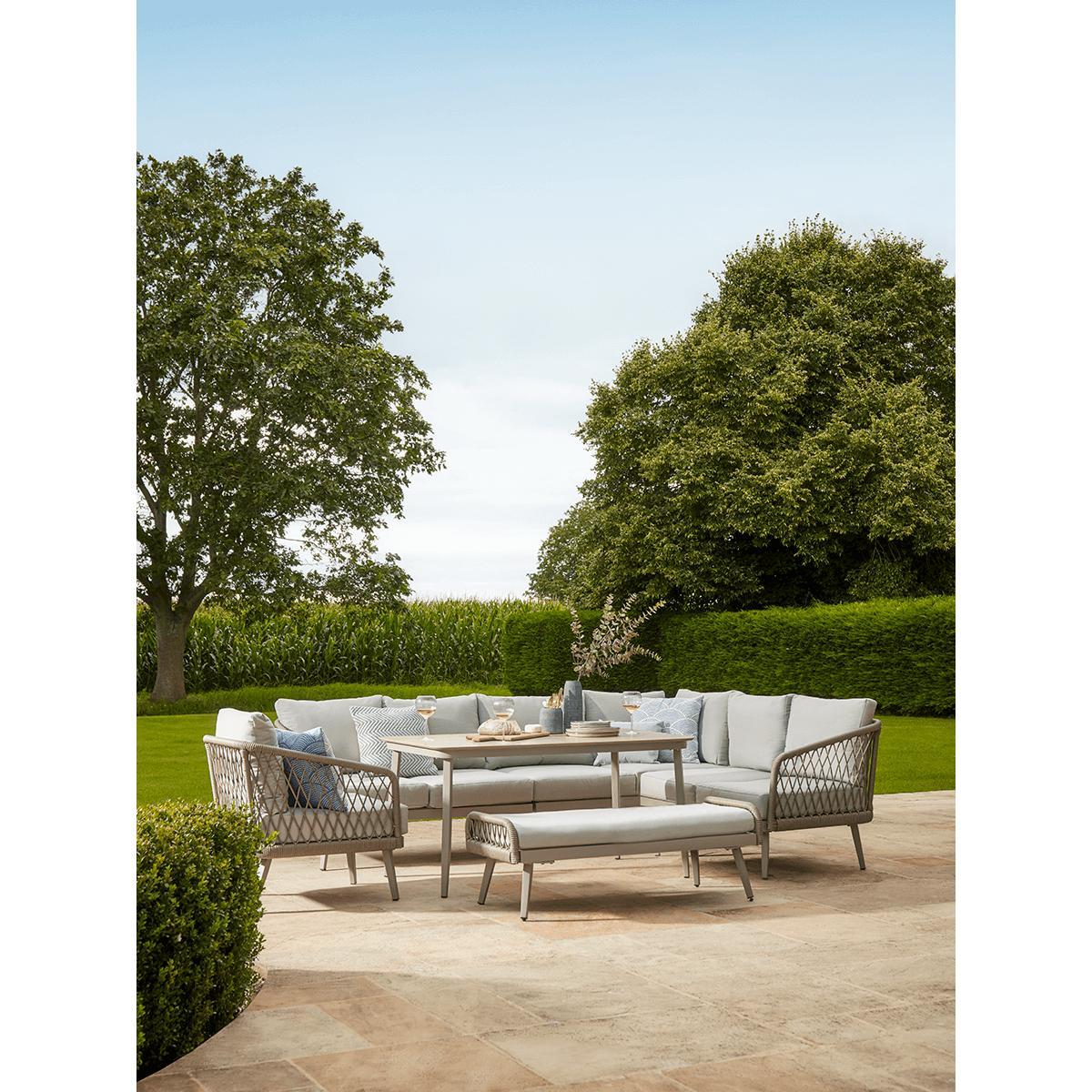 Our Woven Rope. Outdoor furniture. Range features a stunning lattice weave of PE rope which, as well as being convincingly natural looking, is enviably weather proof and long lasting. The corner dining set brings with it all the comfort you would expect from the seating in your indoor living space - deep seat cushions and space to spread out and relax. As well as the corner sofa, this versatile set includes an armchair, a bench and a table. It’s perfect for sociable al fresco dining in any setting.