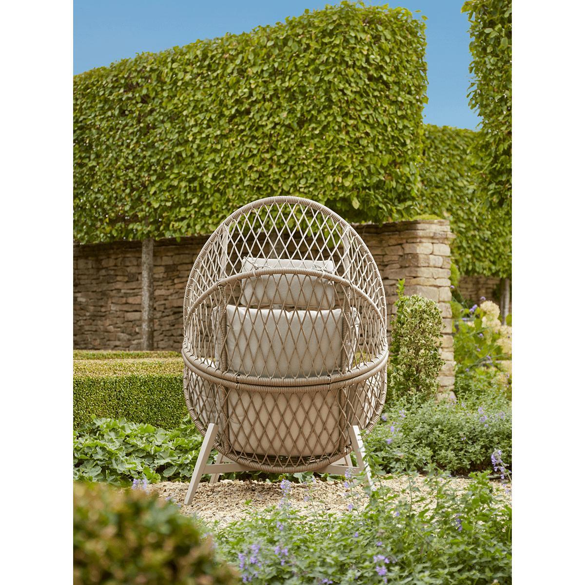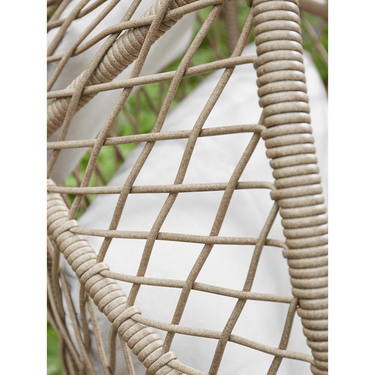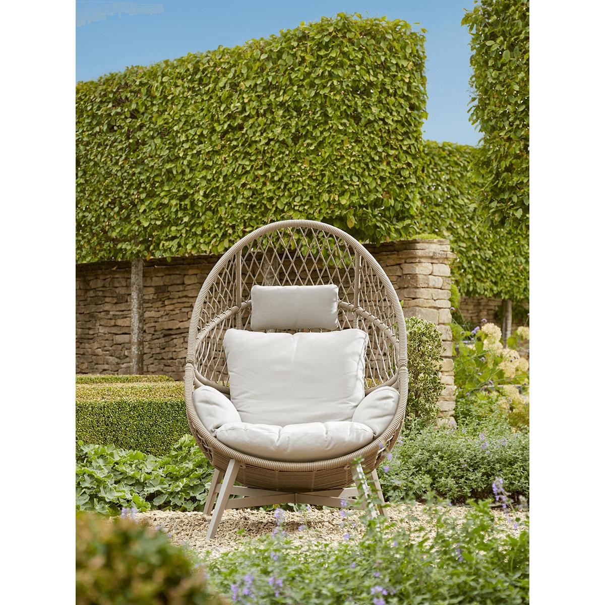 Perfect for lounging and star gazing, the Woven Rope Standing Egg Chair will make a fine addition to the garden. Standing on four legs, the chair has an attractive diamond lattice weave in a soft shade of taupe and is positioned at a slightly tilted angle for maximum relaxation. The seat is woven from a highly practical UV resistant and waterproof PE rope which, along with its powder coated aluminium frame, makes it very long lasting. This seat comes with the cream seat and head cushions pictured, which are water repellent, UV resistant and quick drying.