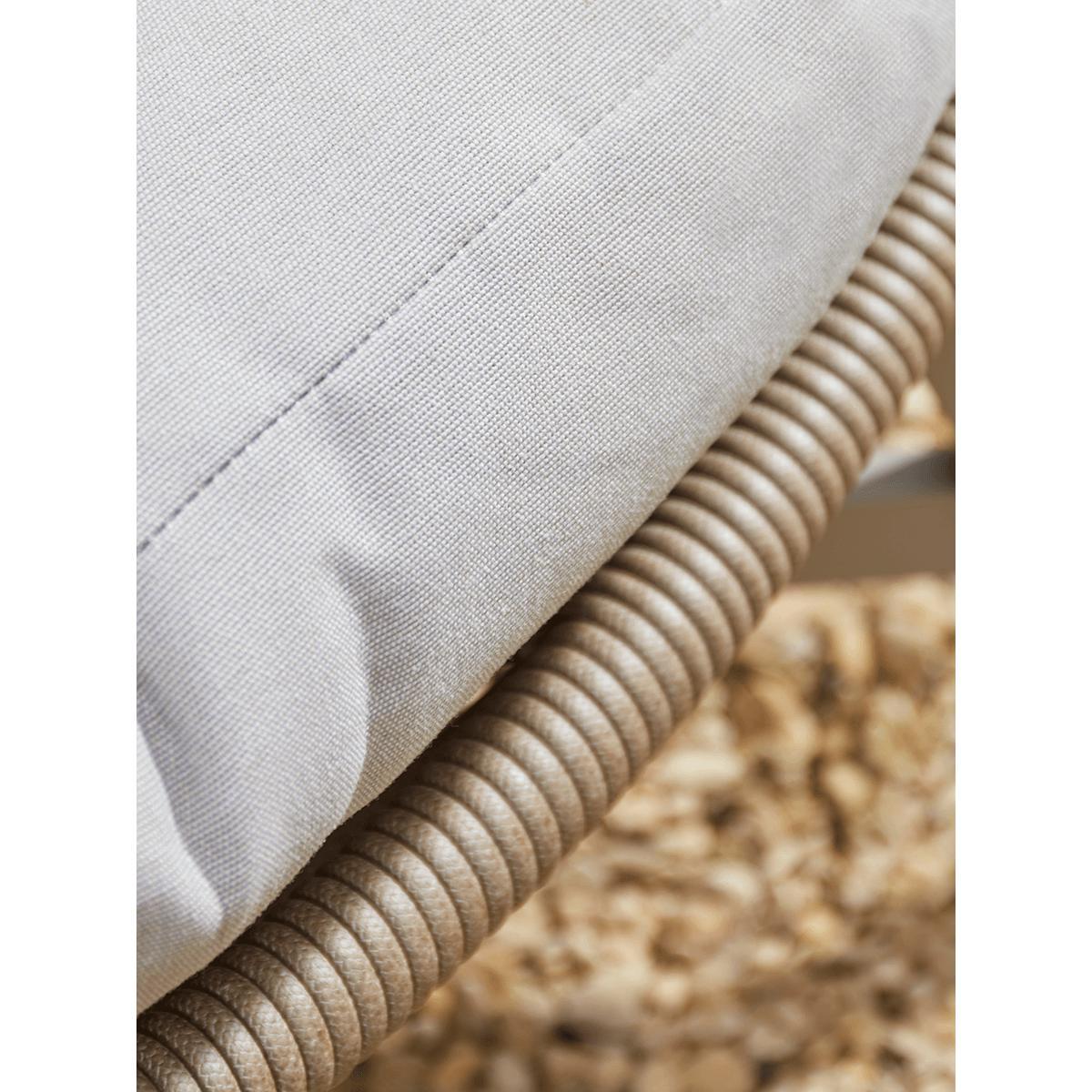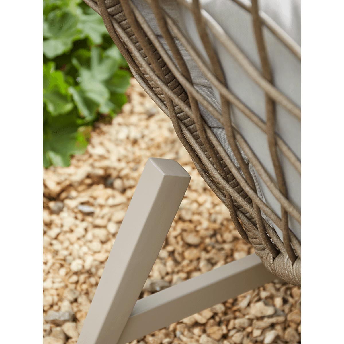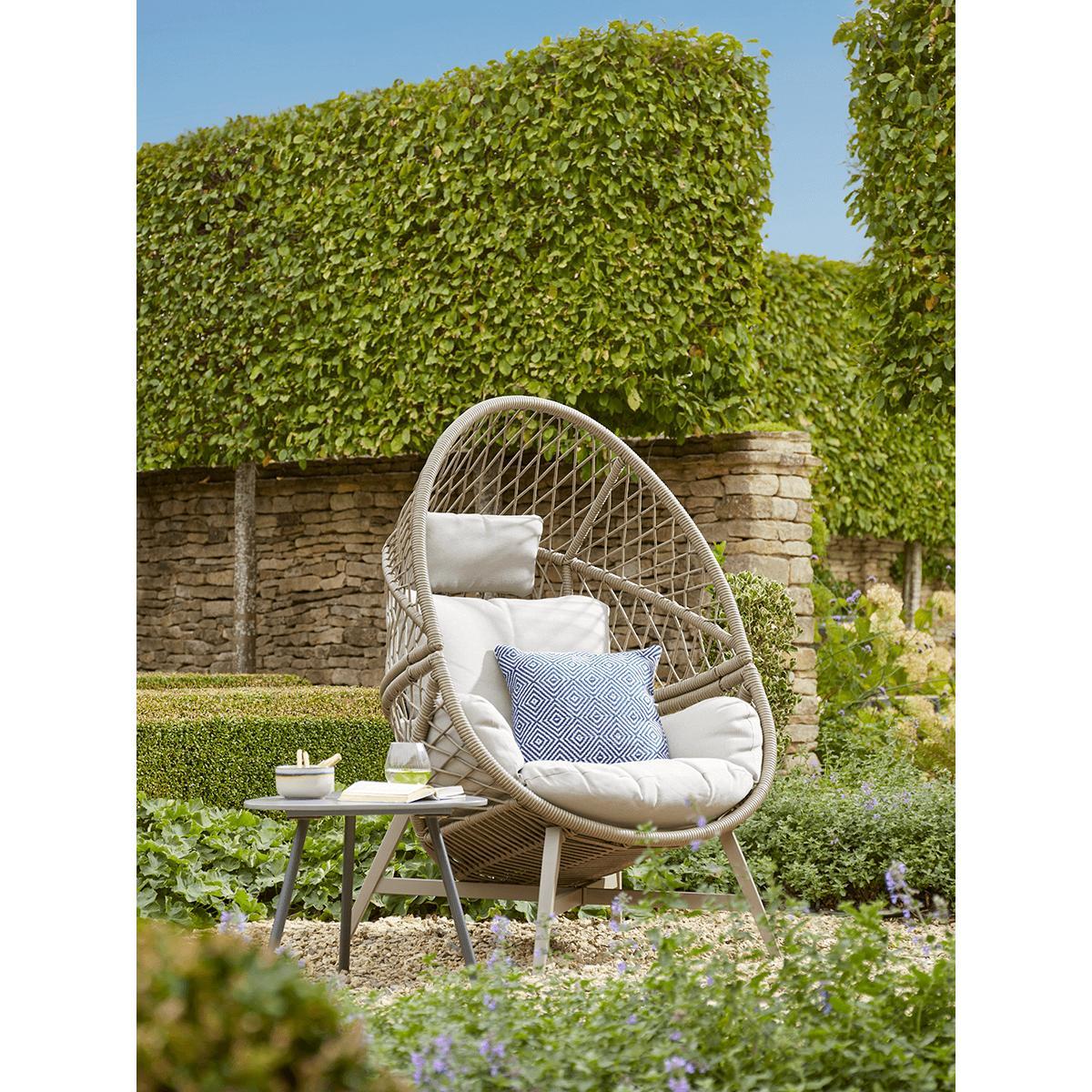 Perfect for lounging and star gazing, the Woven Rope Standing Egg Chair will make a fine addition to the garden. Standing on four legs, the chair has an attractive diamond lattice weave in a soft shade of taupe and is positioned at a slightly tilted angle for maximum relaxation. The seat is woven from a highly practical UV resistant and waterproof PE rope which, along with its powder coated aluminium frame, makes it very long lasting. This seat comes with the cream seat and head cushions pictured, which are water repellent, UV resistant and quick drying.