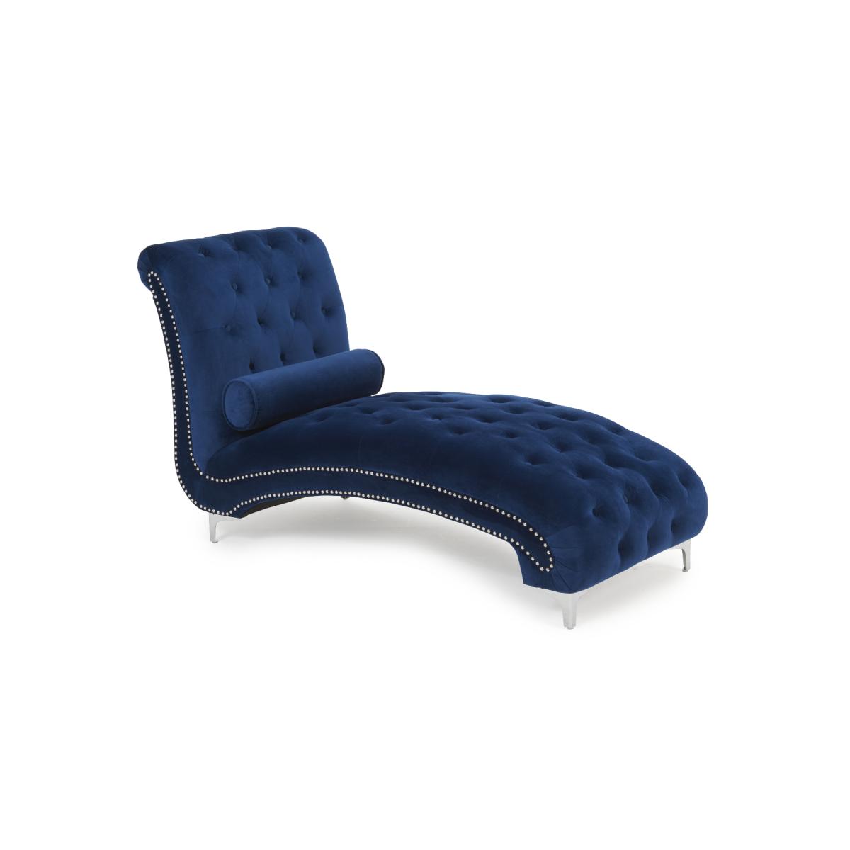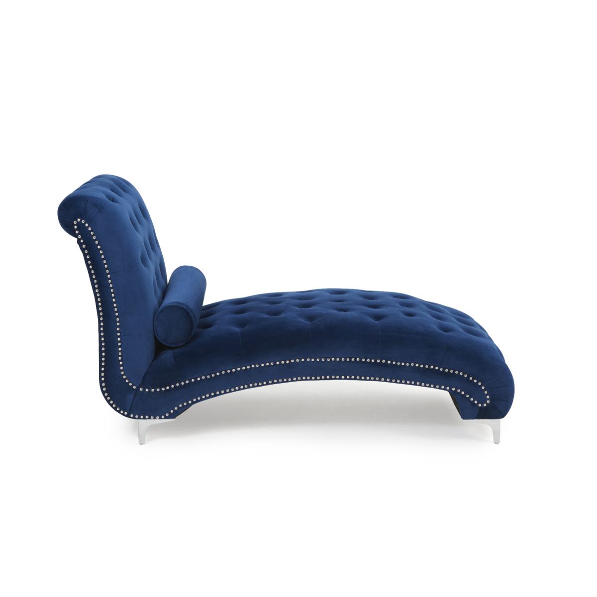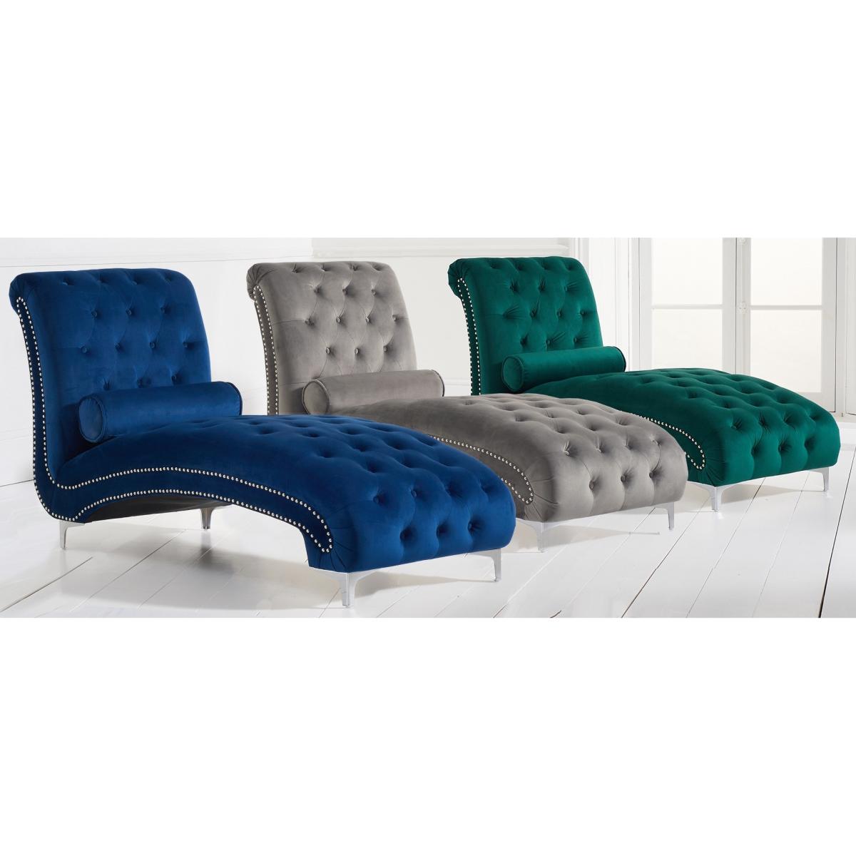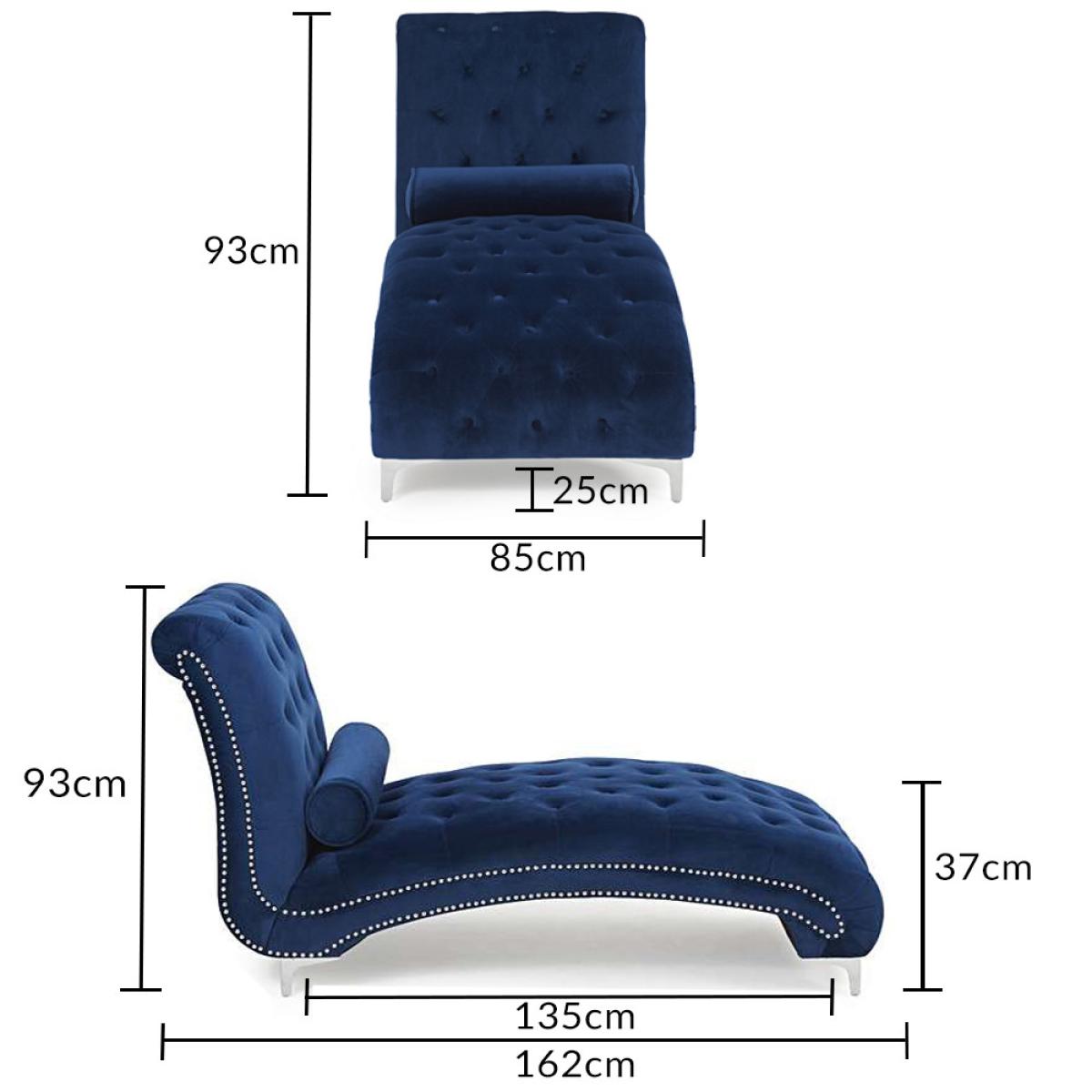 The New York Blue Velvet Chaise Lounge makes a boldly stylish statement in any interior. The classically elegant shape and style of the chaise is offset beautifully by its rich blue velvet upholstery. The design of the chaise is complemented further by deep tufted button detailing and metal studs that run along the edges. Supported by sturdy feet, the blue velvet chaise is complete with a free bolster cushion for additional comfort. The New York Velvet Chaise Lounge is also available in a choice of green or grey.