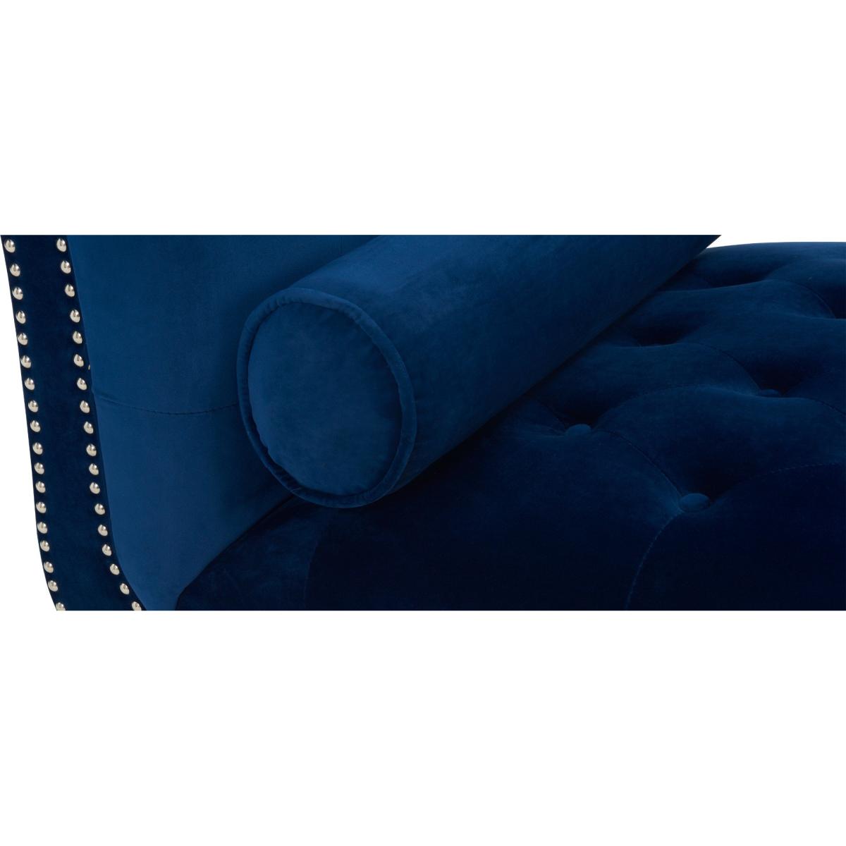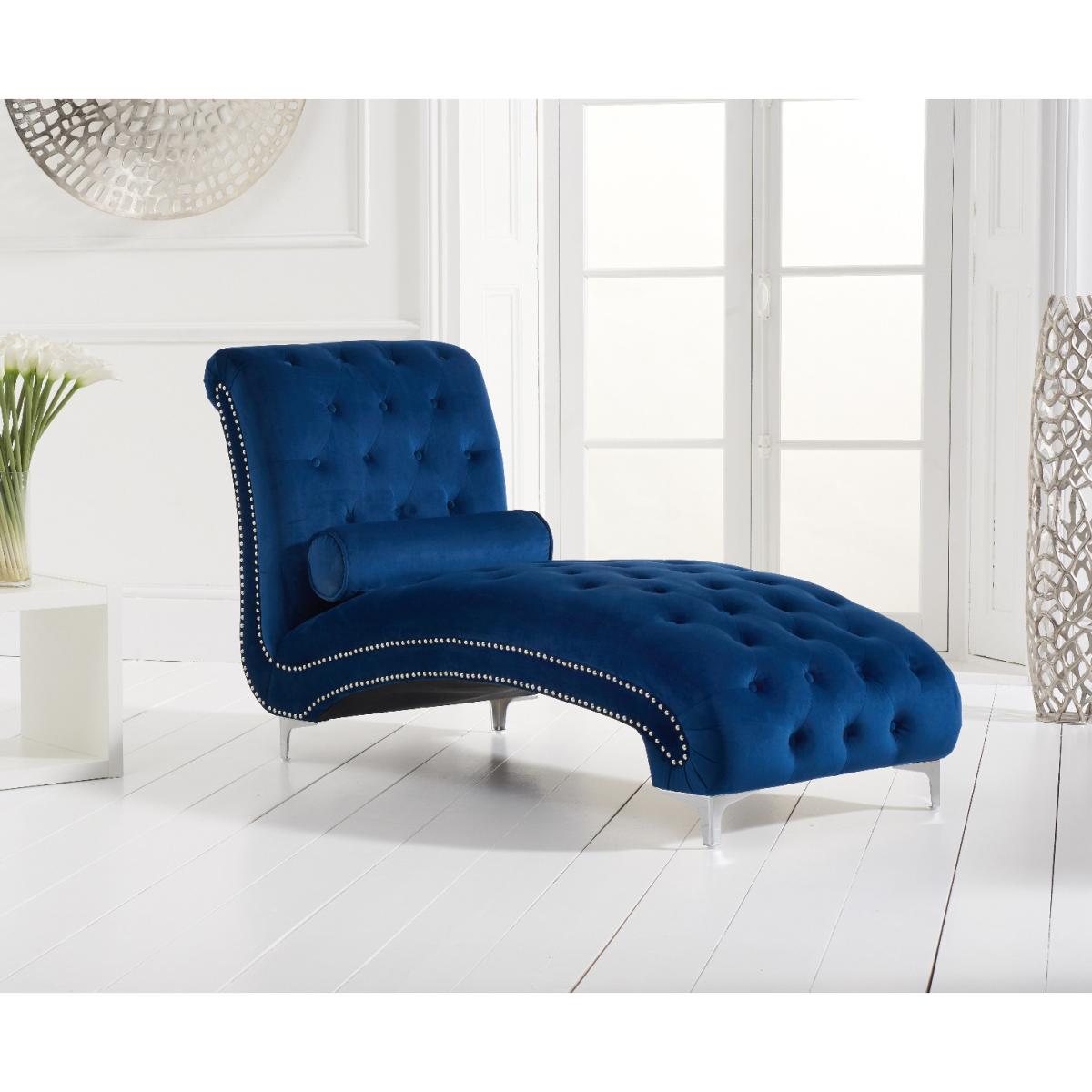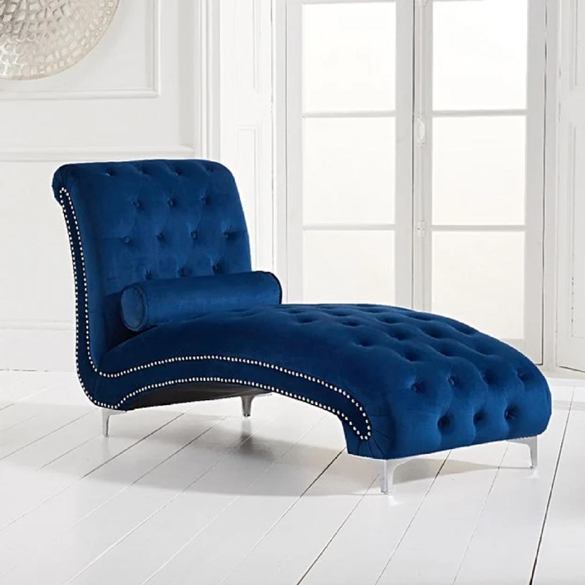 The New York Blue Velvet Chaise Lounge makes a boldly stylish statement in any interior. The classically elegant shape and style of the chaise is offset beautifully by its rich blue velvet upholstery. The design of the chaise is complemented further by deep tufted button detailing and metal studs that run along the edges. Supported by sturdy feet, the blue velvet chaise is complete with a free bolster cushion for additional comfort. The New York Velvet Chaise Lounge is also available in a choice of green or grey.