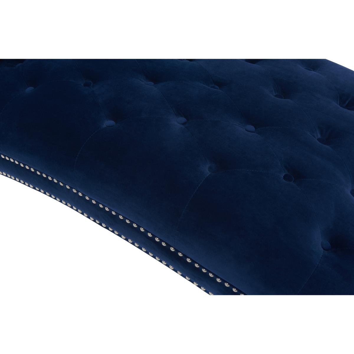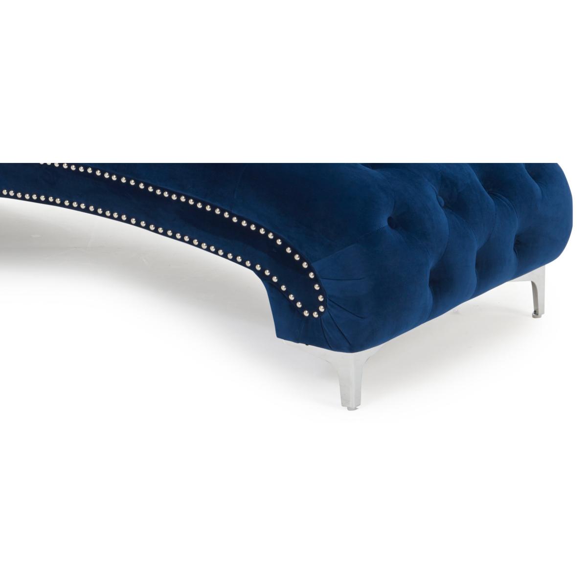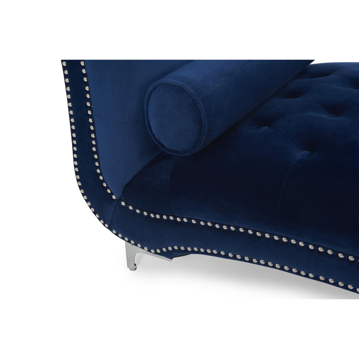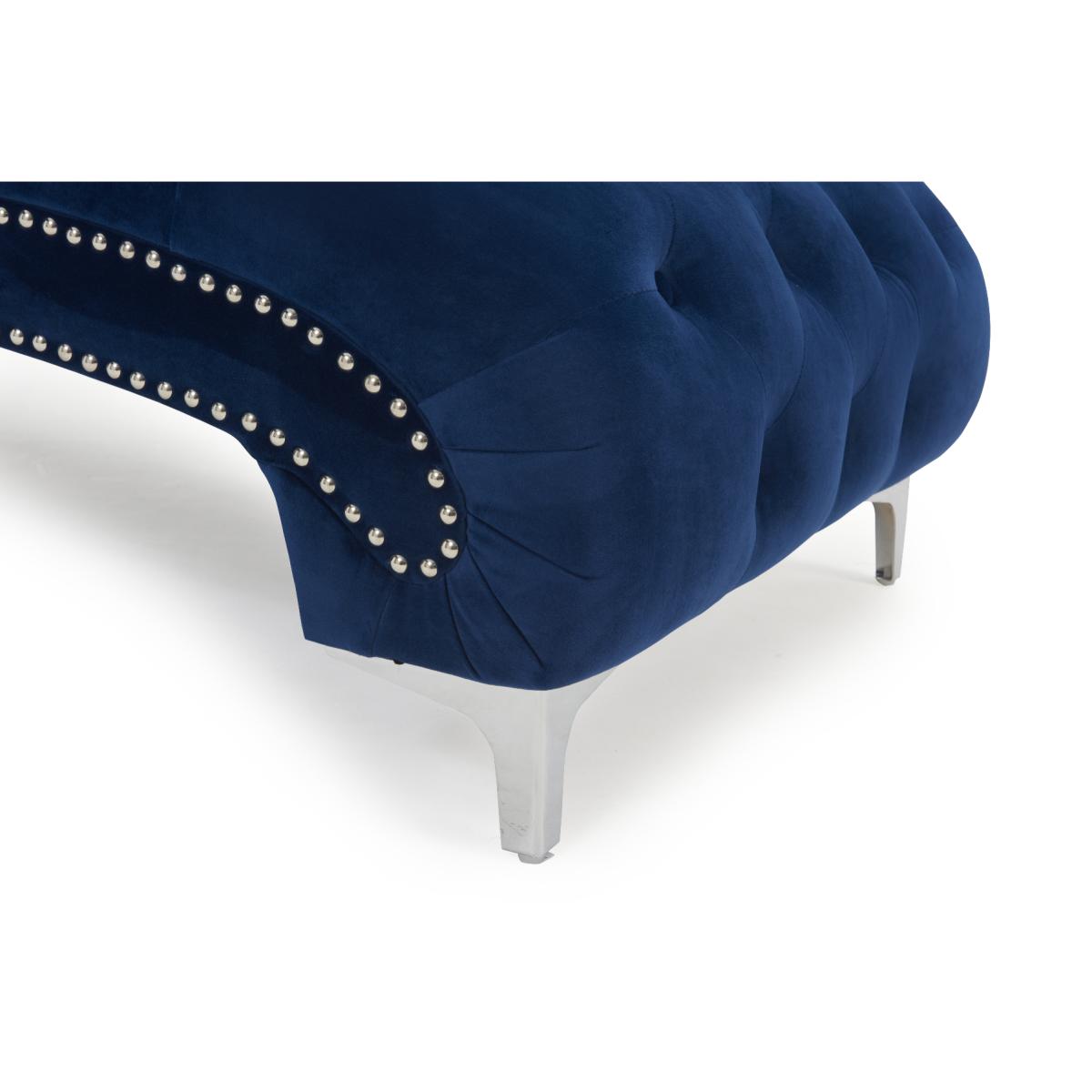 The New York Blue Velvet Chaise Lounge makes a boldly stylish statement in any interior. The classically elegant shape and style of the chaise is offset beautifully by its rich blue velvet upholstery. The design of the chaise is complemented further by deep tufted button detailing and metal studs that run along the edges. Supported by sturdy feet, the blue velvet chaise is complete with a free bolster cushion for additional comfort. The New York Velvet Chaise Lounge is also available in a choice of green or grey.