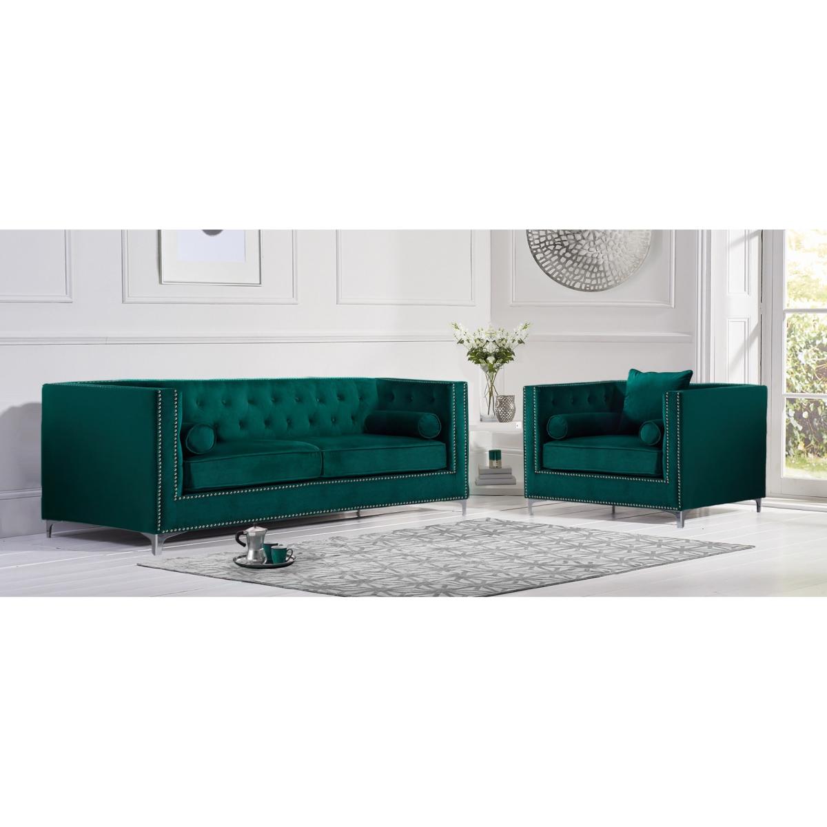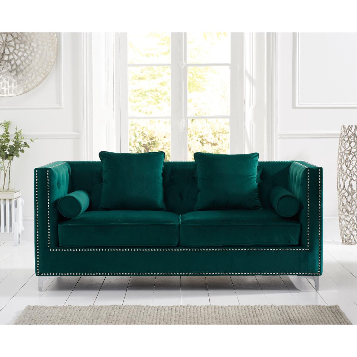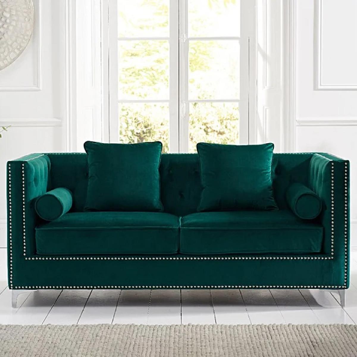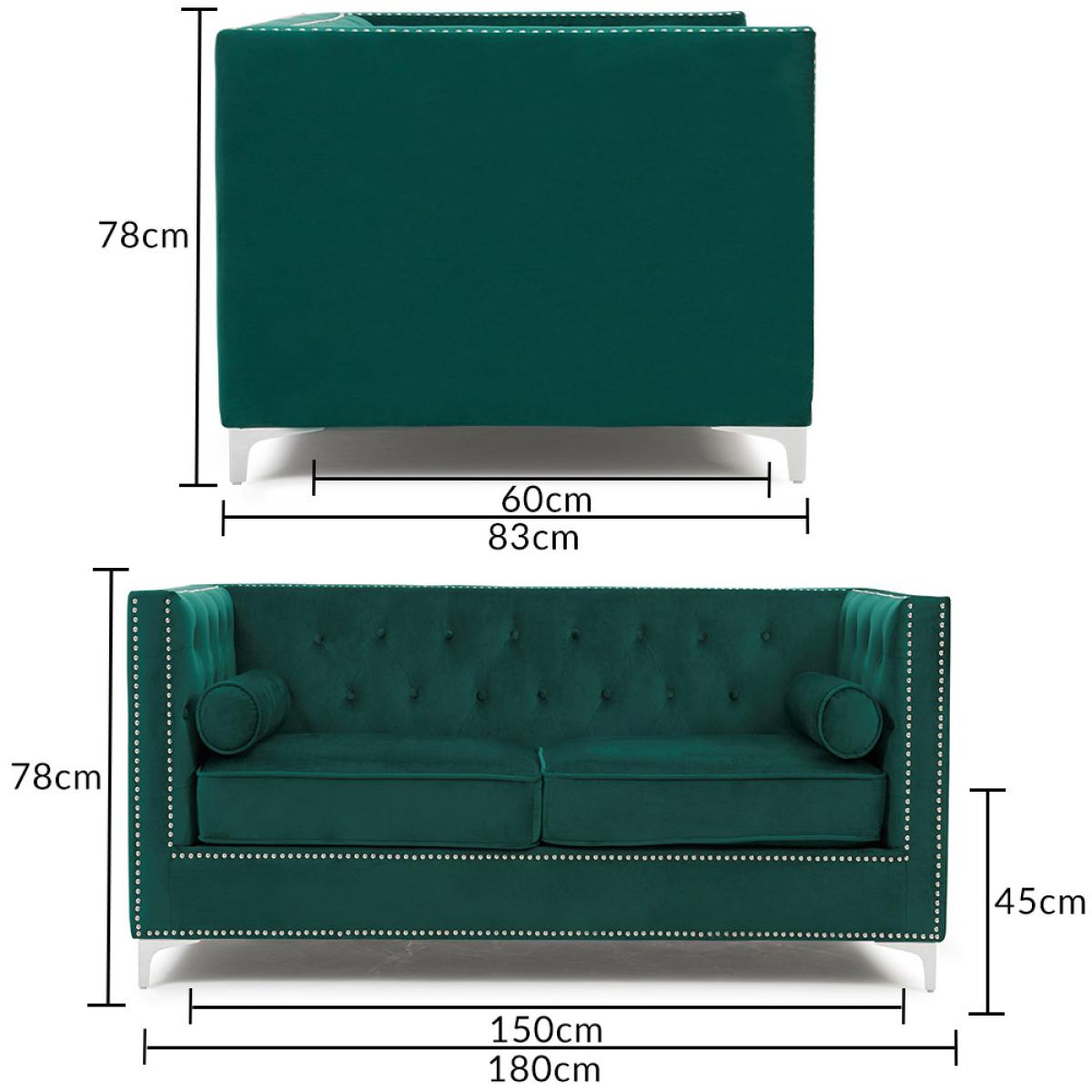 The New York Green Velvet 3 Seater Sofa brings elegance and practicality to any living area. Chic and comfortable, the 3 seater sofa is upholstered in smooth rich green velvet and features a tufted button design on the backrest and inside the armrests. Finishing the look, metal stud detailing runs along the edges of the sofa. Complete with resilient metal feet, the velvet sofa is supplied with 2 free scatter cushions and 2 free bolster cushions.