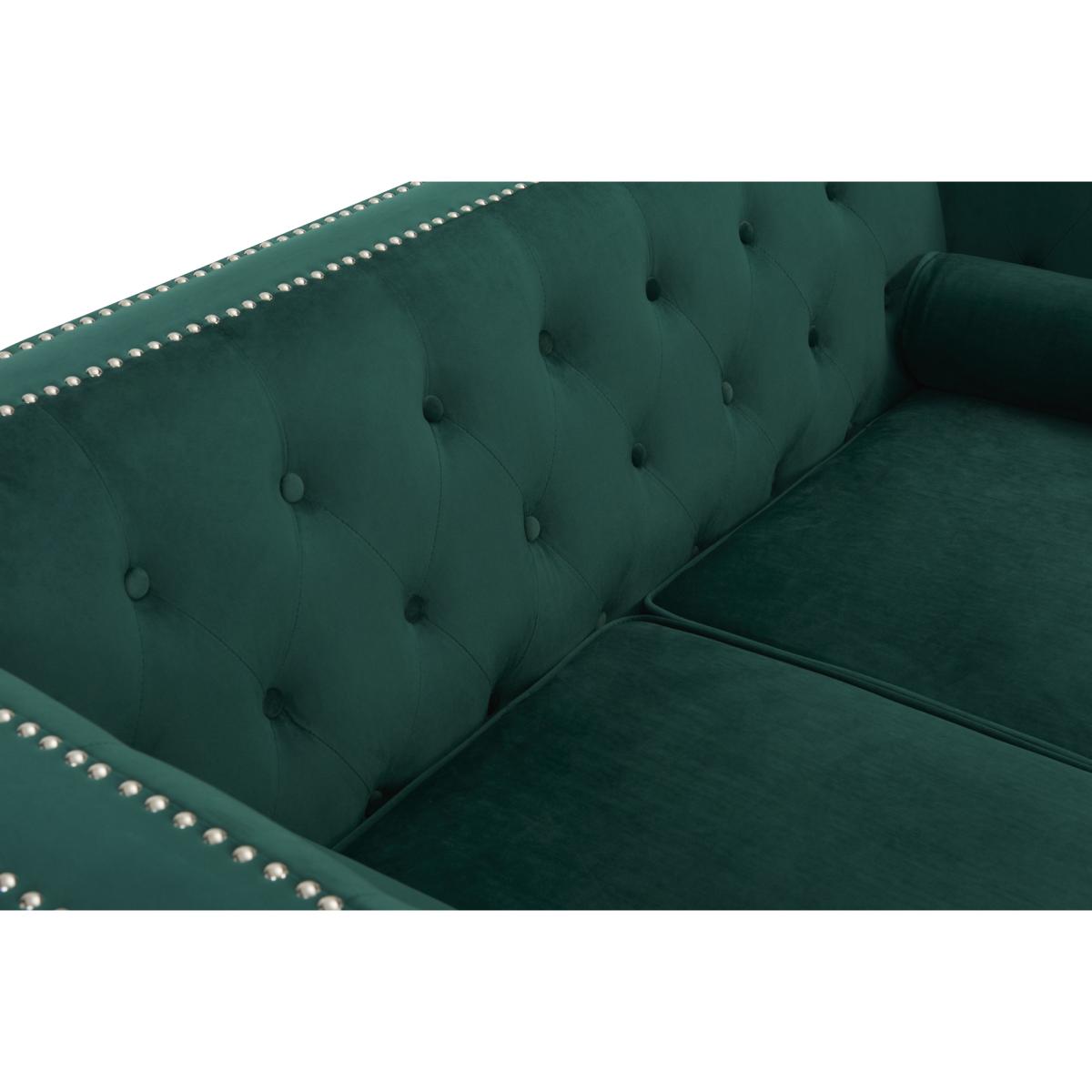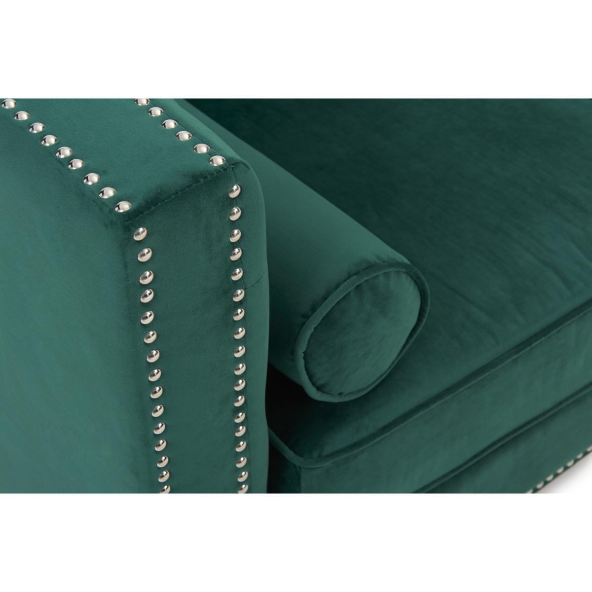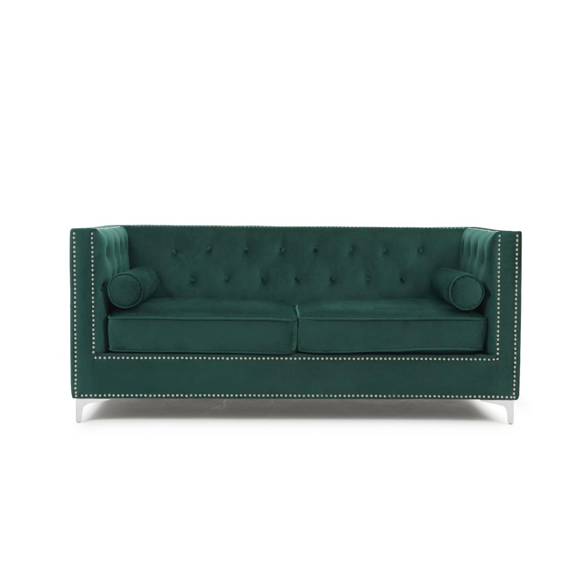 The New York Green Velvet 3 Seater Sofa brings elegance and practicality to any living area. Chic and comfortable, the 3 seater sofa is upholstered in smooth rich green velvet and features a tufted button design on the backrest and inside the armrests. Finishing the look, metal stud detailing runs along the edges of the sofa. Complete with resilient metal feet, the velvet sofa is supplied with 2 free scatter cushions and 2 free bolster cushions.