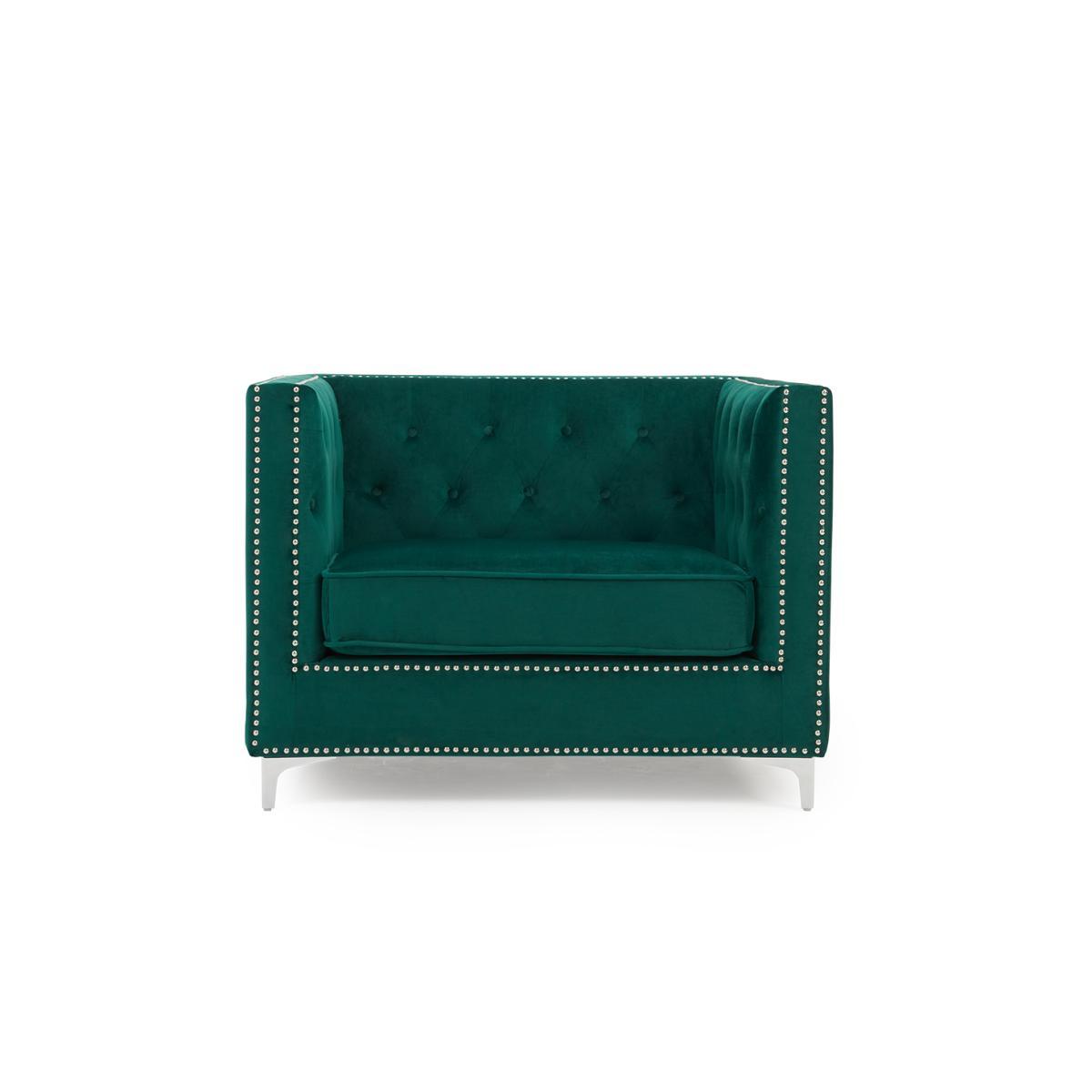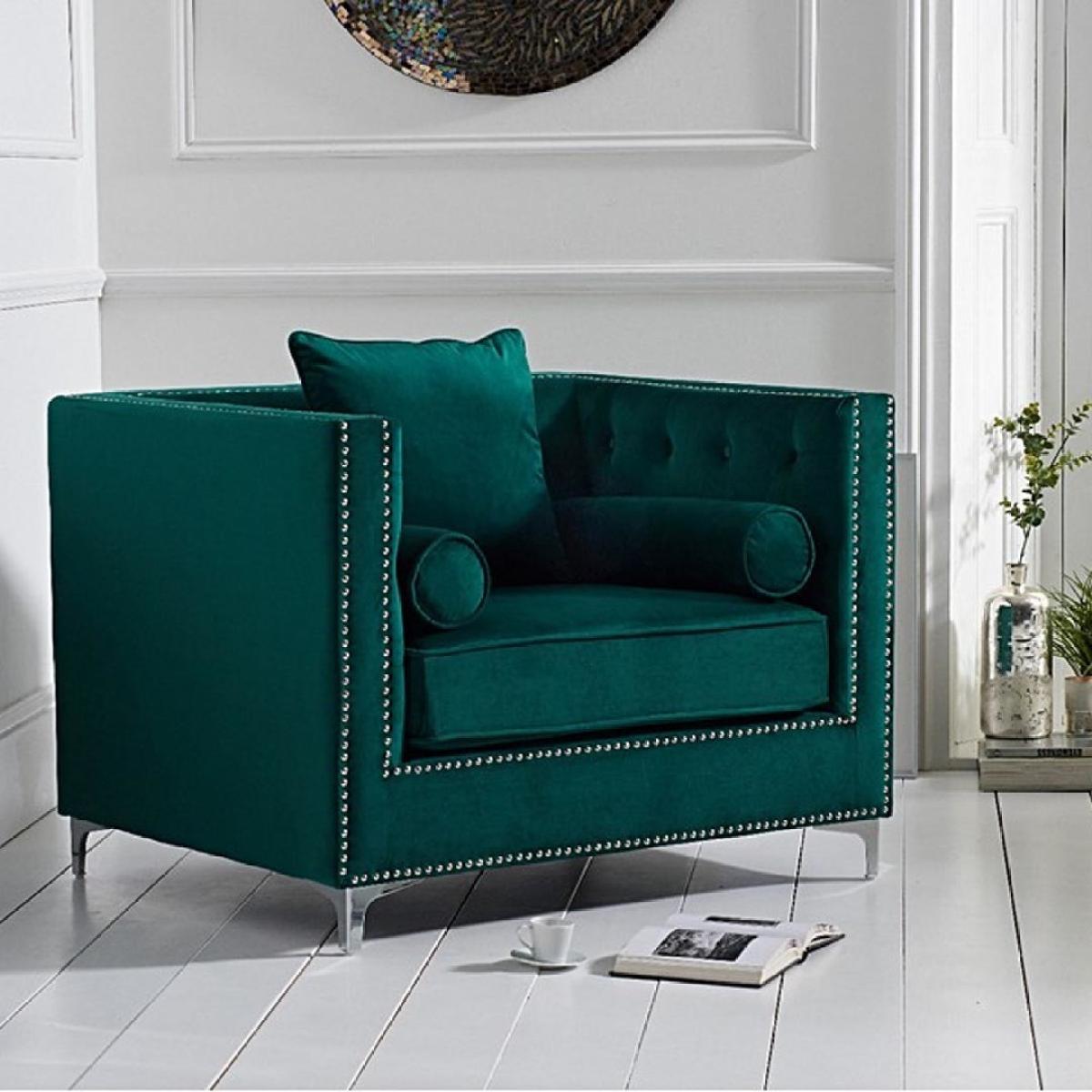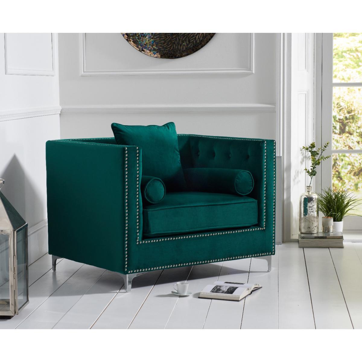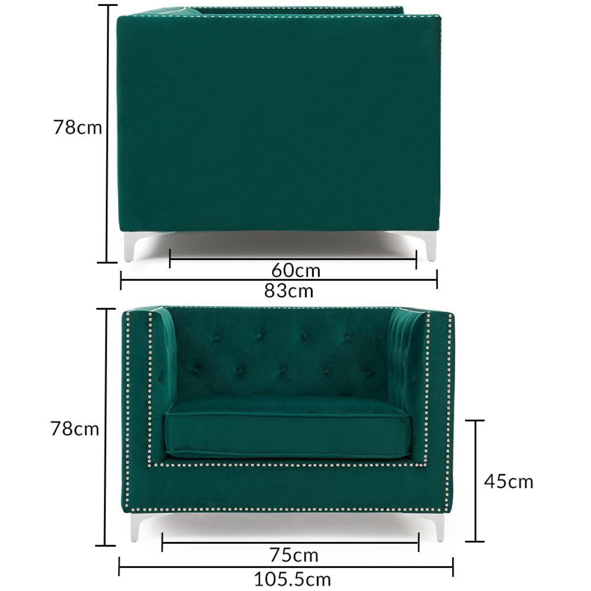 The New York Green Velvet Armchair combines modern and classic design to create a stunning piece of furniture for your living room. Chic and comfortable, the armchair features foam padding and cushioning and soft green velvet upholstery. Featuring a tufted button design on the inside of the armrests, the armchair is complete with metal stud detailing around the edges for the perfect finishing touch. The New York Velvet Armchair is also available in blue or grey and comes complete with 2 free bolster cushions and 1 free scatter cushion.