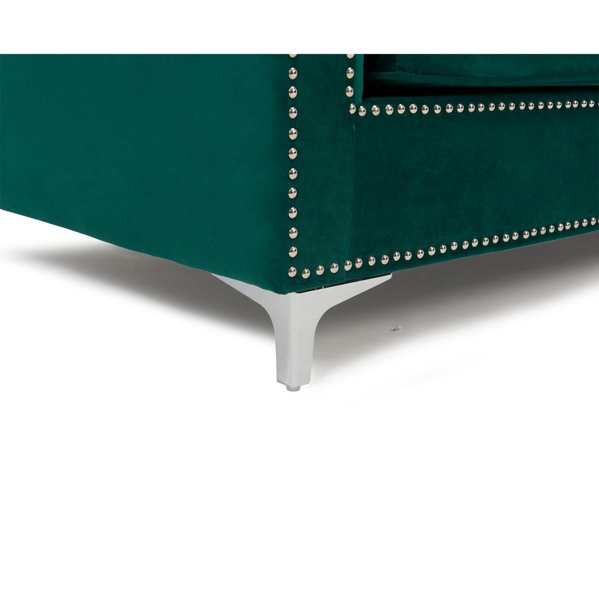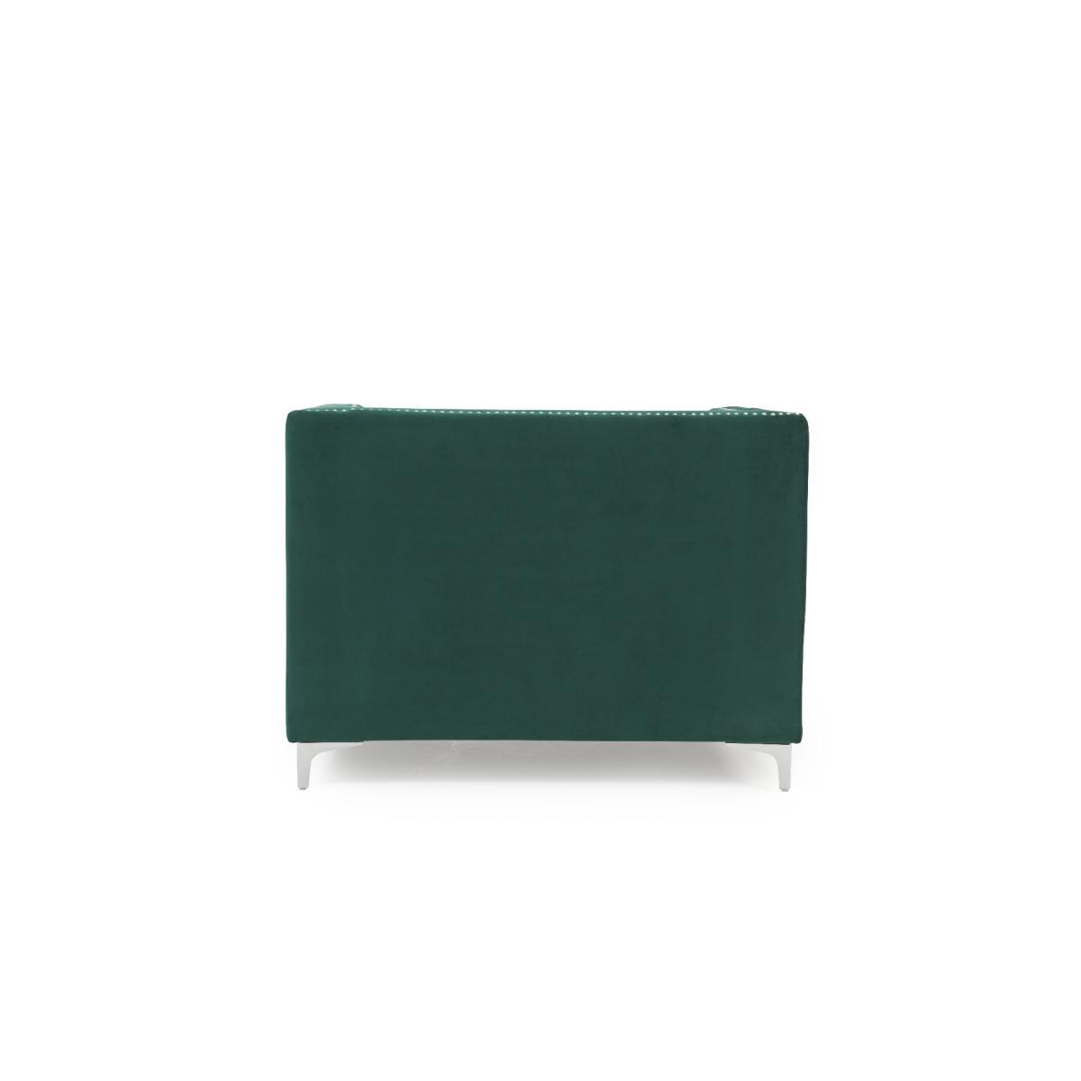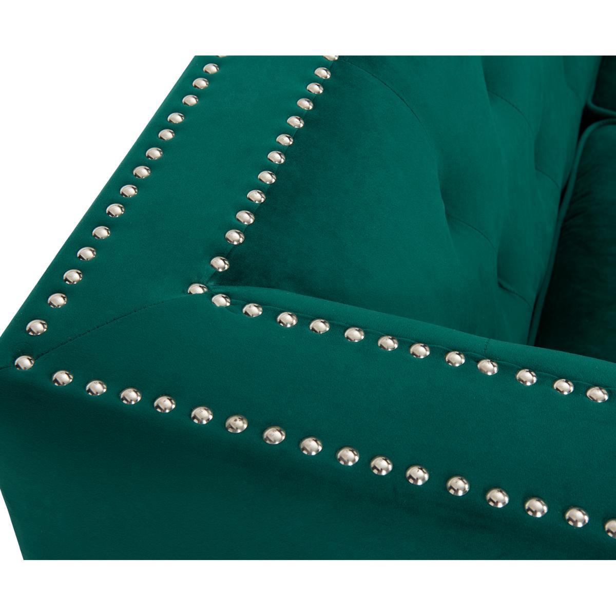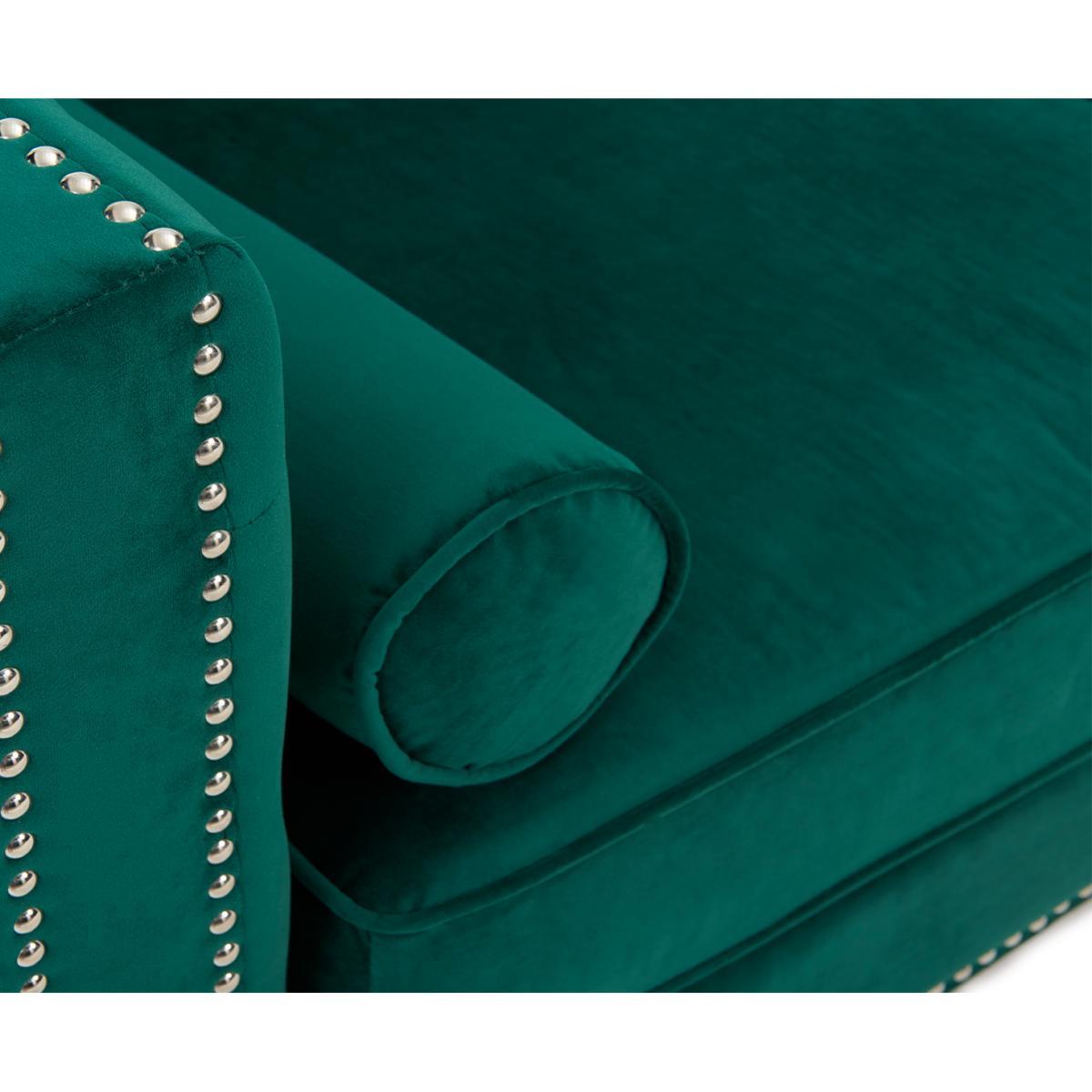 The New York Green Velvet Armchair combines modern and classic design to create a stunning piece of furniture for your living room. Chic and comfortable, the armchair features foam padding and cushioning and soft green velvet upholstery. Featuring a tufted button design on the inside of the armrests, the armchair is complete with metal stud detailing around the edges for the perfect finishing touch. The New York Velvet Armchair is also available in blue or grey and comes complete with 2 free bolster cushions and 1 free scatter cushion.