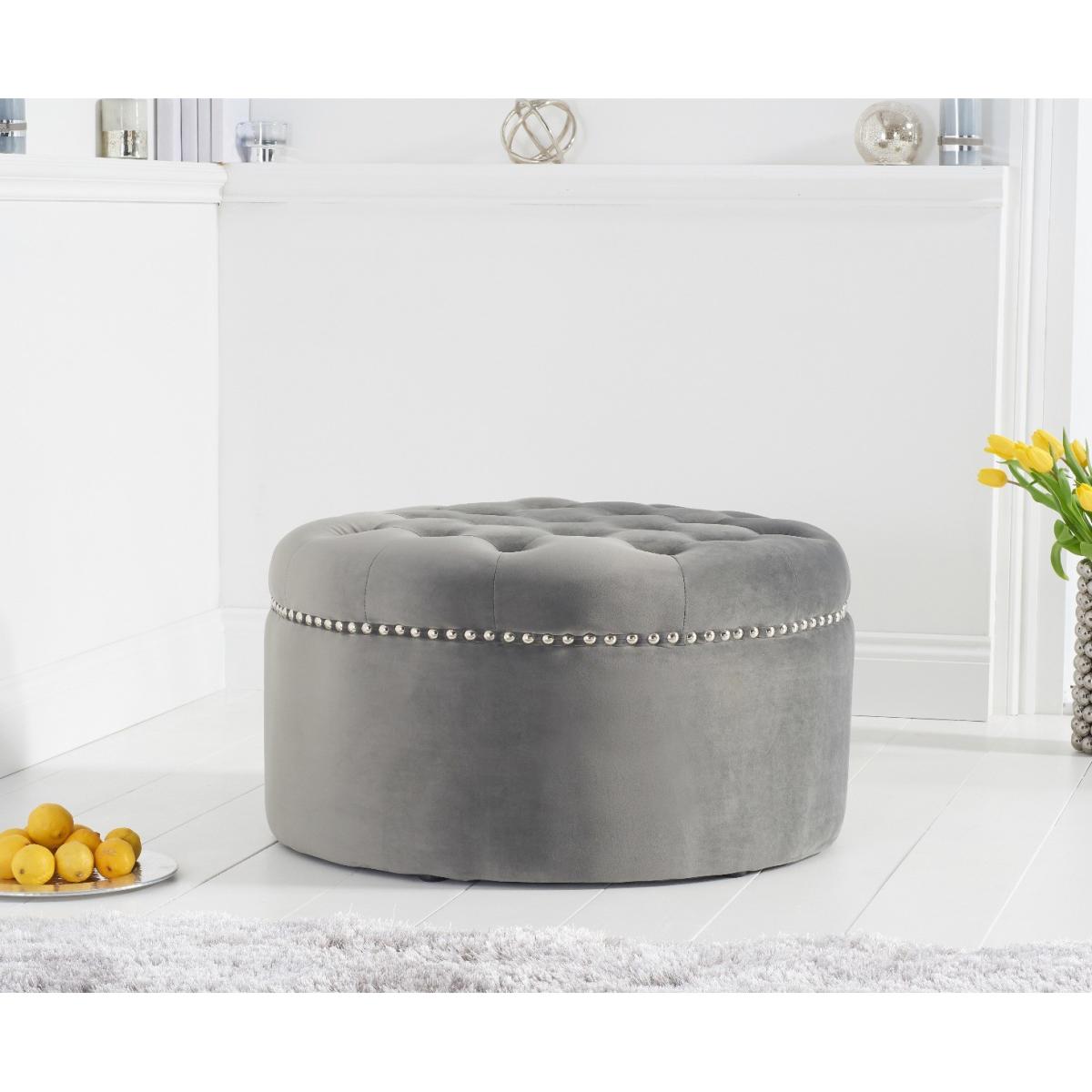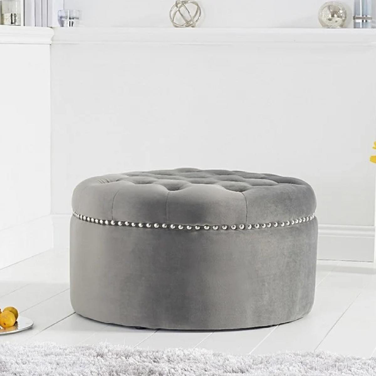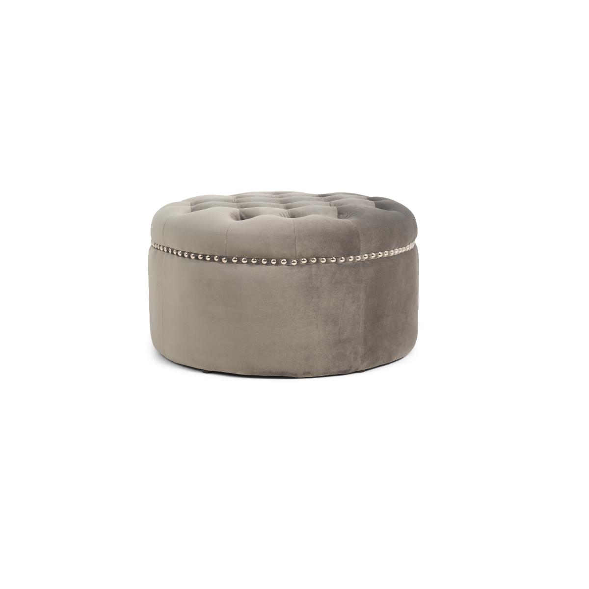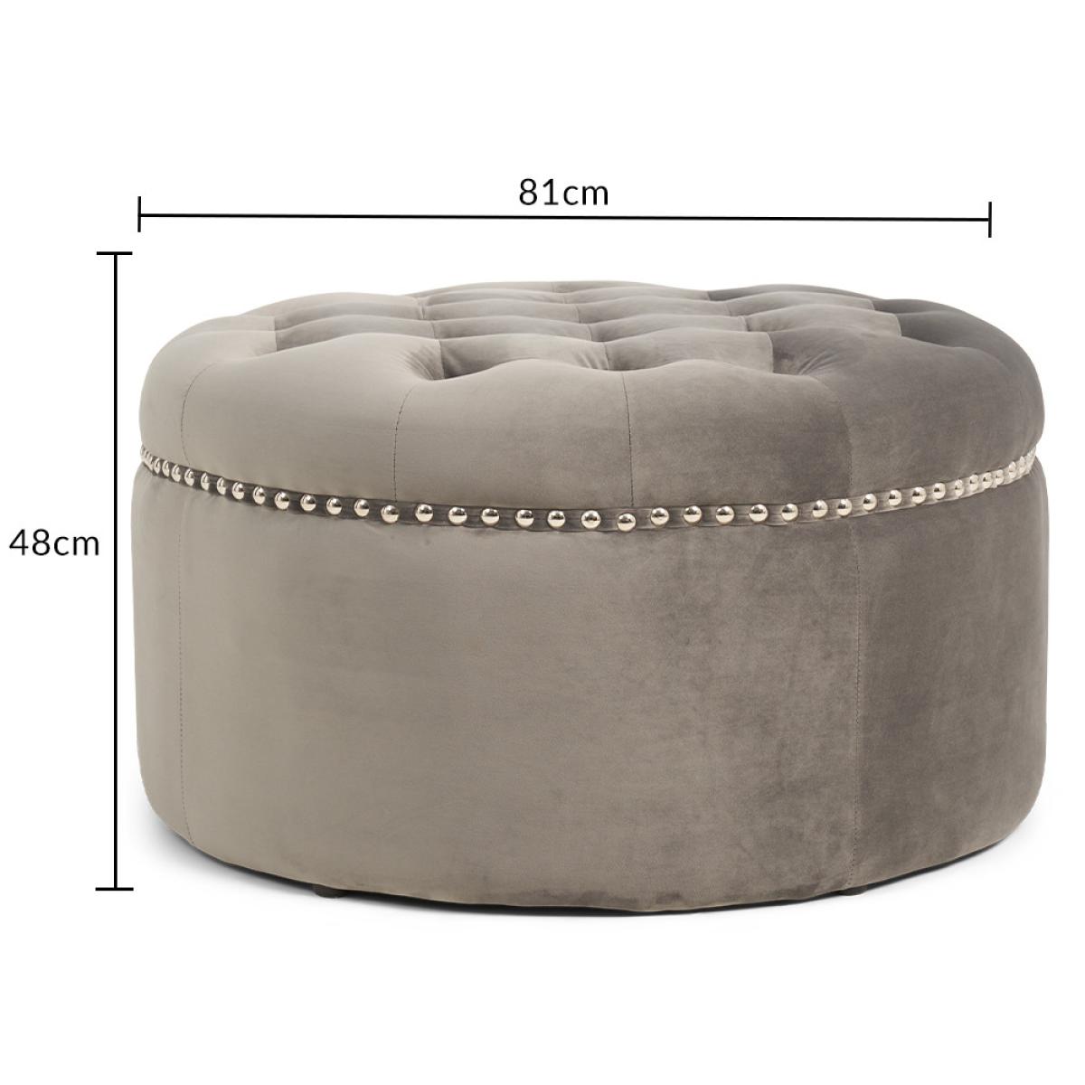 New York Grey Velvet Footstool features a stunning deep buttoned design that makes it a stand out addition to your living room. With touchable grey velvet and a densely padded top for maximum comfort, the round footstool is complete with metal studs. Round grey velvet footstool is an elegant addition to your living room Complements the New York Grey Velvet Sofa Collection Touchable plush velvet for a soft feel Deep buttoning on the top for a luxury look Metal studs complete the opulent design Also available in Blue and Green