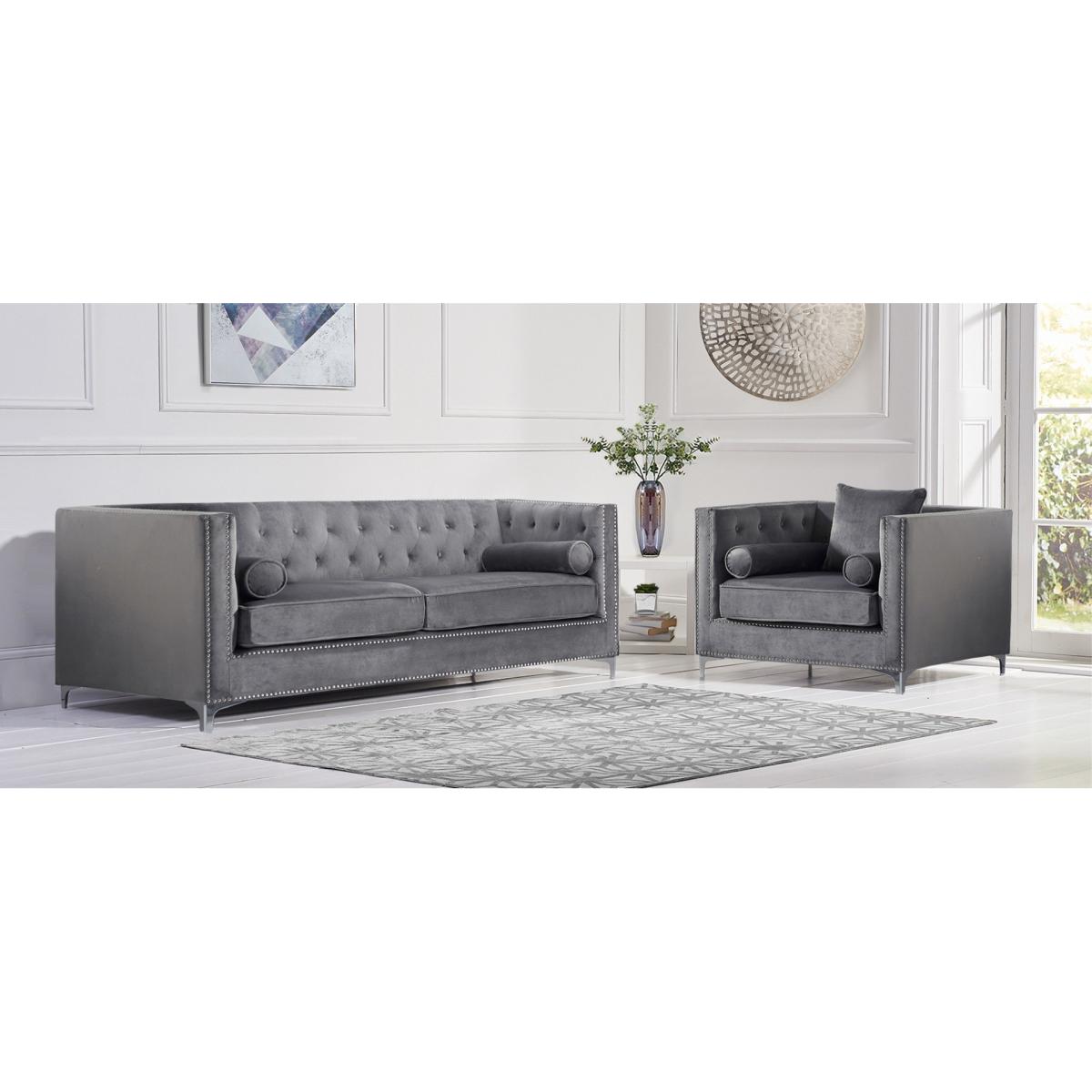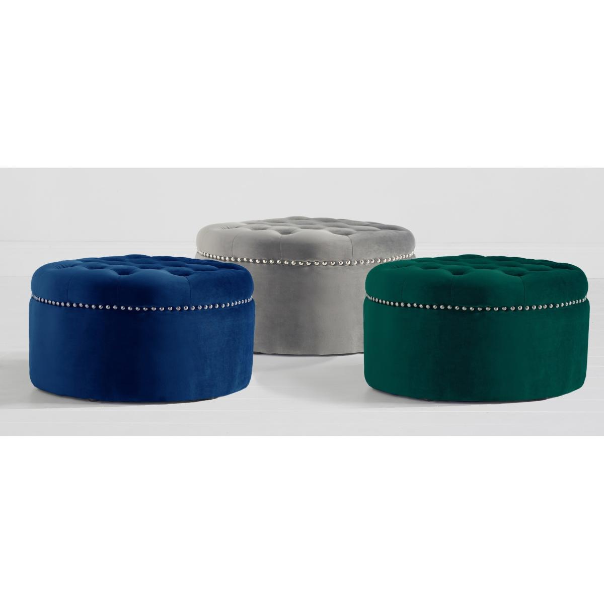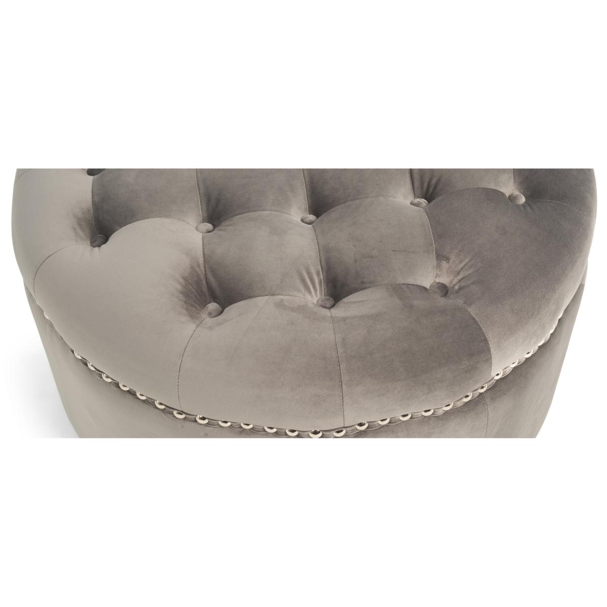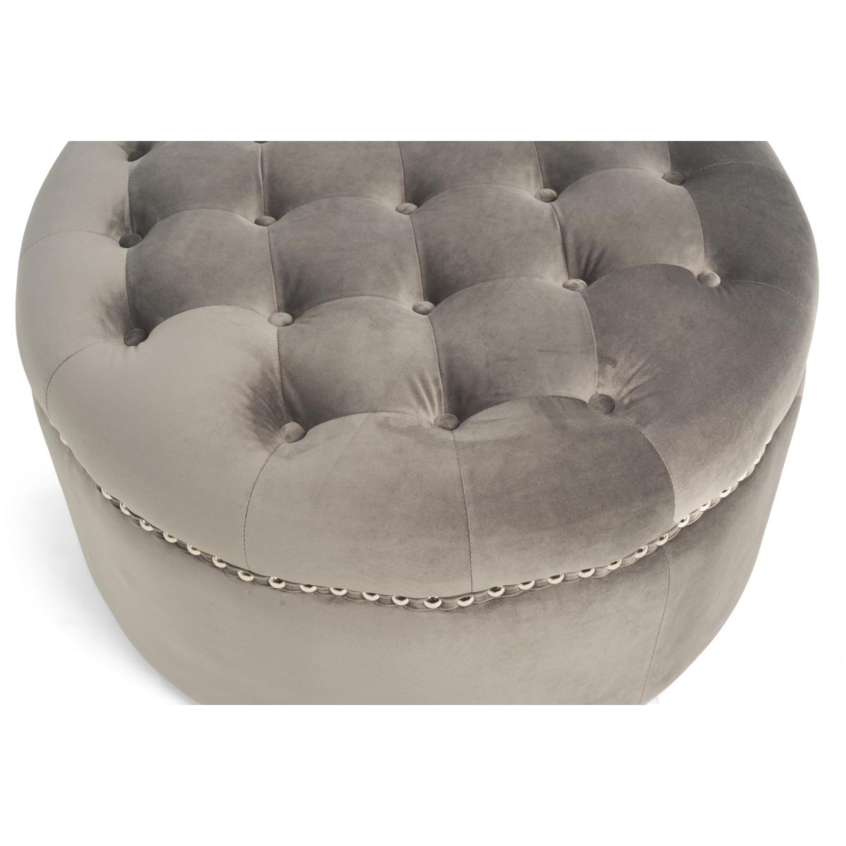 New York Grey Velvet Footstool features a stunning deep buttoned design that makes it a stand out addition to your living room. With touchable grey velvet and a densely padded top for maximum comfort, the round footstool is complete with metal studs. Round grey velvet footstool is an elegant addition to your living room Complements the New York Grey Velvet Sofa Collection Touchable plush velvet for a soft feel Deep buttoning on the top for a luxury look Metal studs complete the opulent design Also available in Blue and Green