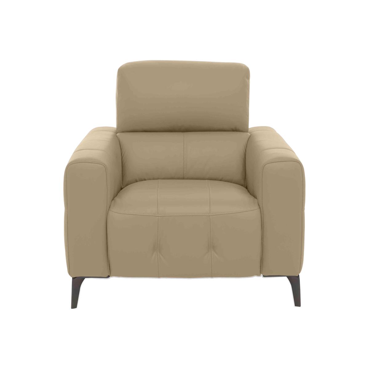 I’m a fan of this nude leather armchair for its clean lines, matt finish and slim black metal legs - it feels modern without dominating the room. It fits neatly into minimalist, Scandi-inspired or urban-industrial schemes, and its neutral tone makes it easy to layer in. For styling, drape a cosy wool throw over one arm and add a textured cushion in olive or rust to introduce subtle colour. Position it beside a light-oak side table or a sleek black steel lamp to balance warmth and edge, or angle it near a low coffee table to create a relaxed reading or conversation nook.