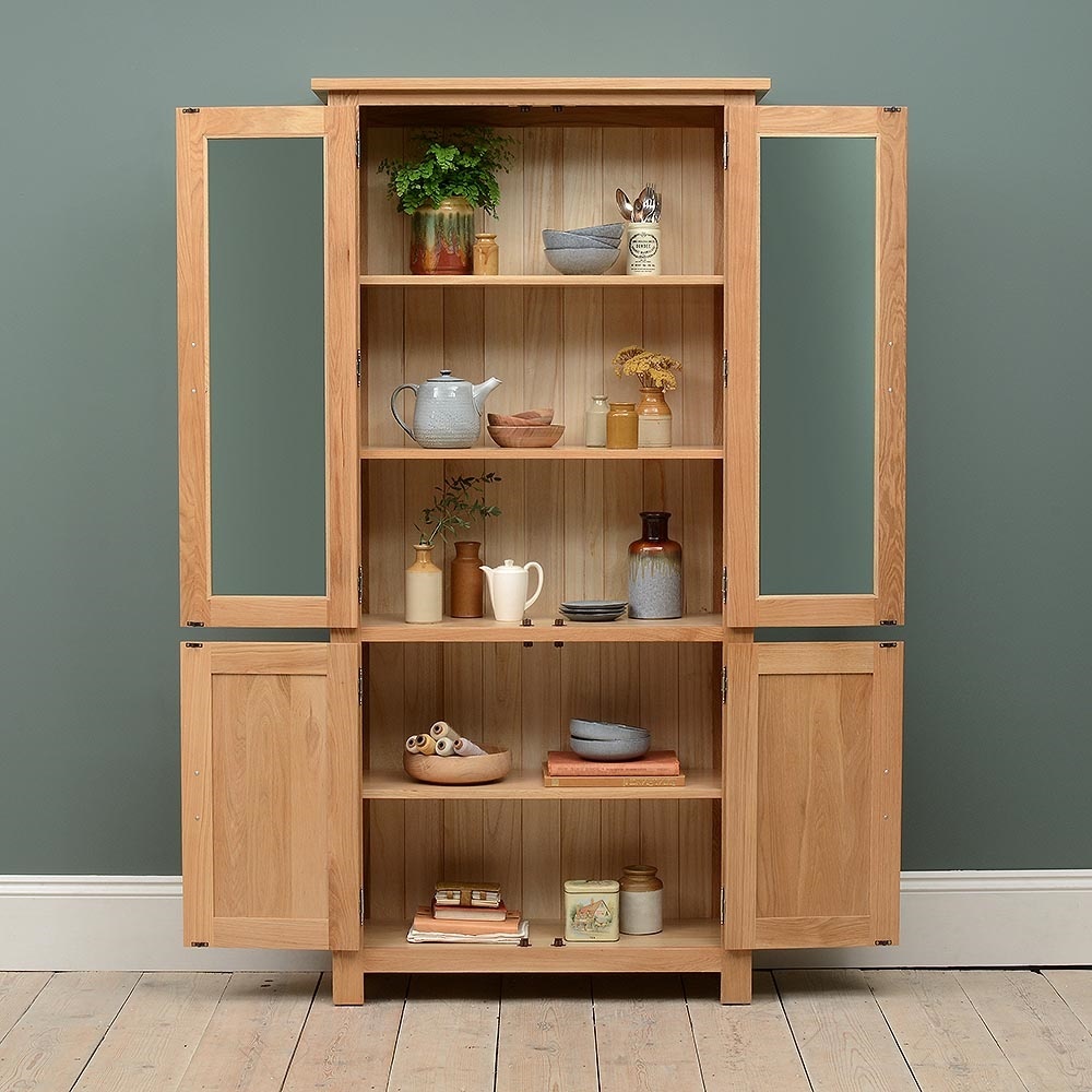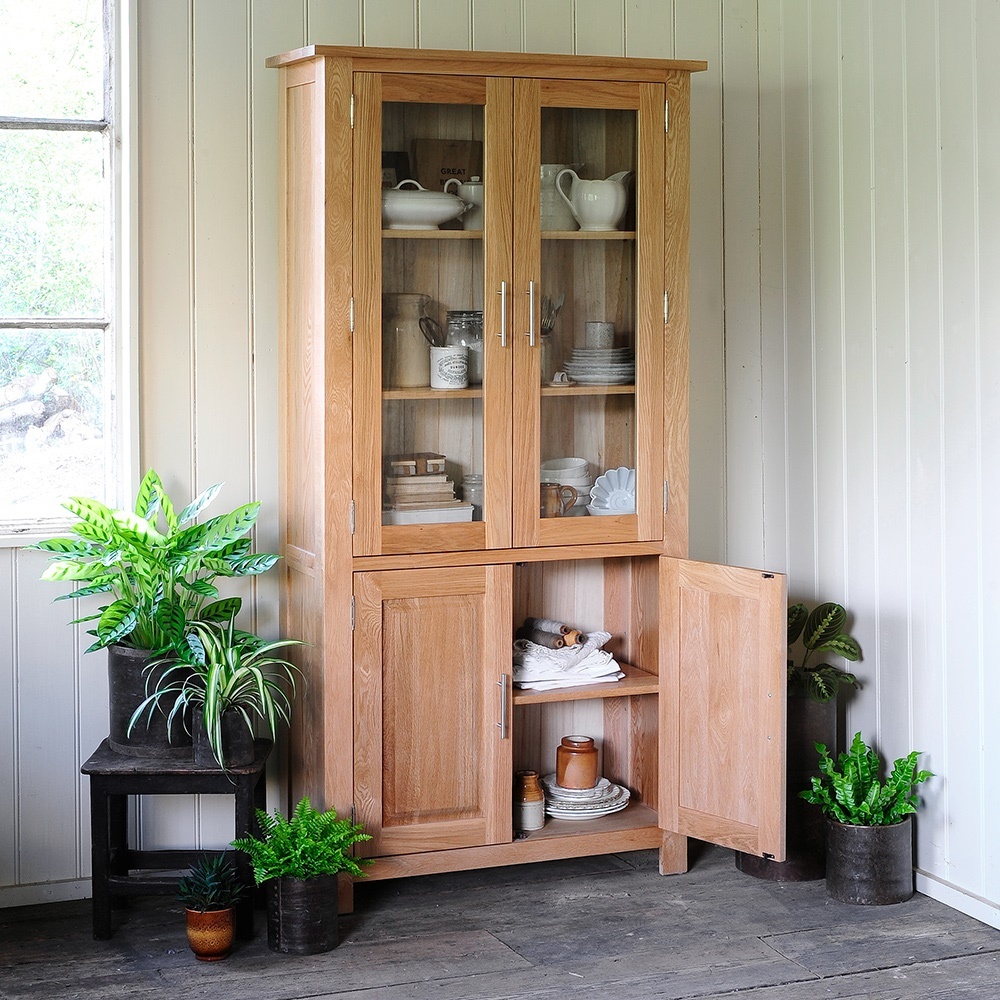 An elegant combination of traditional and contemporary design, this beautifully made cabinet is worthy of being put on display itself. Crafted with care from high quality oak and oak veneer; protected with a clear lacquer finish, it offers an ideal home for displaying your favourite treasures and collectables on its three shelves. Glazed double doors ensure your possessions remain dust free and the roomy double cupboard with shelf will take care of items you'd rather not have on show.