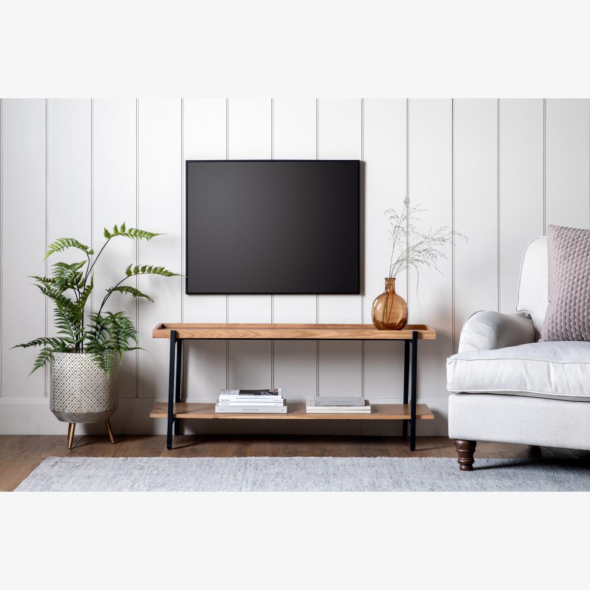 Whether you decide to use this TV stand to hold your TV or as an extra storage solution, that's up to you! The matt black metal frame holds the oak shelves that have a tray like style. Full assembly is required, but do not worry! Assembly is easy and all the tools you will need are supplied. Coordinating furniture pieces are available in the Newark range.