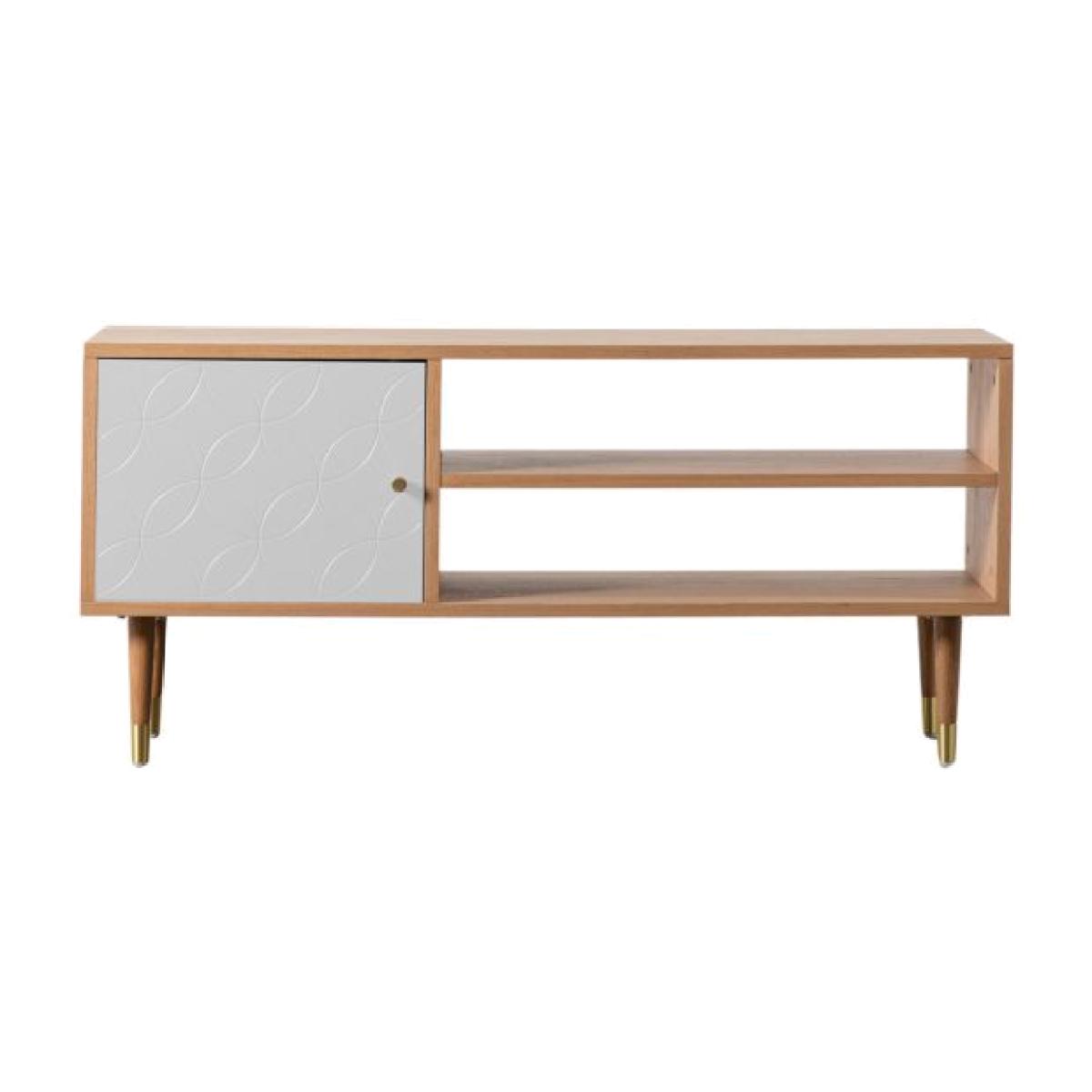 This lovely Media Unit makes an unusual eye-catching feature piece, with a combination of a white painted finish and natural oak veneer. The unit combines colour and shape to great effect, with a routed geometric circular pattern, reminiscent of Bauhaus design, on the painted door. A brass handle on the cupboard door is complemented by brass ‘socks’ on the solid oak legs. The unit is also available in grey, and the collection also includes other matching and coordinating pieces. The collection of living furniture is part of our Packed-Flat Design Project, offering easy delivery to any room in any property, whilst reducing the packaging needed. Easy assembly is required, but all the tools needed are supplied.