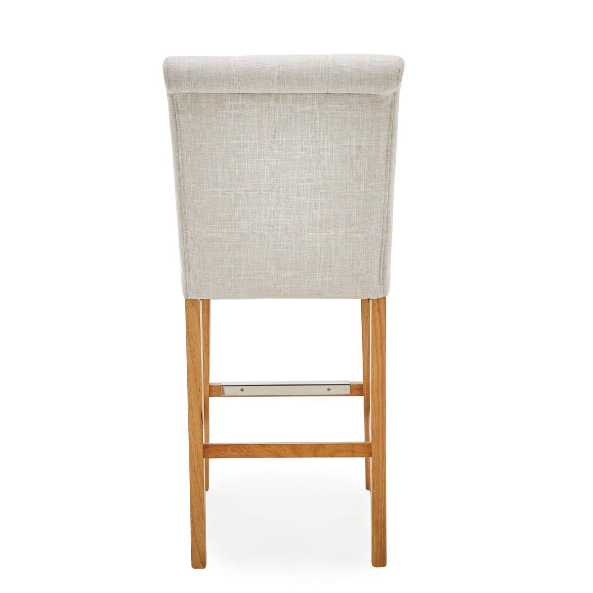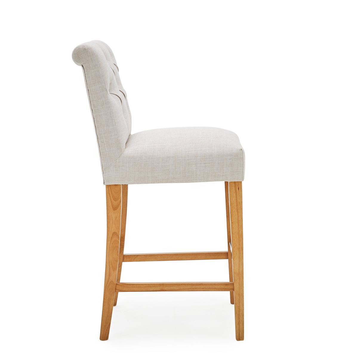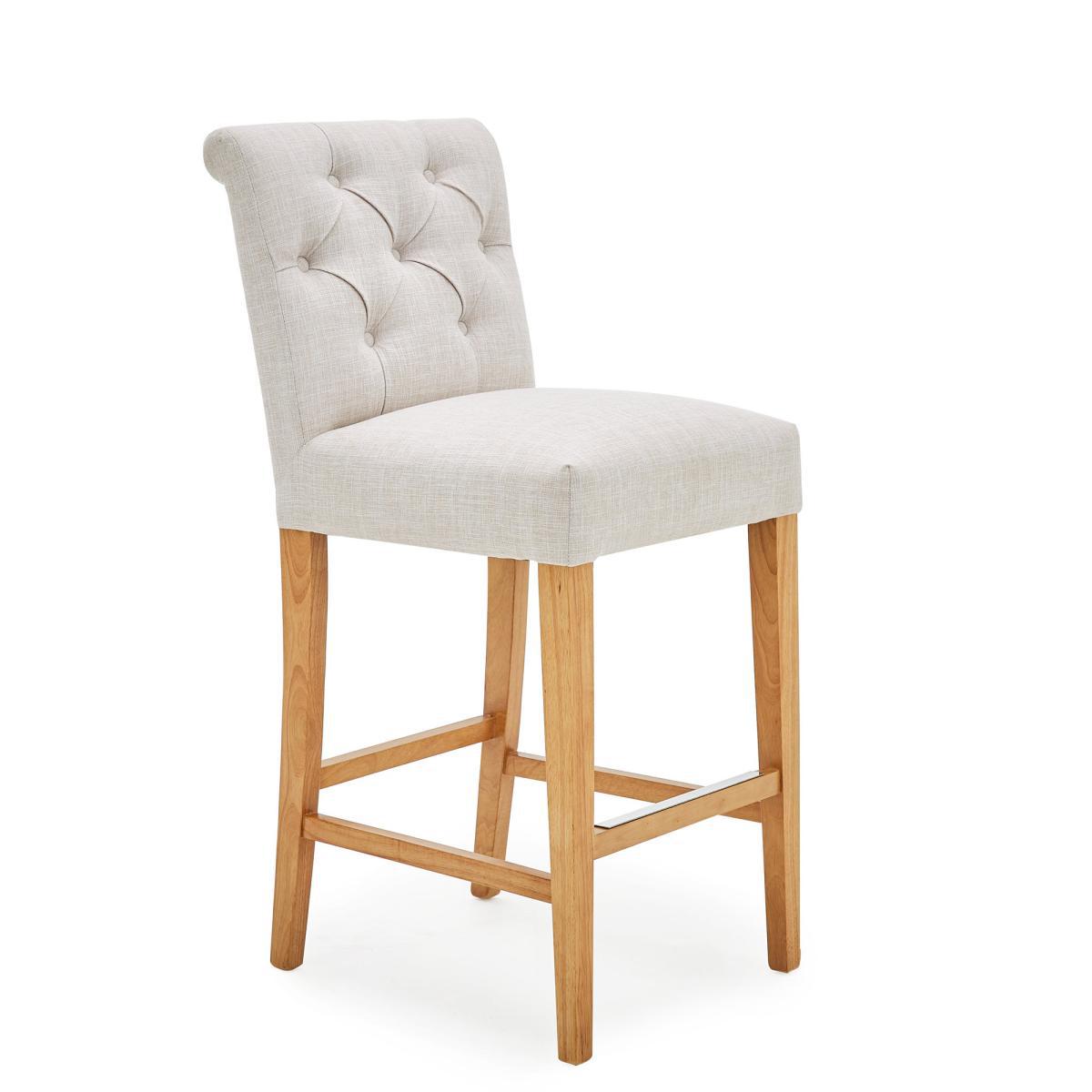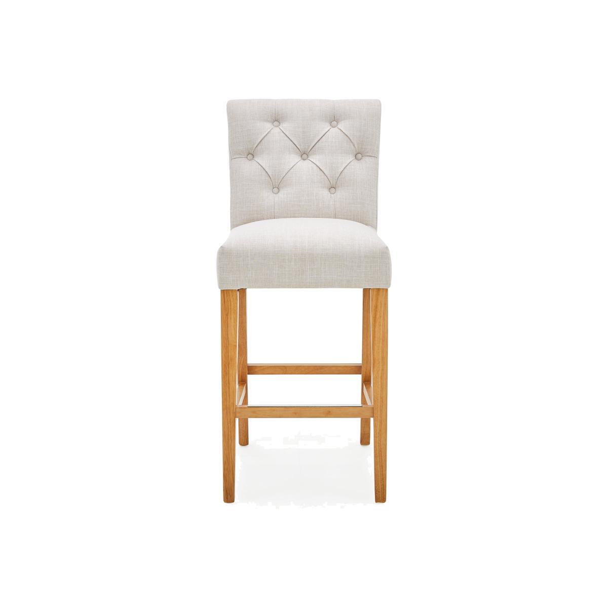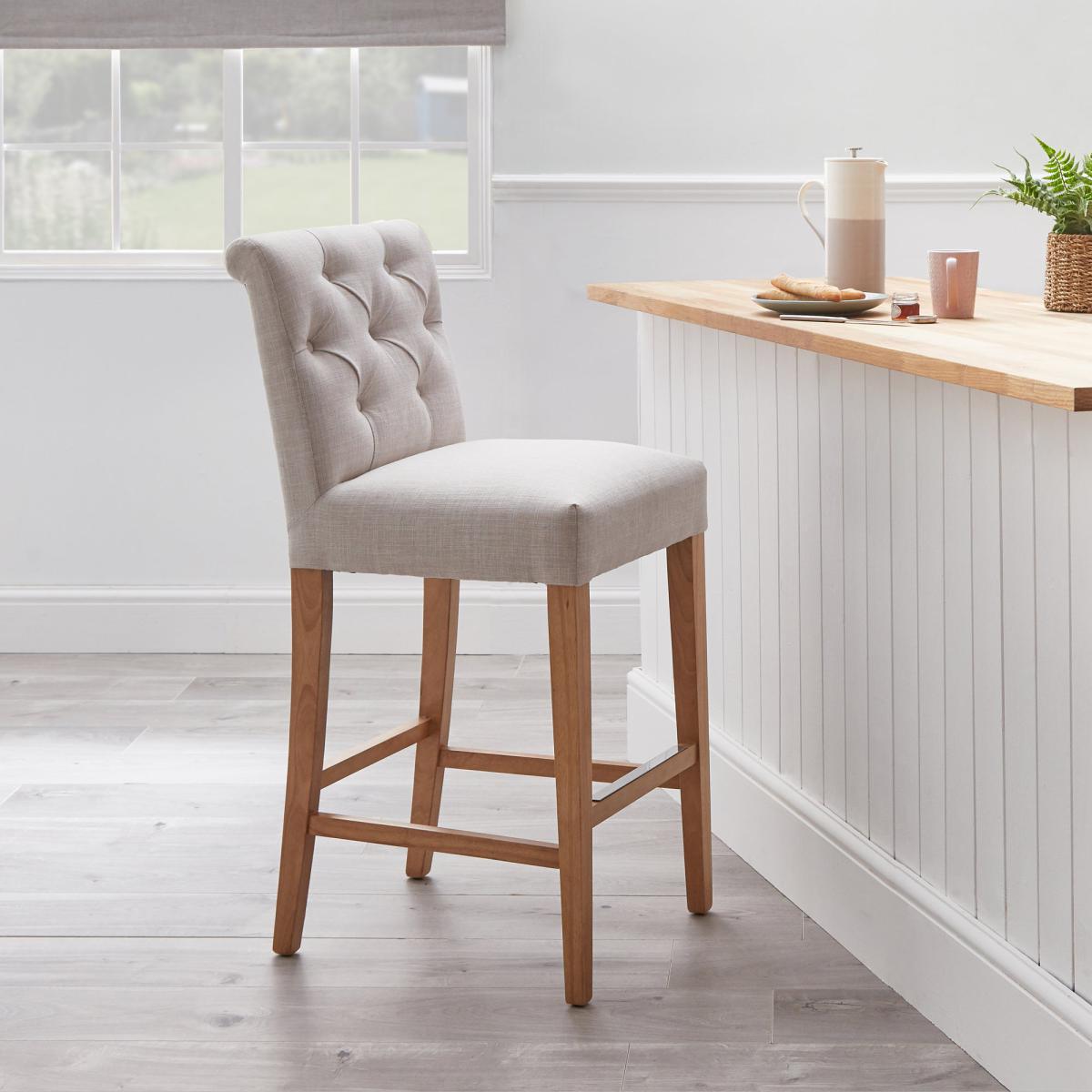 With its timeless, elegant style, the Newbury linen bar stool would be a great addition to your kitchen or dining space and is upholstered in a natural coloured, linen-look flatweave fabric. With its comfortable foam-filled, sprung and webbed seat, this fully assembled bar stool features a classic button back detailing and complementing solid pine legs, complete with a crossbar footrest and is the perfect height to suit standard UK countertops.