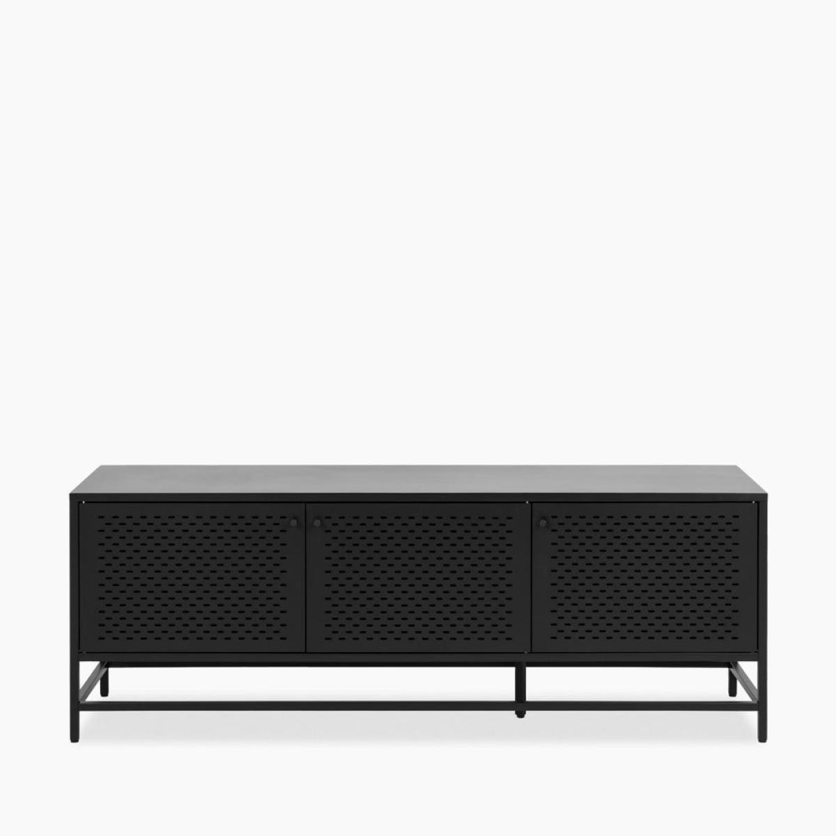 I love the Newcastle sideboard’s matt-black finish and perforated doors - they add subtle texture without overwhelming the room. Its slim frame and raised legs make it feel light, so it works well in industrial, Scandi or mid-century-inspired schemes. Styling-wise, keep the top uncluttered: a lamp or sculptural vase, a low plant and a neat stack of books in odd-number groupings. Inside, the vented doors are ideal for hiding media kit or a router; simply route cables through the back for a clean, streamlined look.