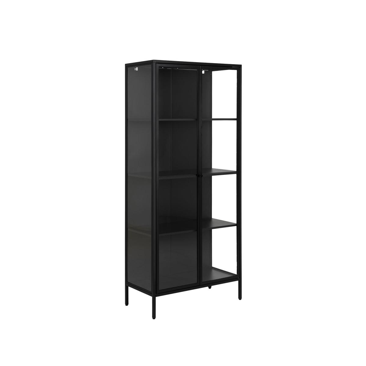 Showcase your favourite crockery in this Newcastle Tall Display Cabinet. Sleek and functional, this piece of furniture is made using powder-coated metal for durability and features multiple shelves for displaying dinnerware, glassware, ornaments, books and more. The two doors with clear tempered glass panels and matt black rough powder-coated steel accents add a contemporary touch to your space.