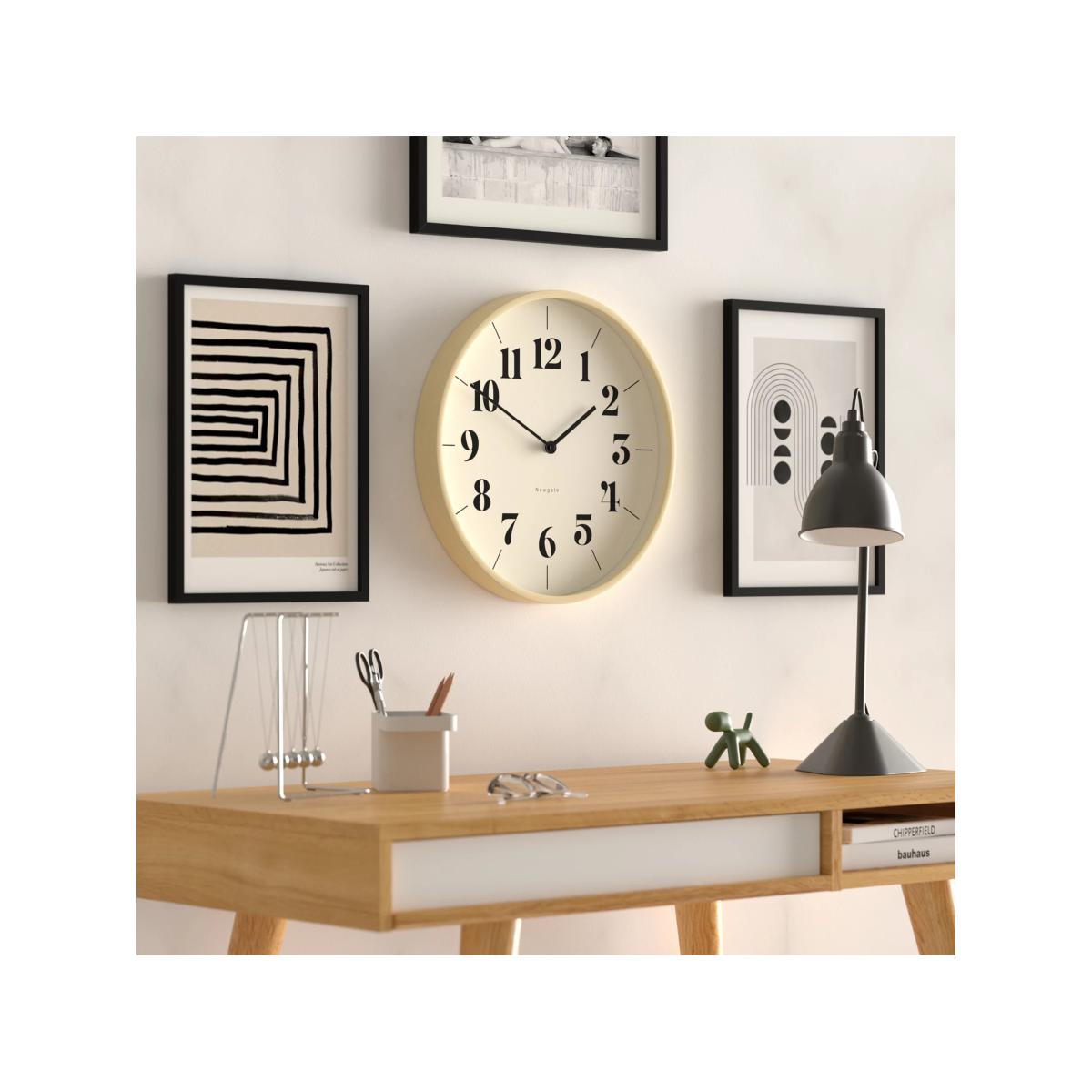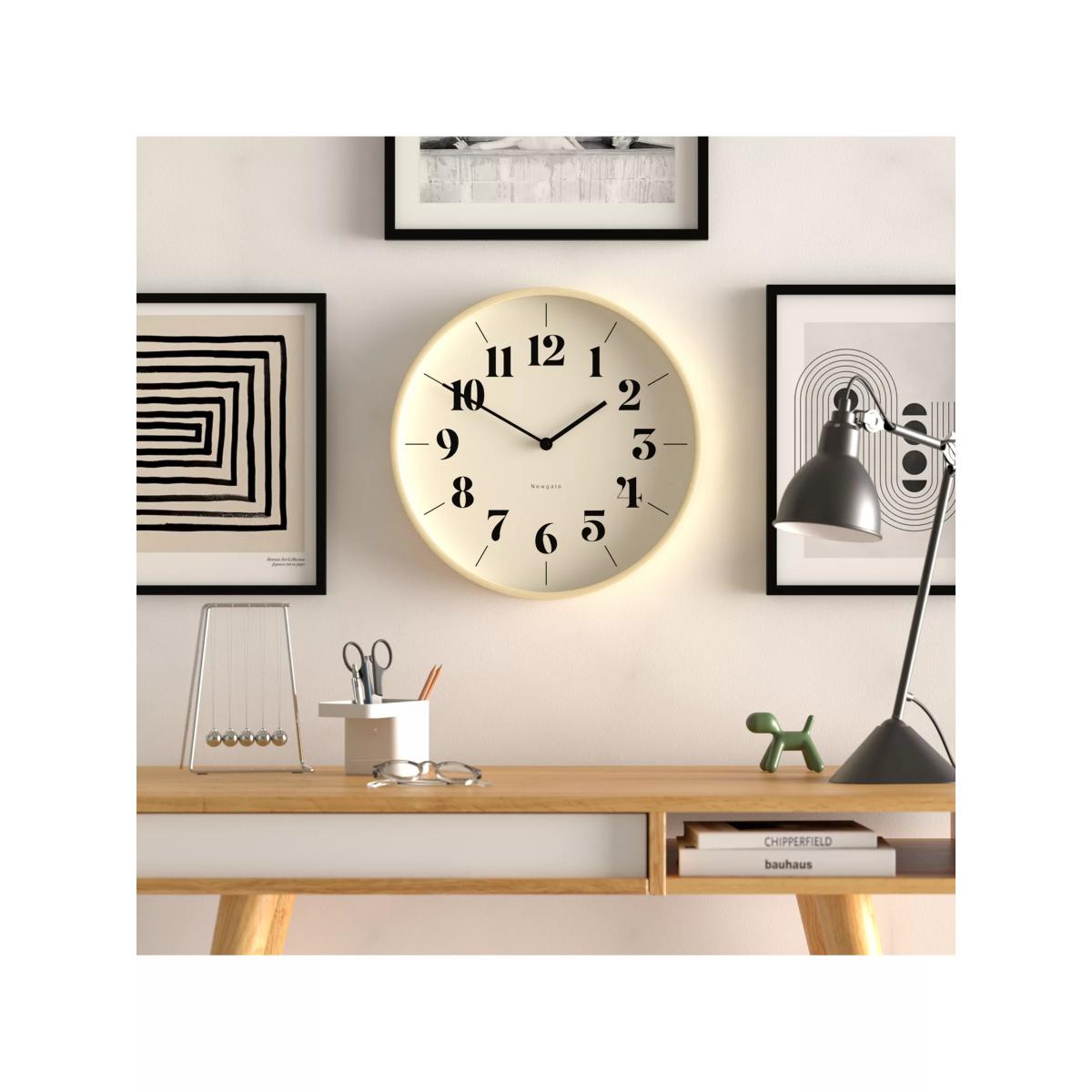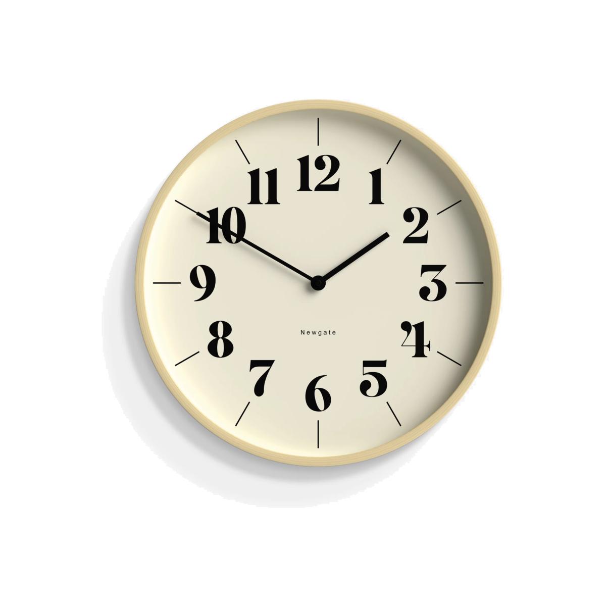 A modern wall clock from Newgate Clocks with a pale plywood case and a contemporary theatre dial featuring Arabic numerals and metal hands behind a glass lens. The clock has quartz movement for energy-efficient precision time-keeping. A faint tick can be heard in a totally silent environment such as a bedroom. Crafted from real wood, there may be slight natural variations in the colour and grain as well as some natural wood knots, lines and joins, making each clock unique.