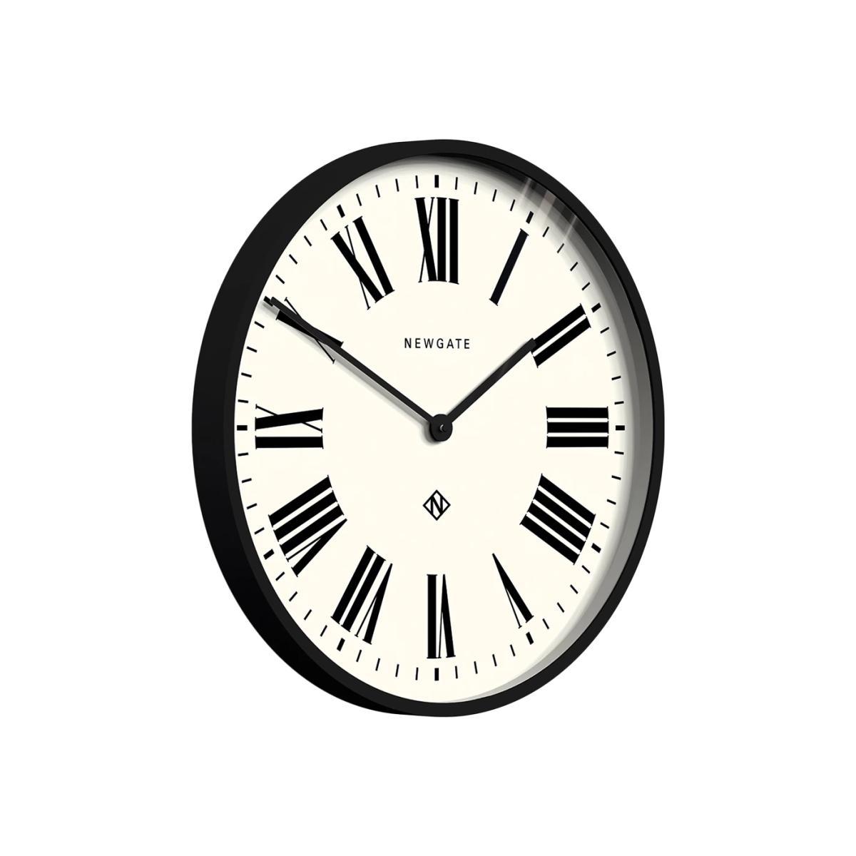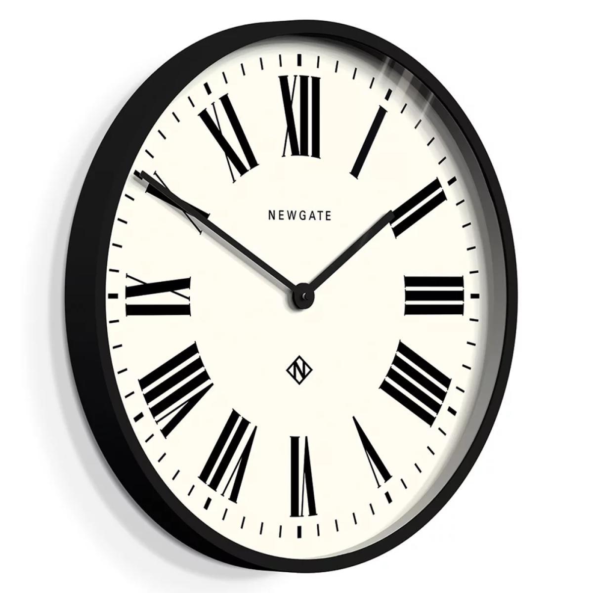 A large Roman numeral wall clock with an oversized straight-cut case in a modern black finish. The Italian wall clock from Newgate Clocks combines contemporary style with classic design to create a timeless look suited to any interior.