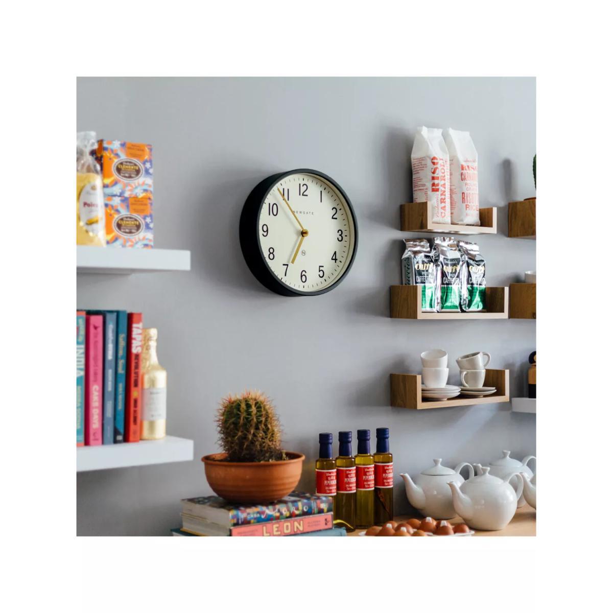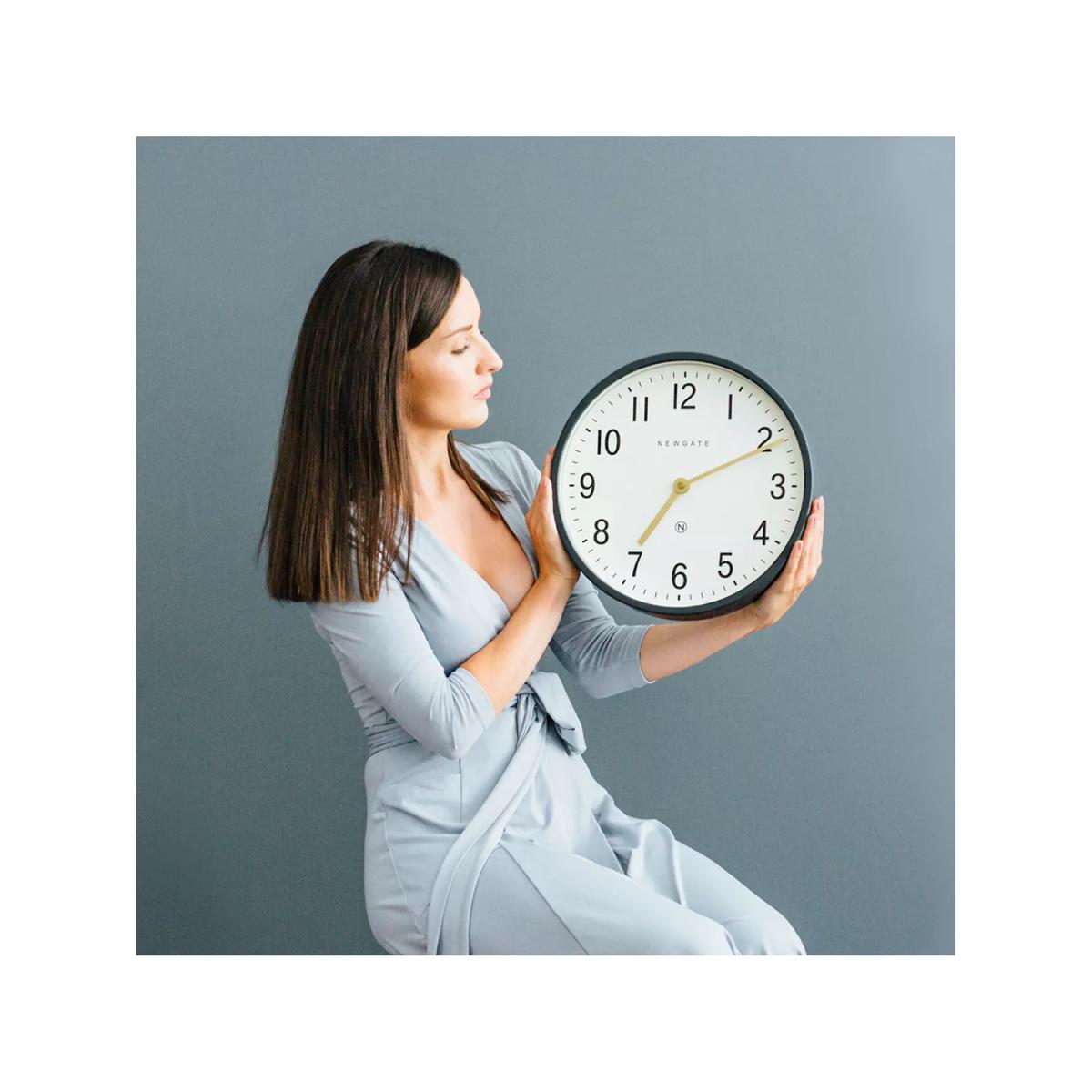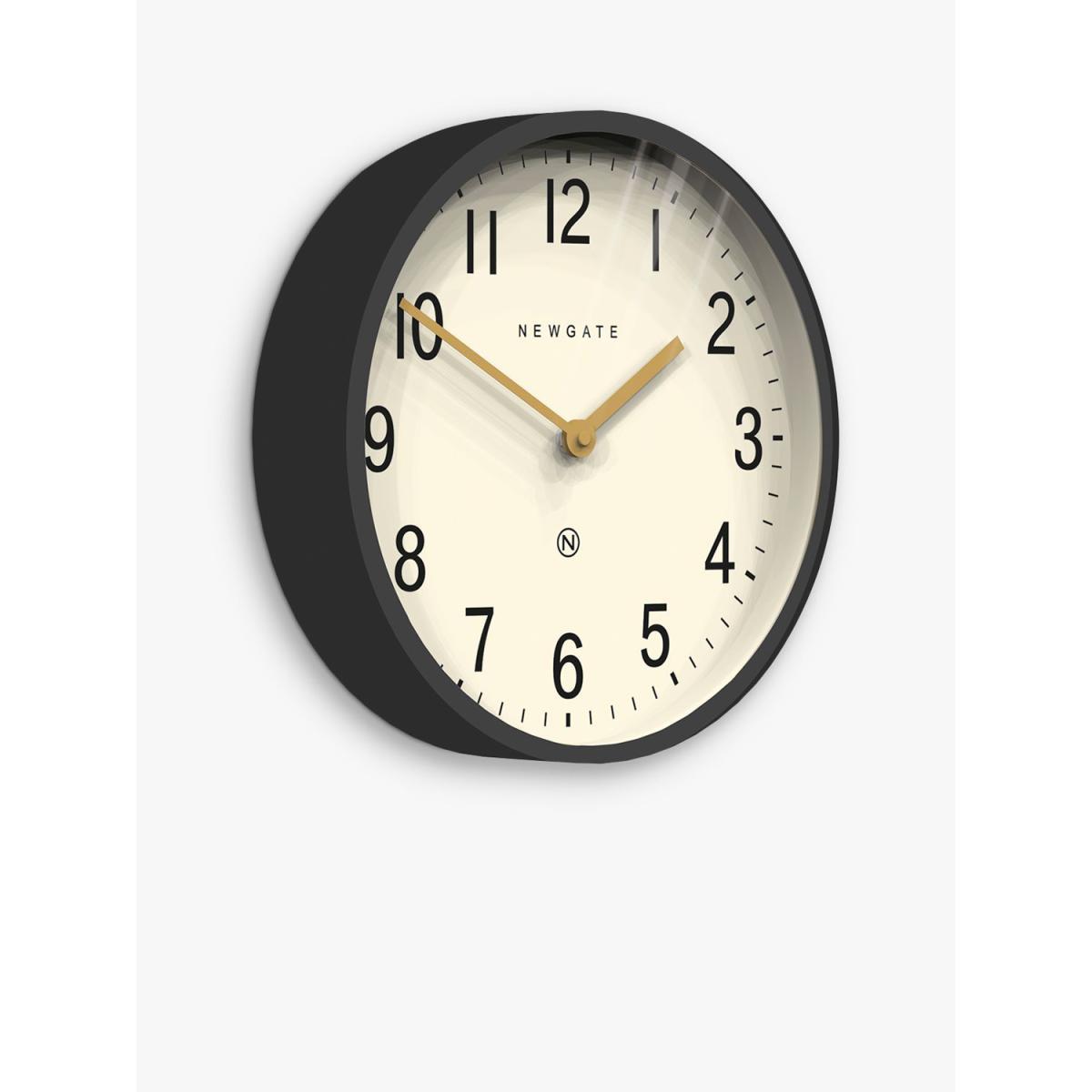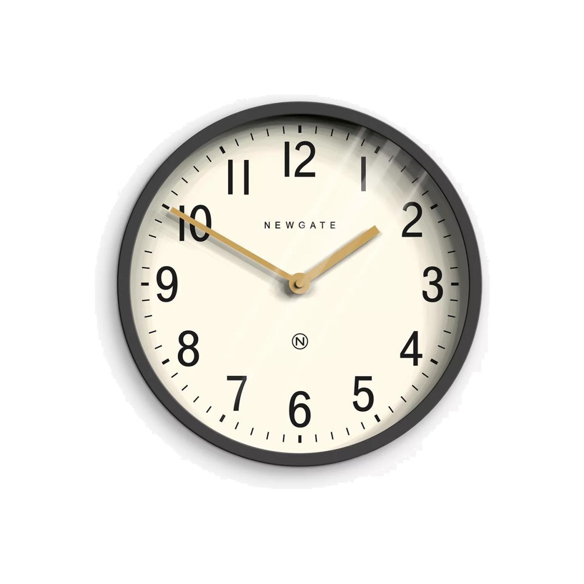 The Master Edwards wall clock from Newgate Clocks is inspired by mid-century minimalism with a solid circular metal case, straight cut for a clean and graphic line and modernist finish. The dial has Arabic numeral hour markers in a modern font, protected by a flat glass lens.