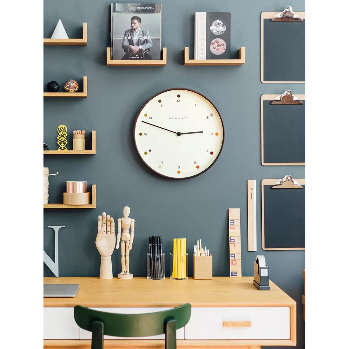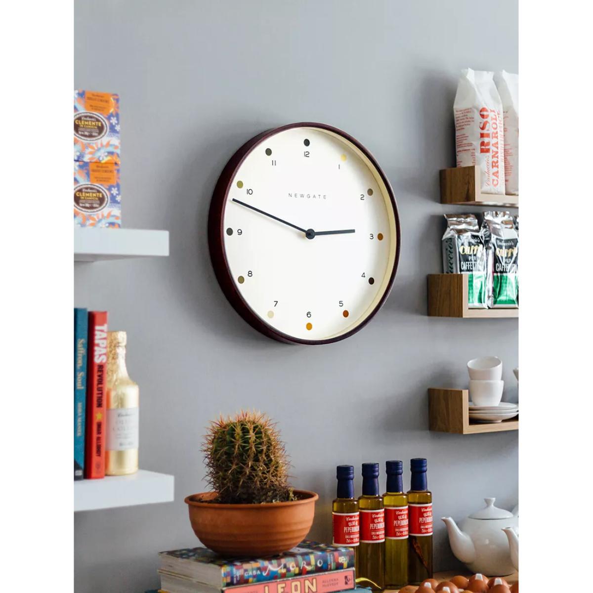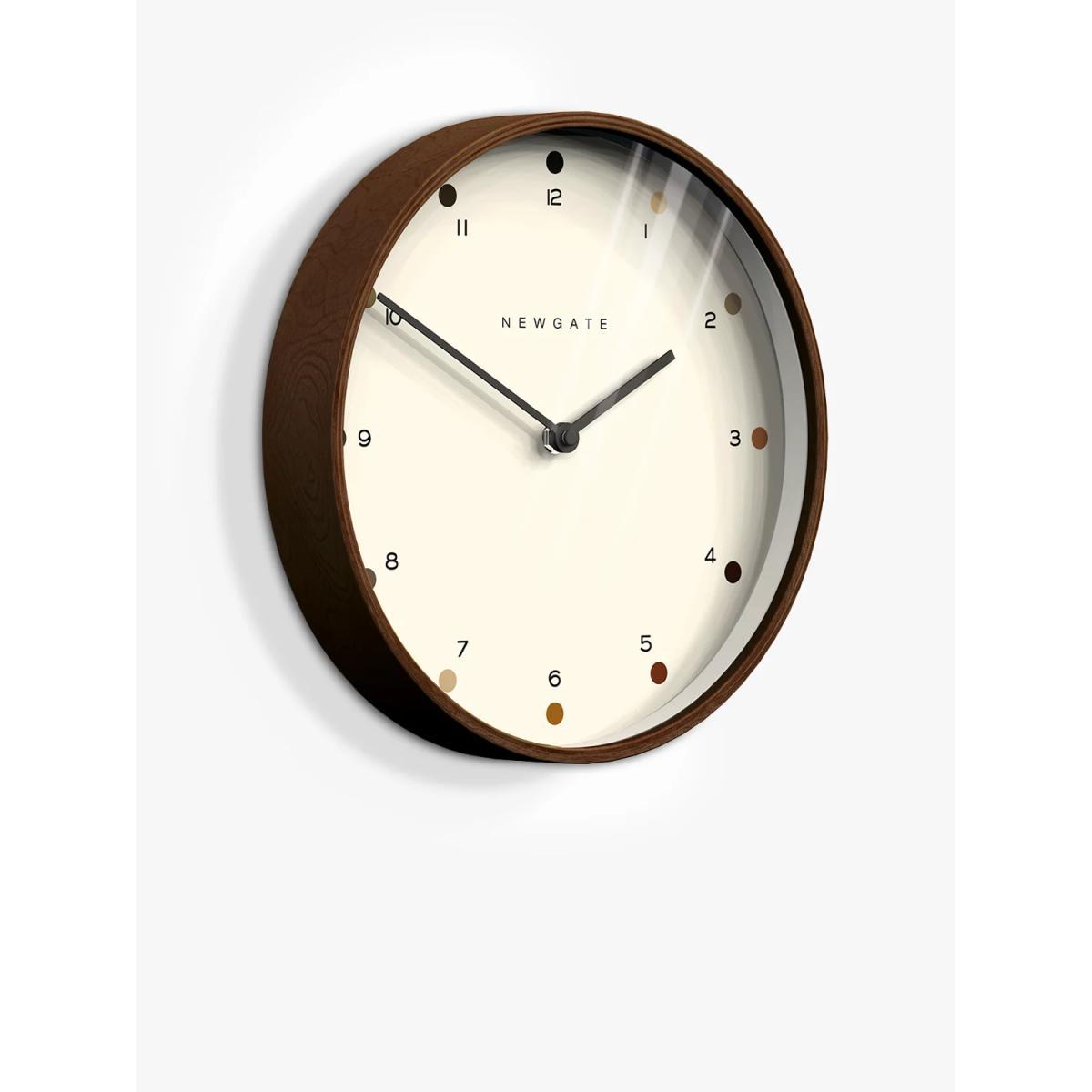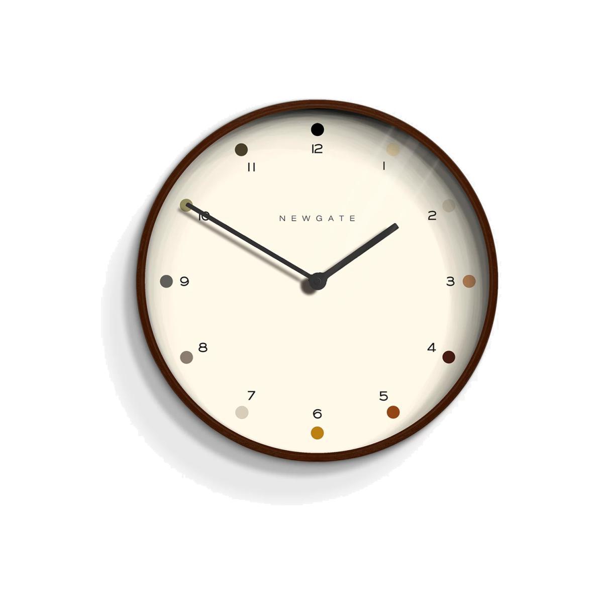 A modern take on a mid-century-inspired design, this Mr Clarke wall clock from Newgate Clocks has a dark plywood casing and shaded dots marking the hours. The dial features Arabic numerals with simple metal clock hands, protected by a glass lens.