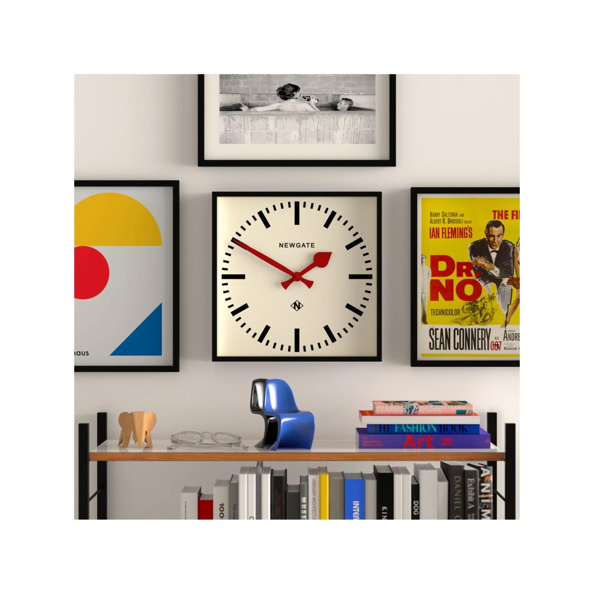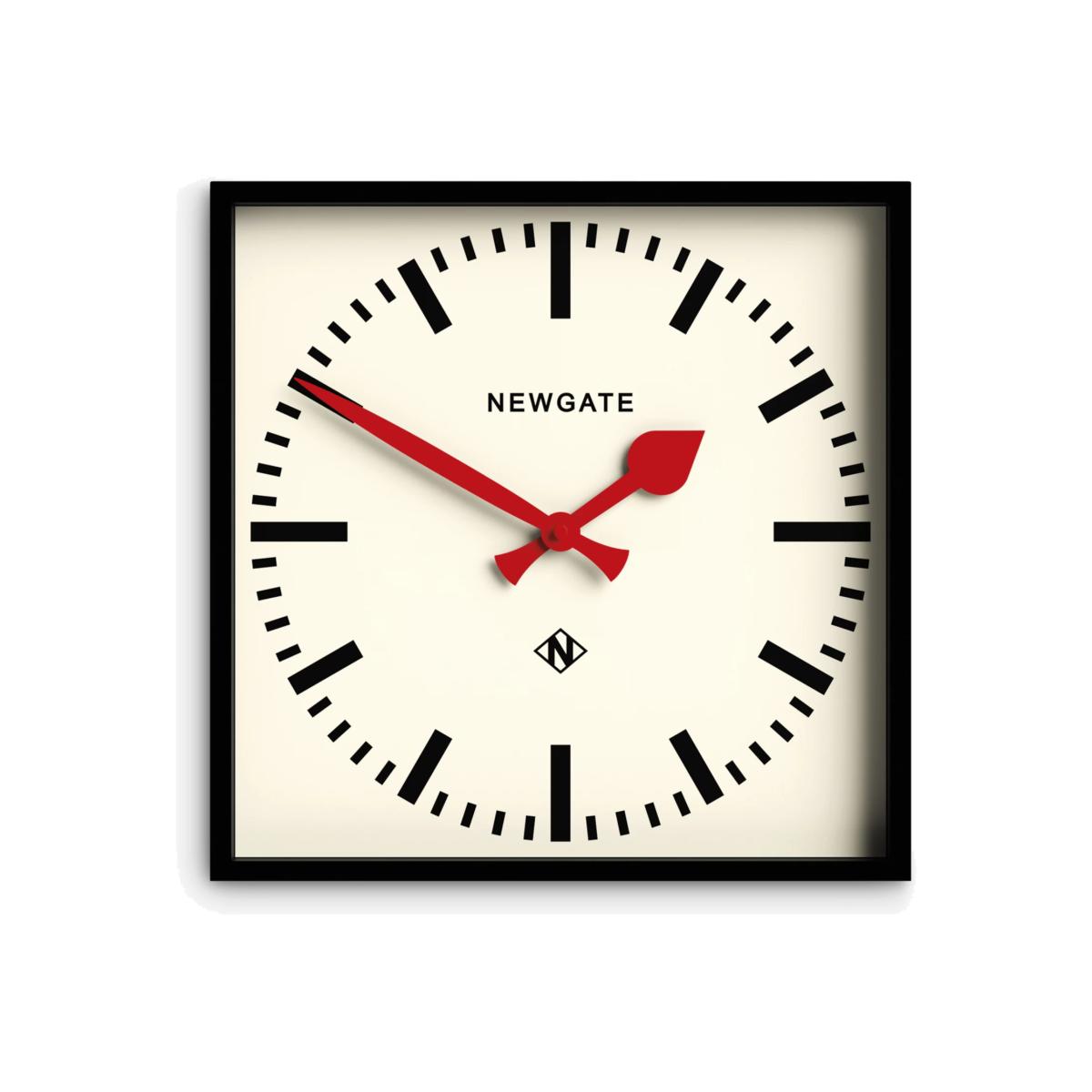 A square station wall clock from Newgate Clocks with an acrylic case and bold marker dial. The clock features contrasting red metal hands behind a glass lens. The clock has quartz movement for energy-efficient precision time-keeping. A faint tick can be heard in a totally silent environment such as a bedroom.