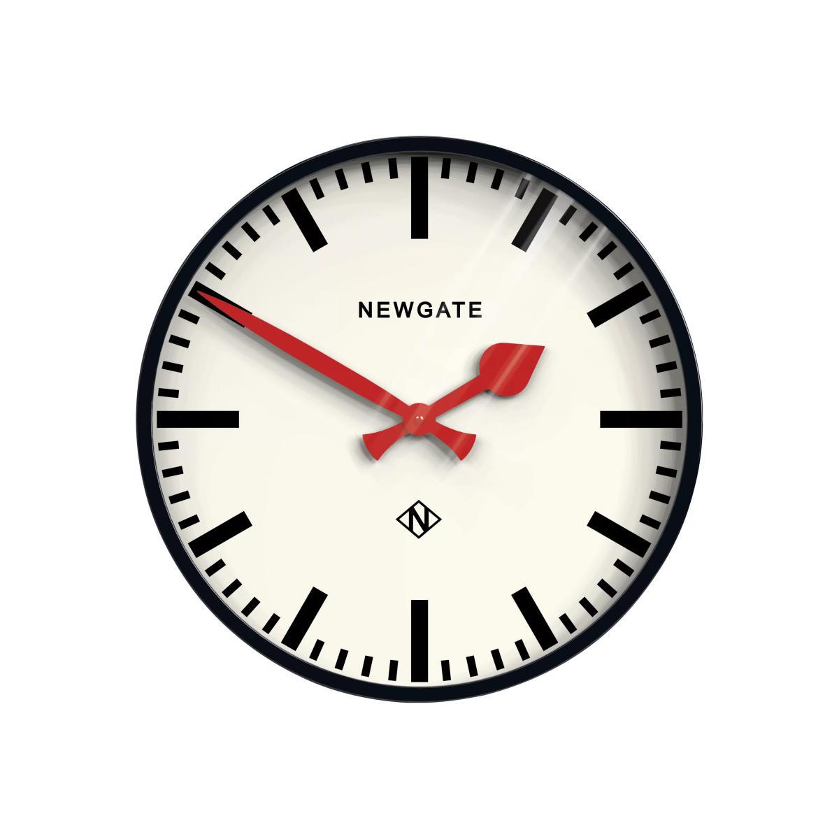 The iconic Putney Clock from Newgate is based on the instantly recognisable railway station clocks of the 1950's and 1960's. Its distinctive bold marker dial now makes a contemporary statement set, into a remarkably deep metal drum case. A high gloss black finish contrasts perfectly with the clean dial and statement red metal hands covered by a glass lens. A large scale clock designed to make an impact.