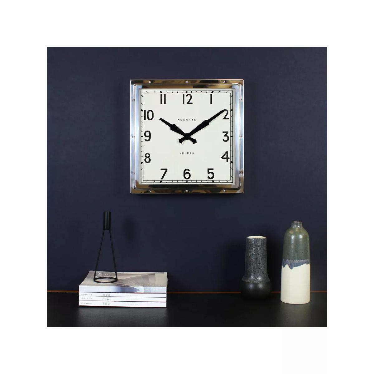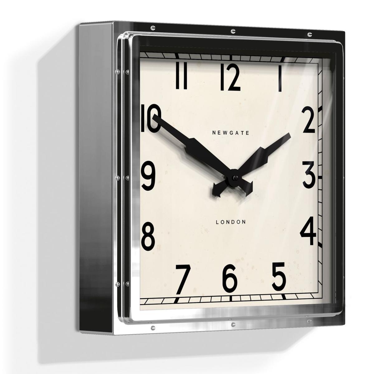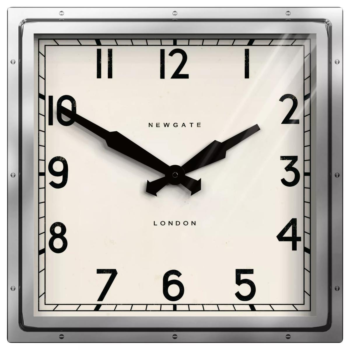 A truly iconic Newgate clock. The deep-pressed metal case with exposed rivets secures a sturdy glass lens. Its handsome square case surrounds a vintage dial with clear numbers measured by metal clock hands.