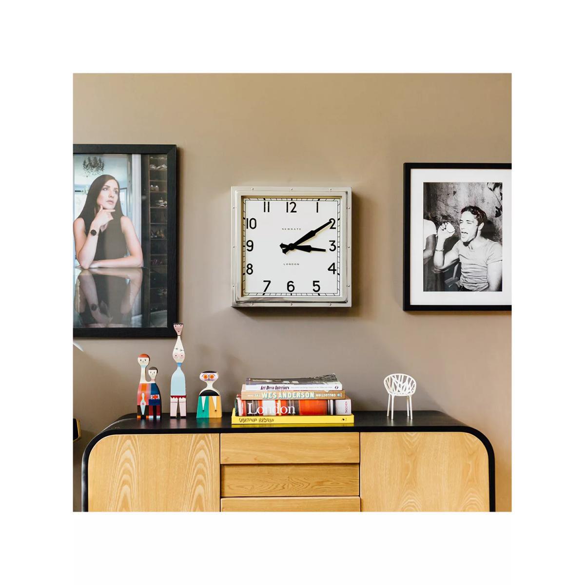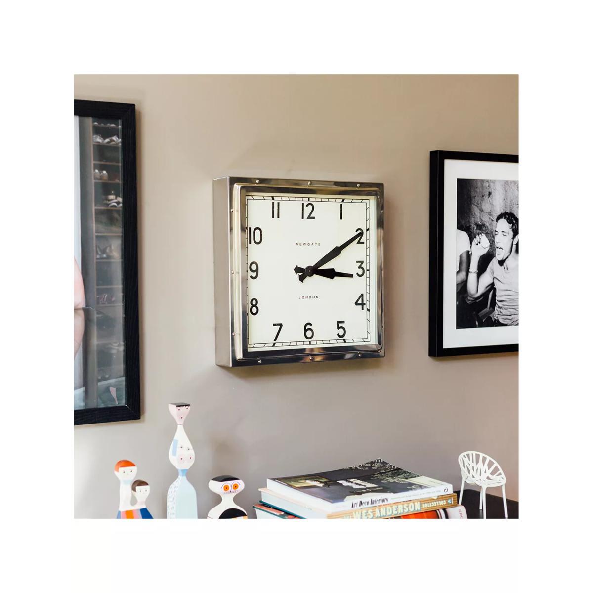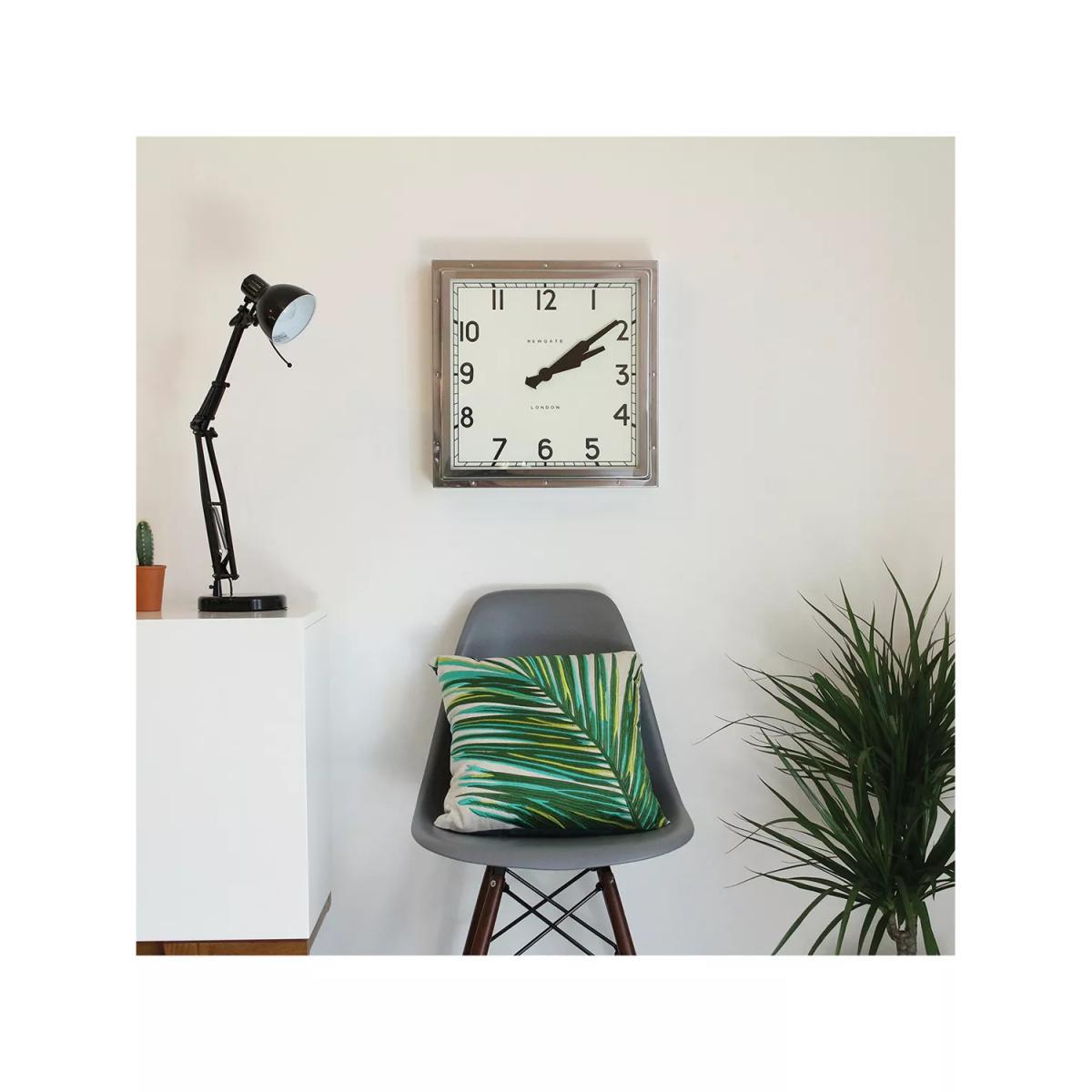 A truly iconic Newgate clock. The deep-pressed metal case with exposed rivets secures a sturdy glass lens. Its handsome square case surrounds a vintage dial with clear numbers measured by metal clock hands.