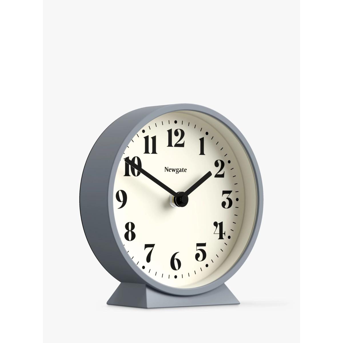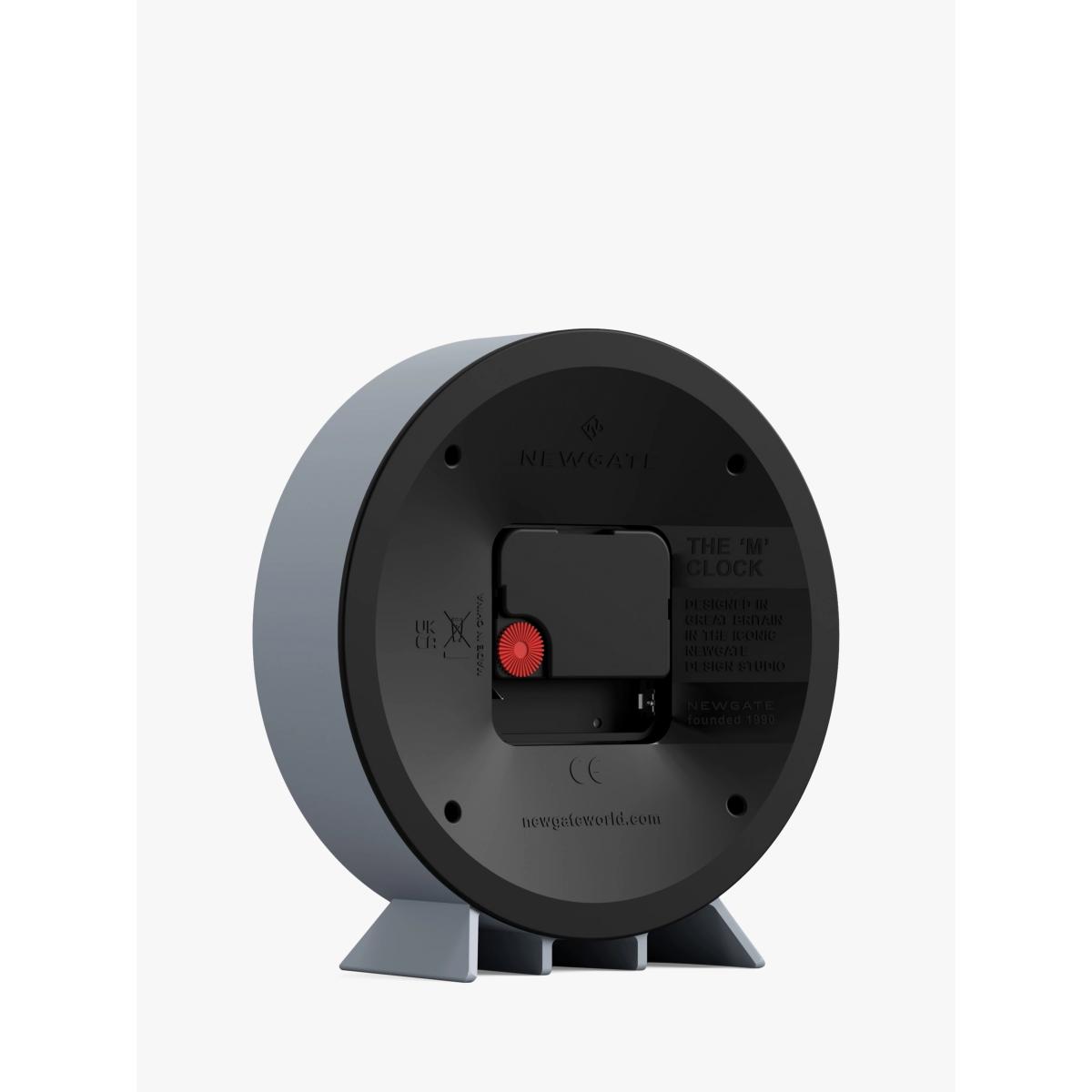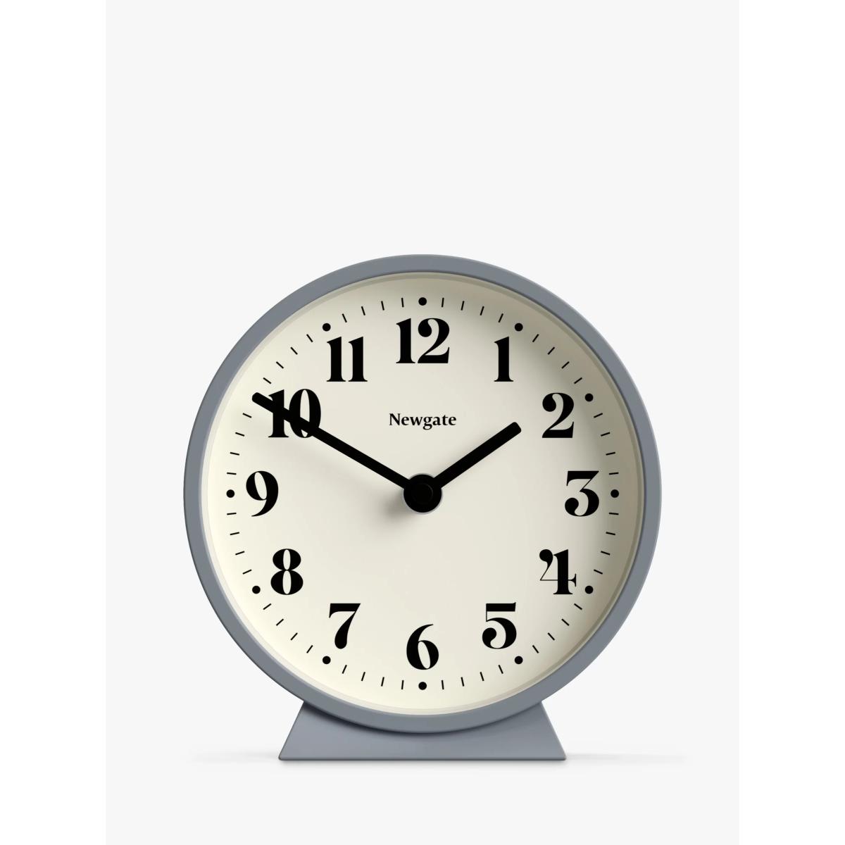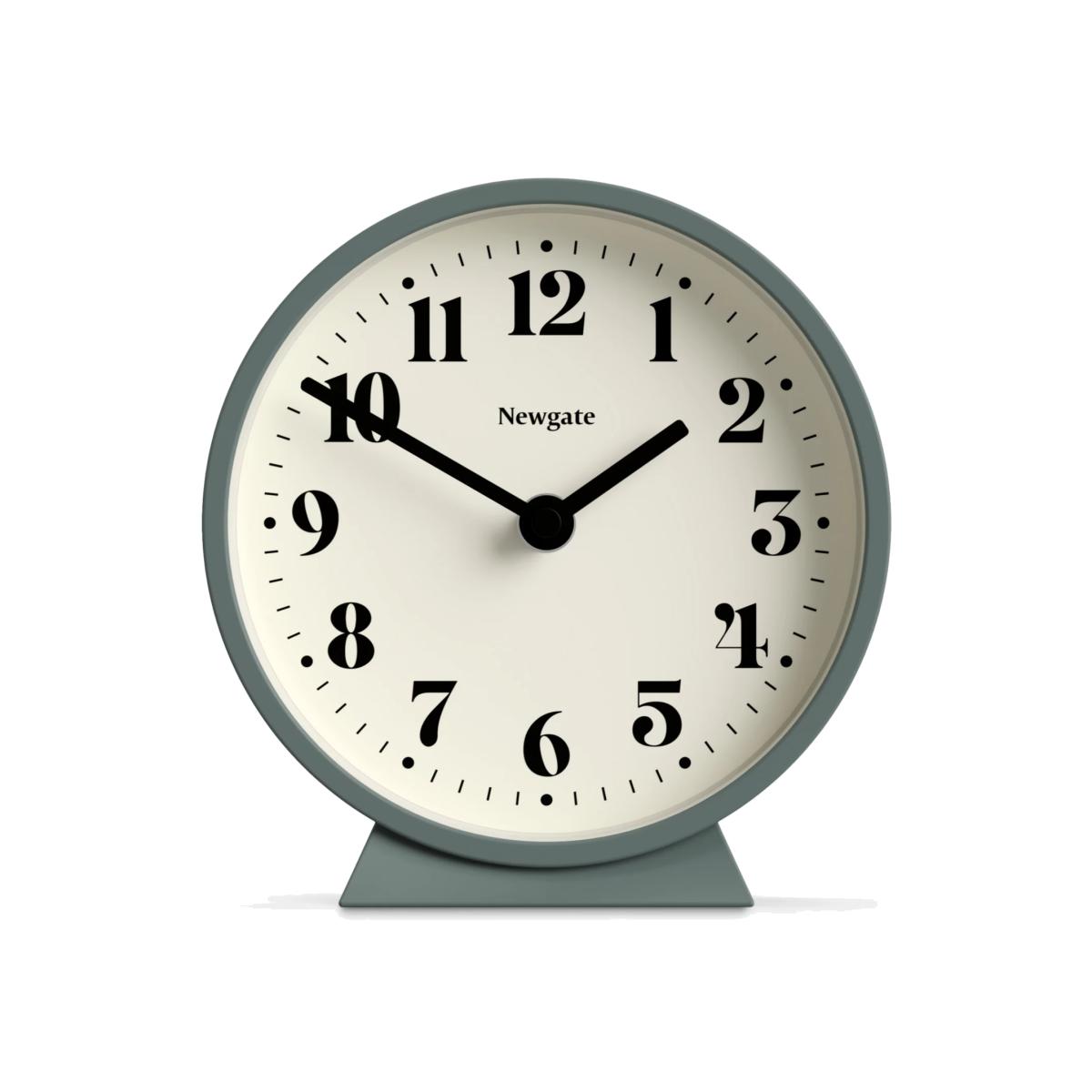 Theatre mantel or desk clock from Newgate Clocks with a minimalist dial. This modern matt-finish mantel clock holds a graphic theatre dial and glass lens. Known as 'silent sweep' in the industry, the hands move in a constant sweeping motion rather than a stepped tick. So you won't hear any ticking but if your hearing is particularly sensitive in a completely silent room you may hear a very quiet whirring.