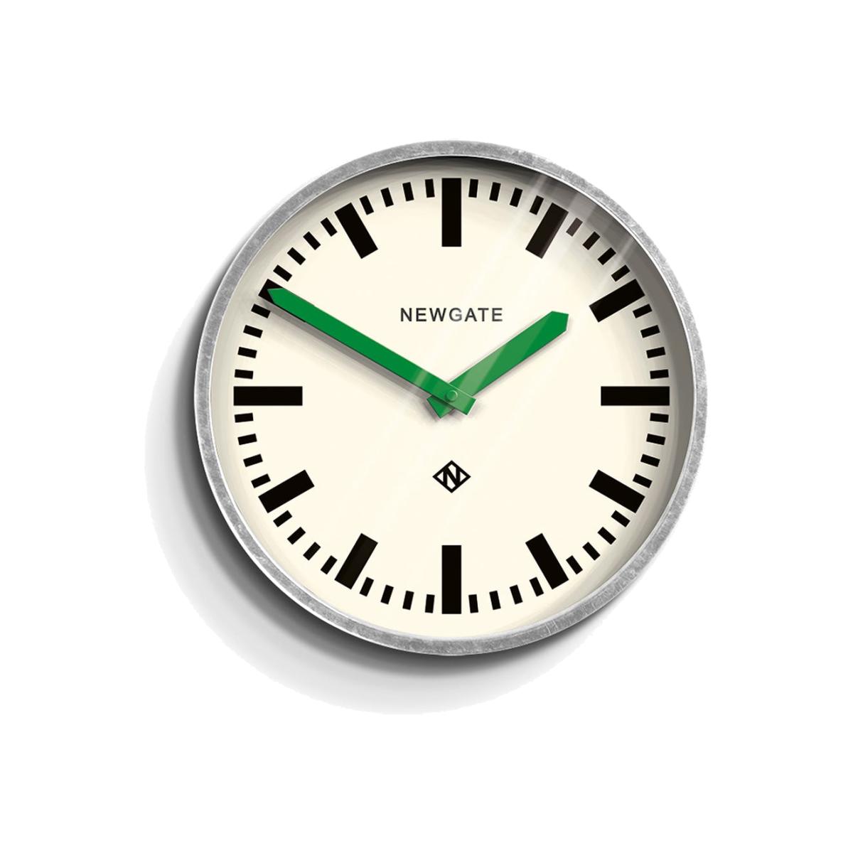 One of Newgate's most iconic clock designs, the Luggage is inspired by the mid-Century railway station clocks that Newgate's founders collected on their travels across Europe. A small black station wall clock with a bold marker dial, contrasting hands and deep straight-cut metal case with a gloss black finish.