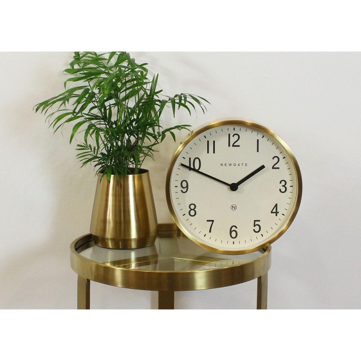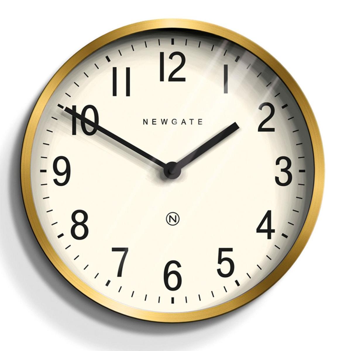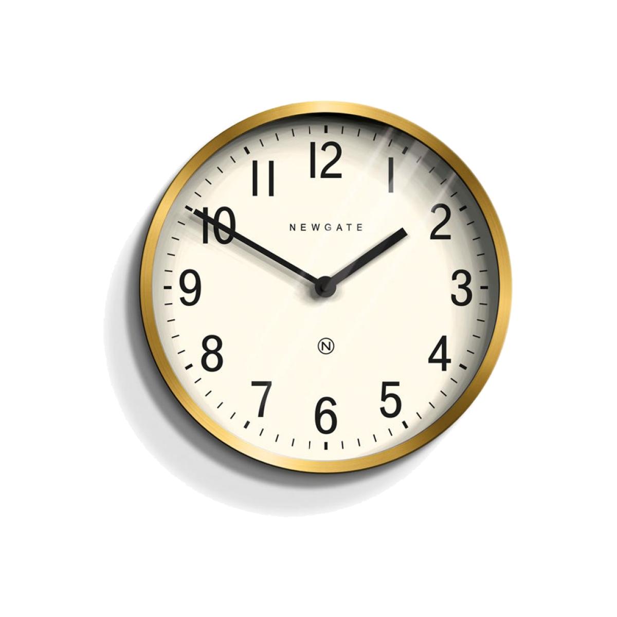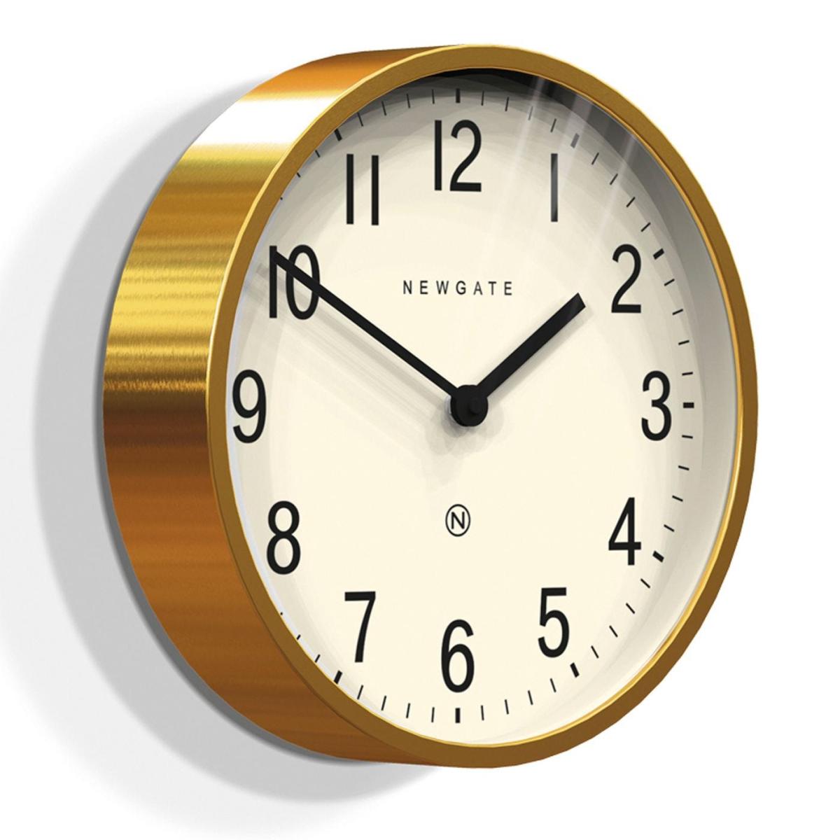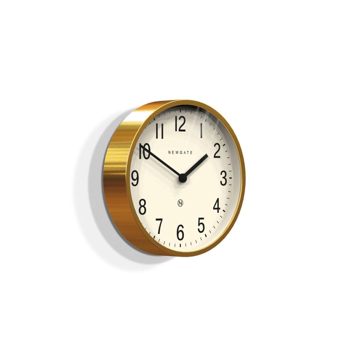 The Master Edwards wall clock features a solid circular metal case which is straight cut for a clean and graphic line. The deep brass case holds a bold modernist dial and a flat glass lens.