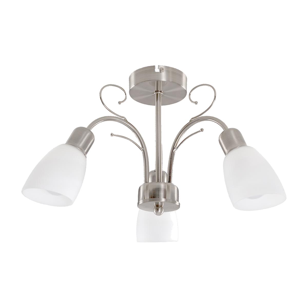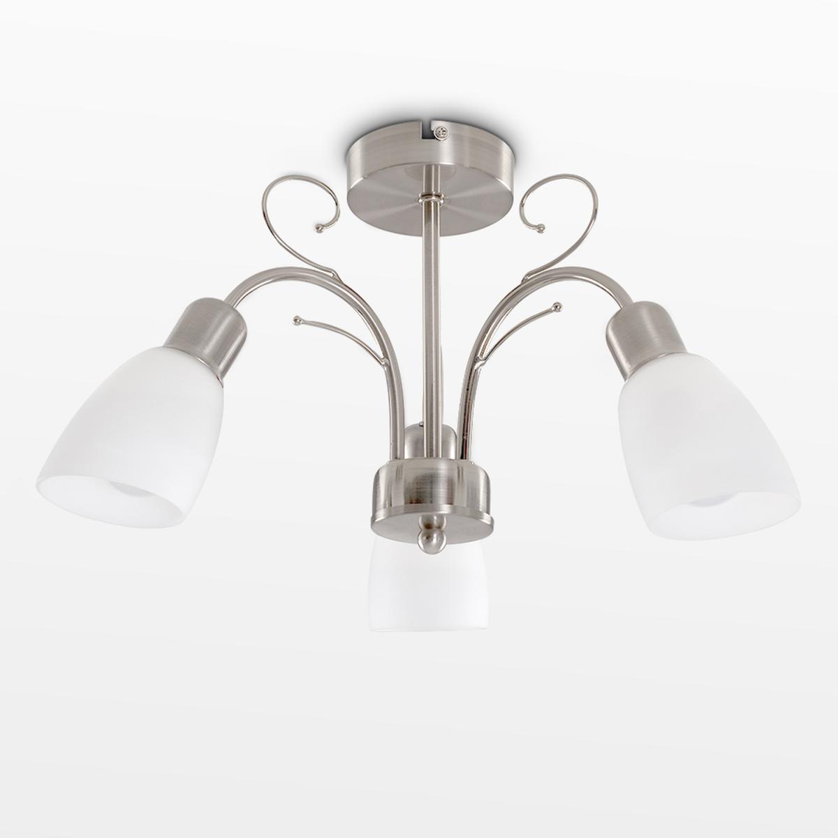 Modern 3 way ceiling light in a brushed chrome finish with white frosted glass shades. An ideal interior light for living rooms, bedrooms, hallways, kitchens and more. Ceiling lights are usually the main source of illuminating a room but with the many styles on offer today, also become a main focal point or talking point. The right fitting can make a real style statement and complete your living space look.
