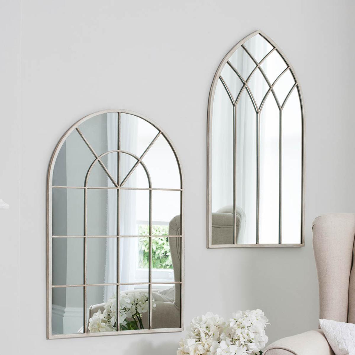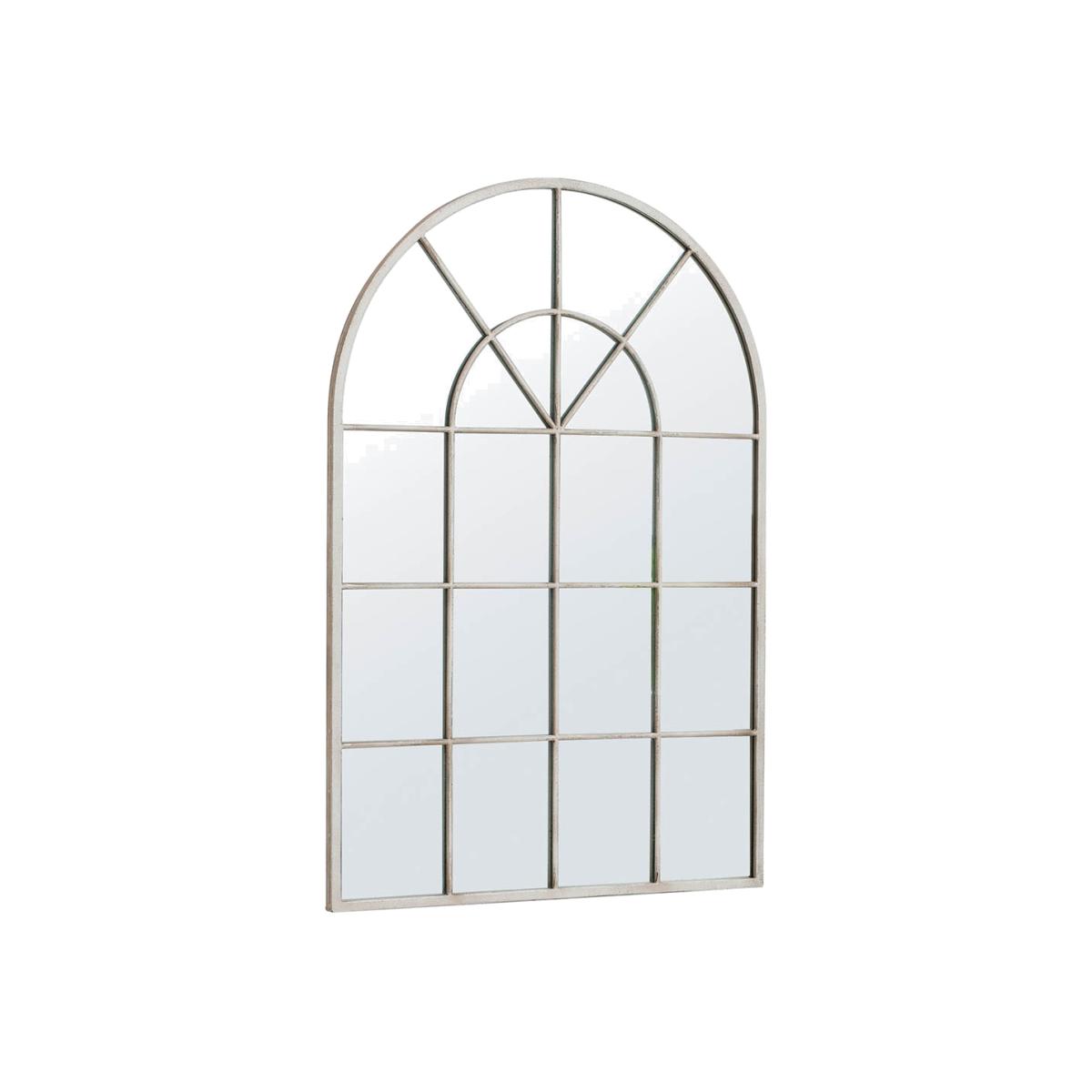 Beautiful arched top metal window mirror in a vintage cream painted finish. Shape: Arched. Material: Glass, Metal. Colour/Finish: Cream. Mount Type: Wall.