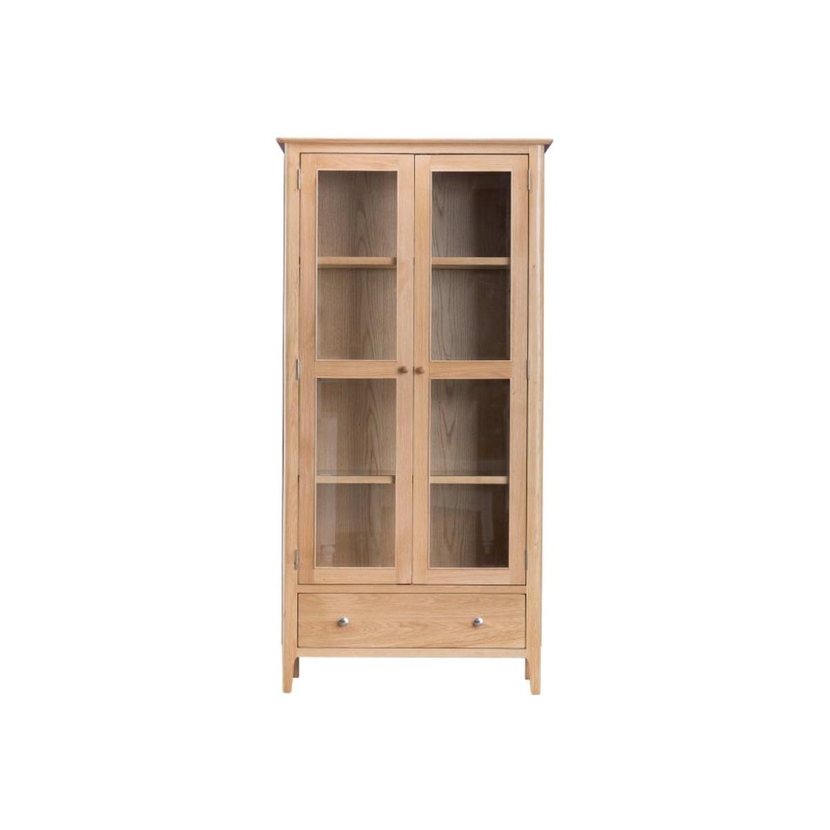 Created with an elegant Danish influence, the Newport collection has a light and fresh natural finish. All items that feature handles are supplied with wood and metal options, perfect for suiting most home décors. With a wide range of fantastic pieces to choose from, you will be adding style to your dining and occasional collection. The Newport display cabinet features three shelves behind glazed double doors, plenty of room to display and store your precious ornaments. This fabulous unit also features a convenient lower draw and internal lights. Natural Finish Oak & Oak Veneers Supplied with Wooden & Metal handles Internal lights Assembled Dimensions: 90cm (W) x 35cm (D) x 180cm (H) All screens vary in colour reproduction and whilst every effort has been made to display the colour as accurately as possible it is for guidance only.