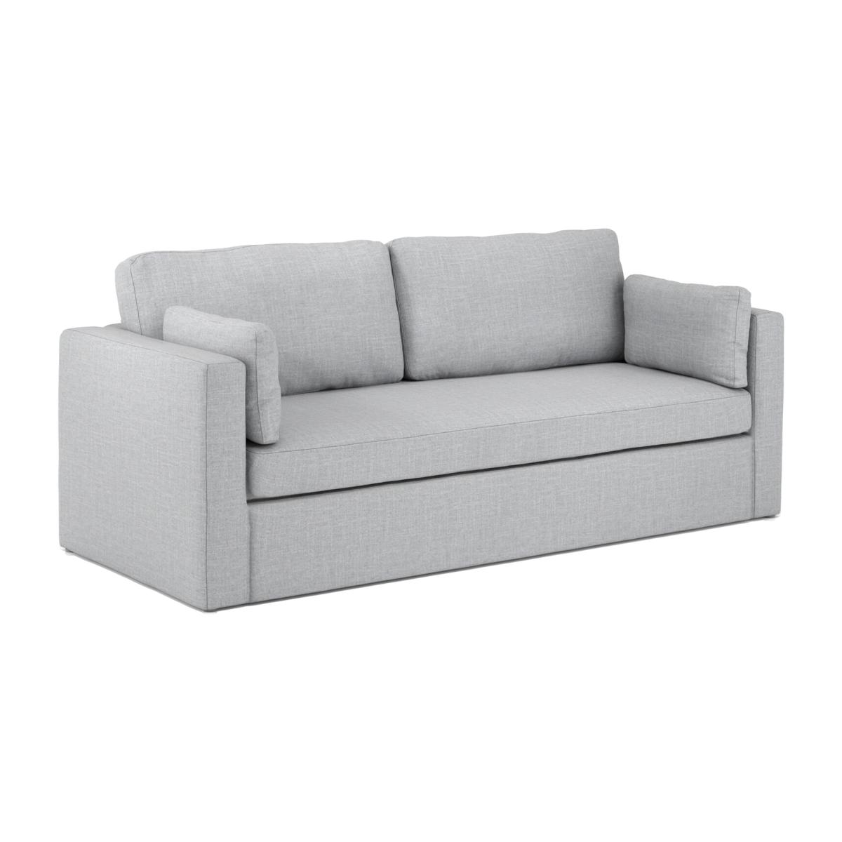 Create a comfy relaxing space with the Newport Sofa. Modern and stylish, this sofa is upholstered in a soft, light grey fabric and features plush seats to offer a comfortable seating space. It flaunts a simplistic design that blends with a variety of decor styles, making it perfect for elevating your home's appeal.
