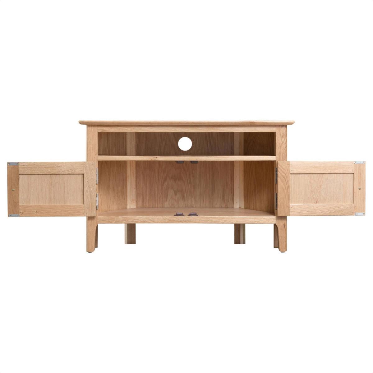 Created with an elegant Danish influence, the Newport collection has a light and fresh natural finish. All items that feature handles are supplied with wood and metal options, perfect for suiting most home décors. With a wide range of fantastic pieces to choose from, you will be adding style to your dining and occasional collection. The Newport corner TV unit features a shelf and a spacious cupboard, room for your media device, DVD’s and remote controls. The unit also has an opening at the back for cable management, to keep those unsightly cables hidden. Natural Finish Oak & Oak Veneers Supplied with Wooden & Metal handles Assembled Dimensions: 90cm (W) x 40cm (D) x 55cm (H) All screens vary in colour reproduction and whilst every effort has been made to display the colour as accurately as possible it is for guidance only.