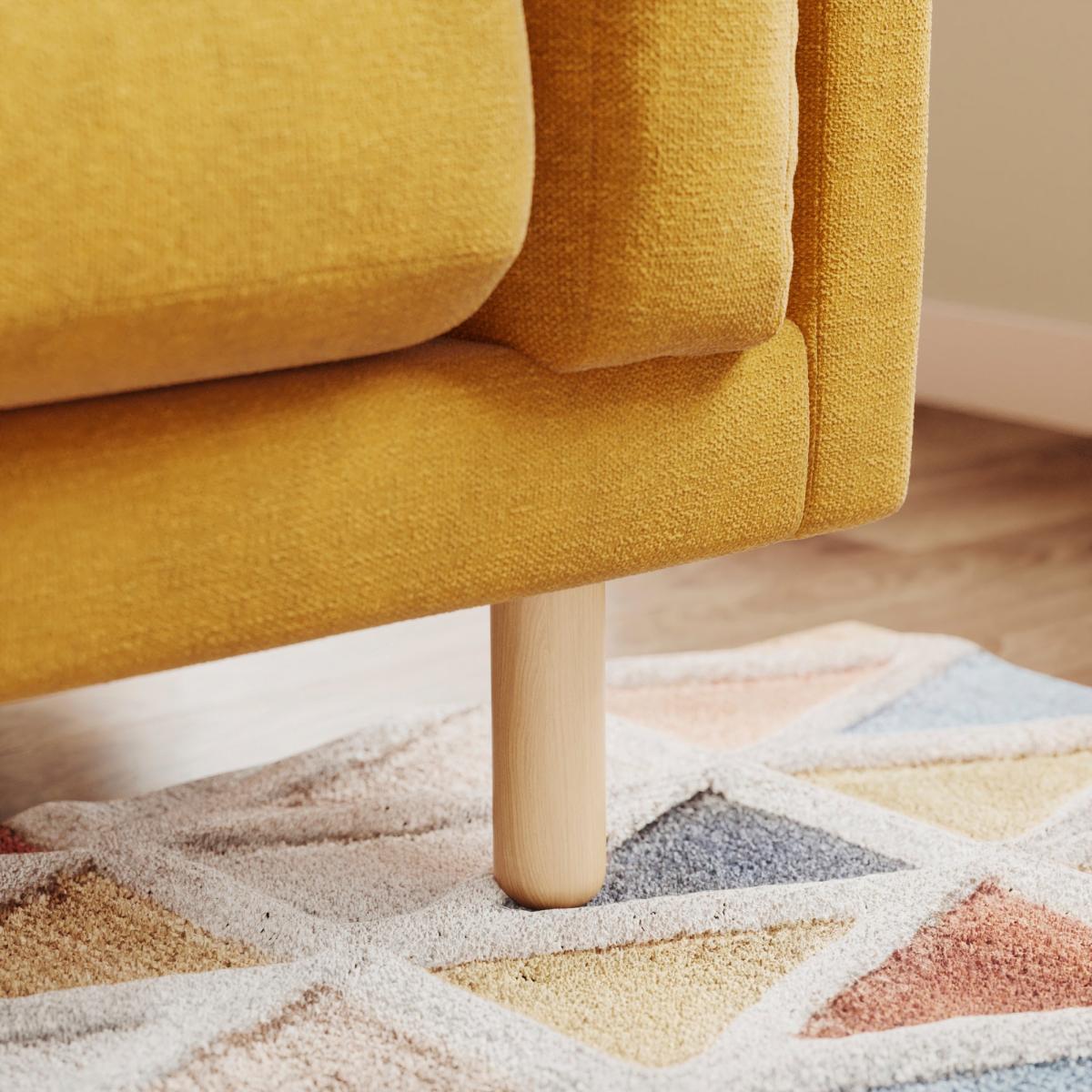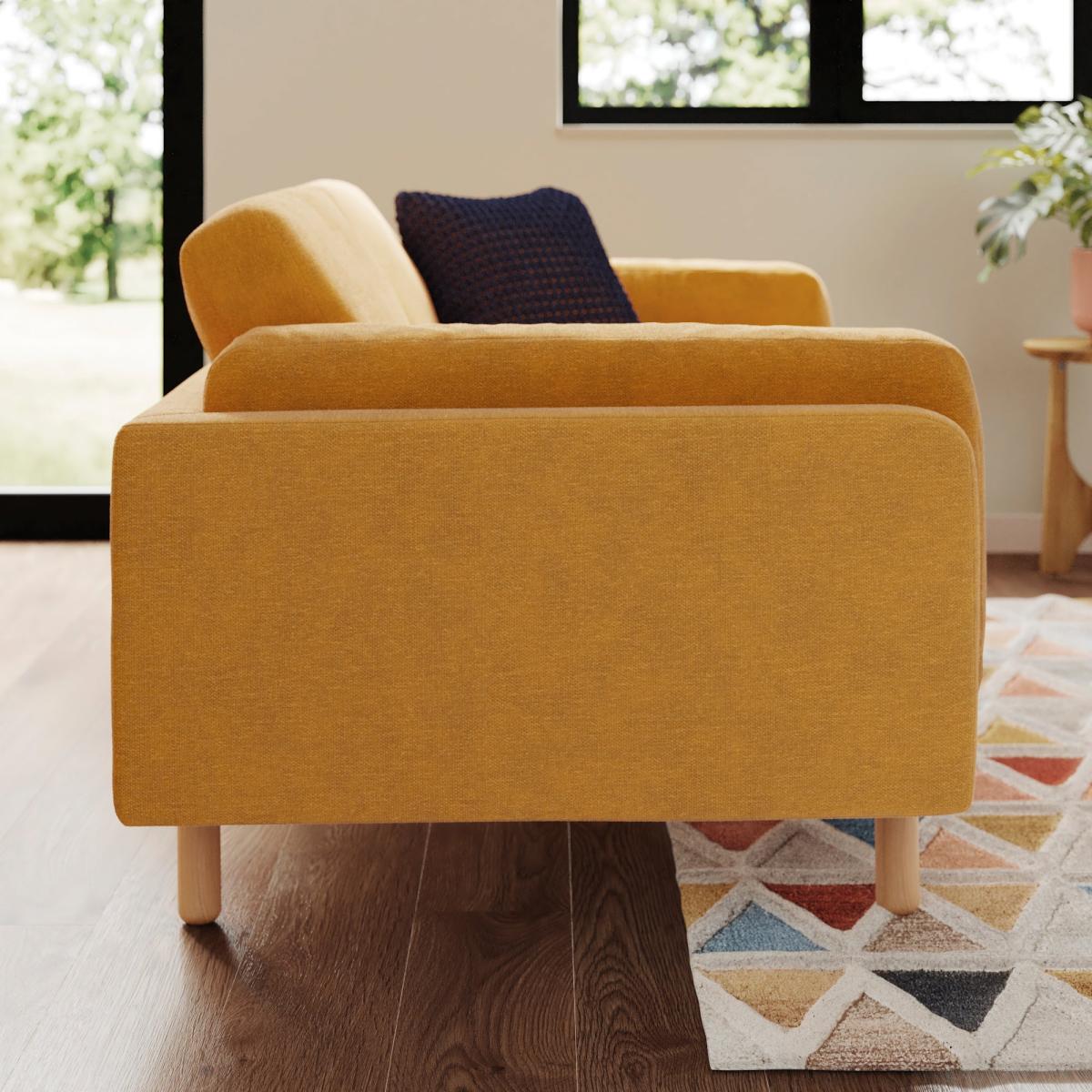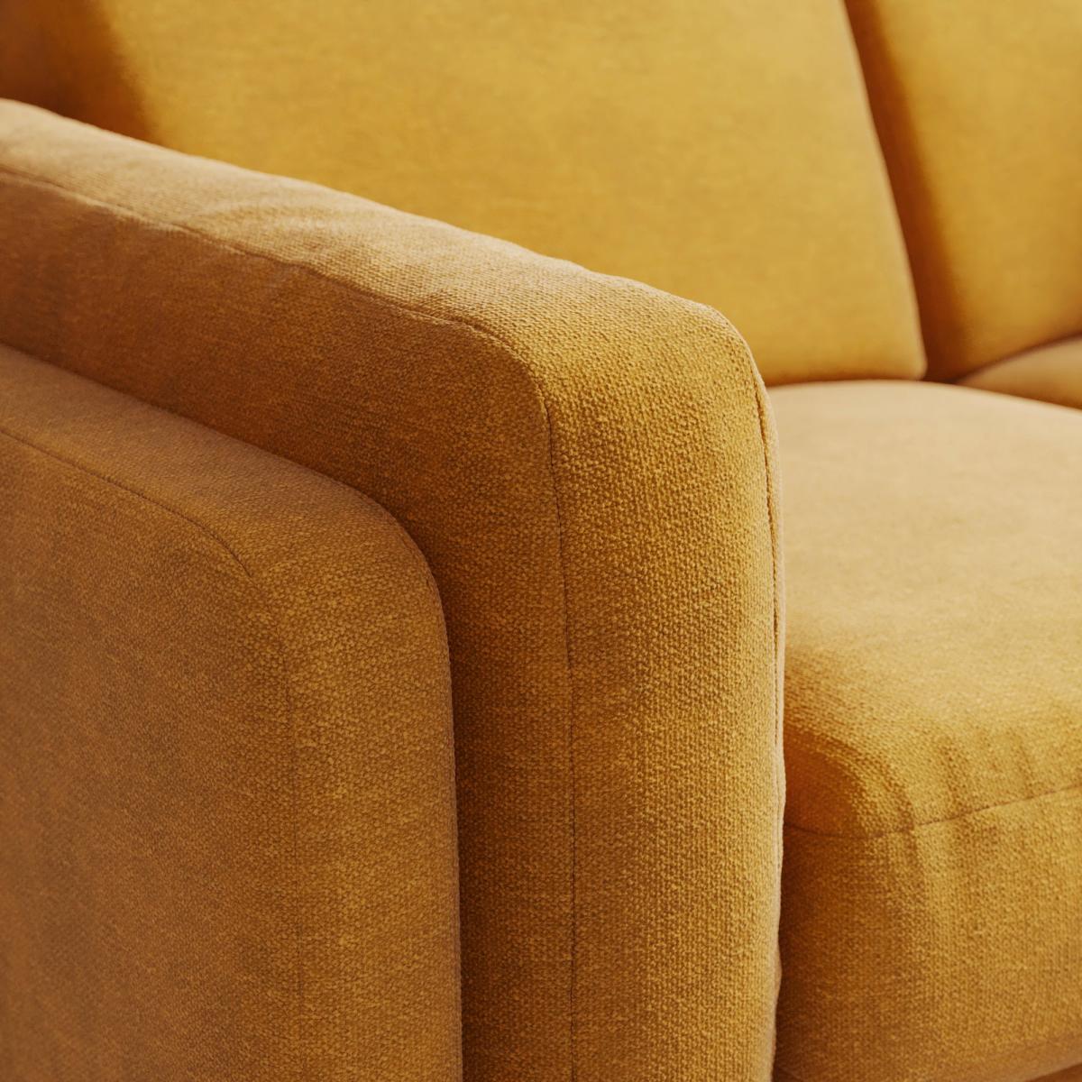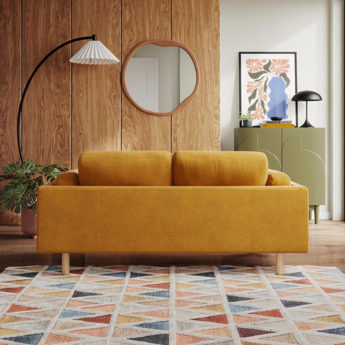 I love this sofa for its inviting, cosy feel and versatile design. The mustard velvet adds warmth and texture, making it a statement piece that suits both modern and mid-century inspired interiors. It works particularly well in light-filled living rooms or cosy reading nooks, where its colour can be complemented with earthy or neutral accessories. Practical styling tips include layering with patterned cushions for a relaxed vibe or pairing with a textured rug to ground the space. Its compact size makes it ideal for smaller living areas or as part of a sectional setup, and I’d recommend keeping the surrounding decor minimal to let the sofa truly stand out.