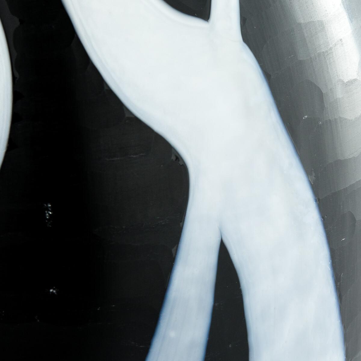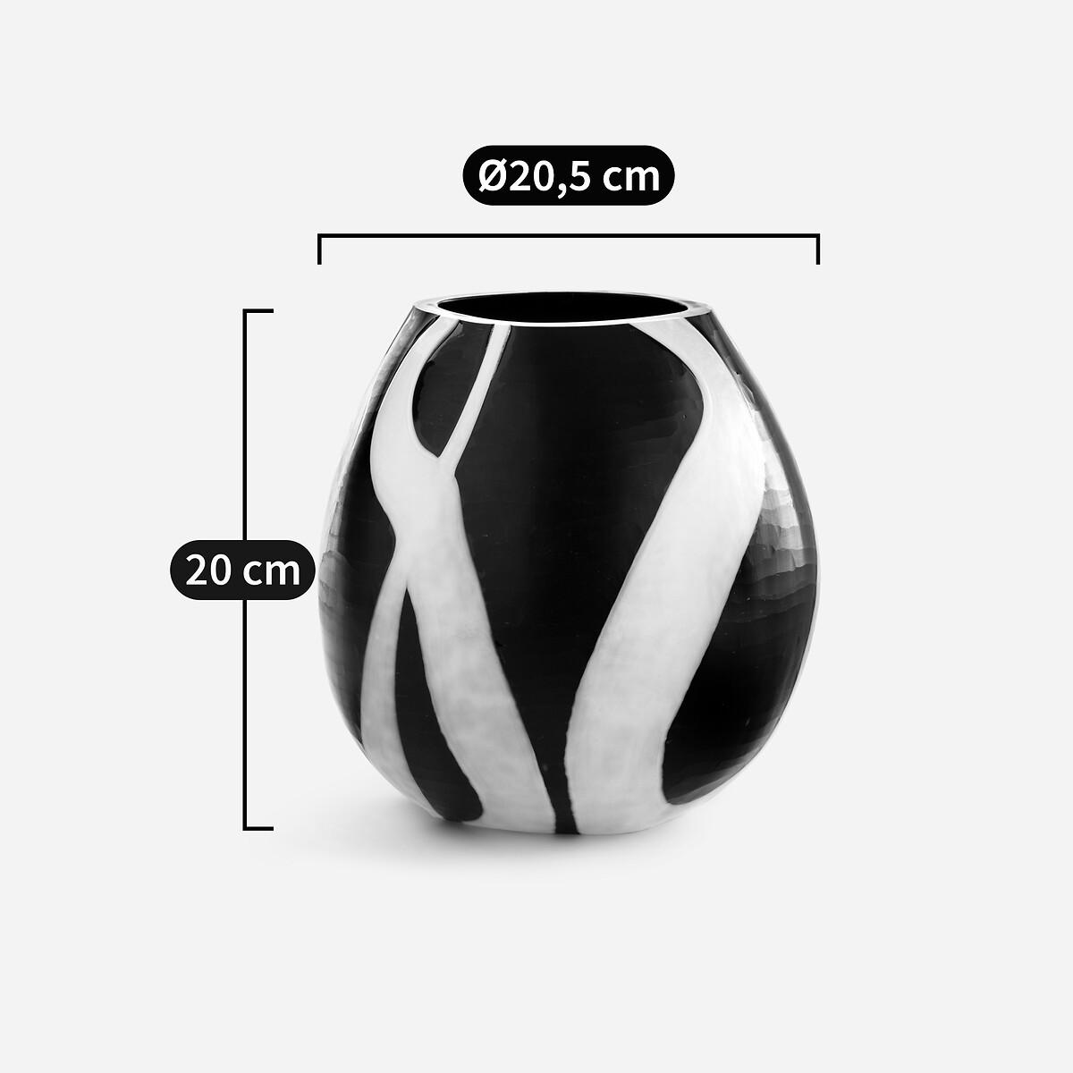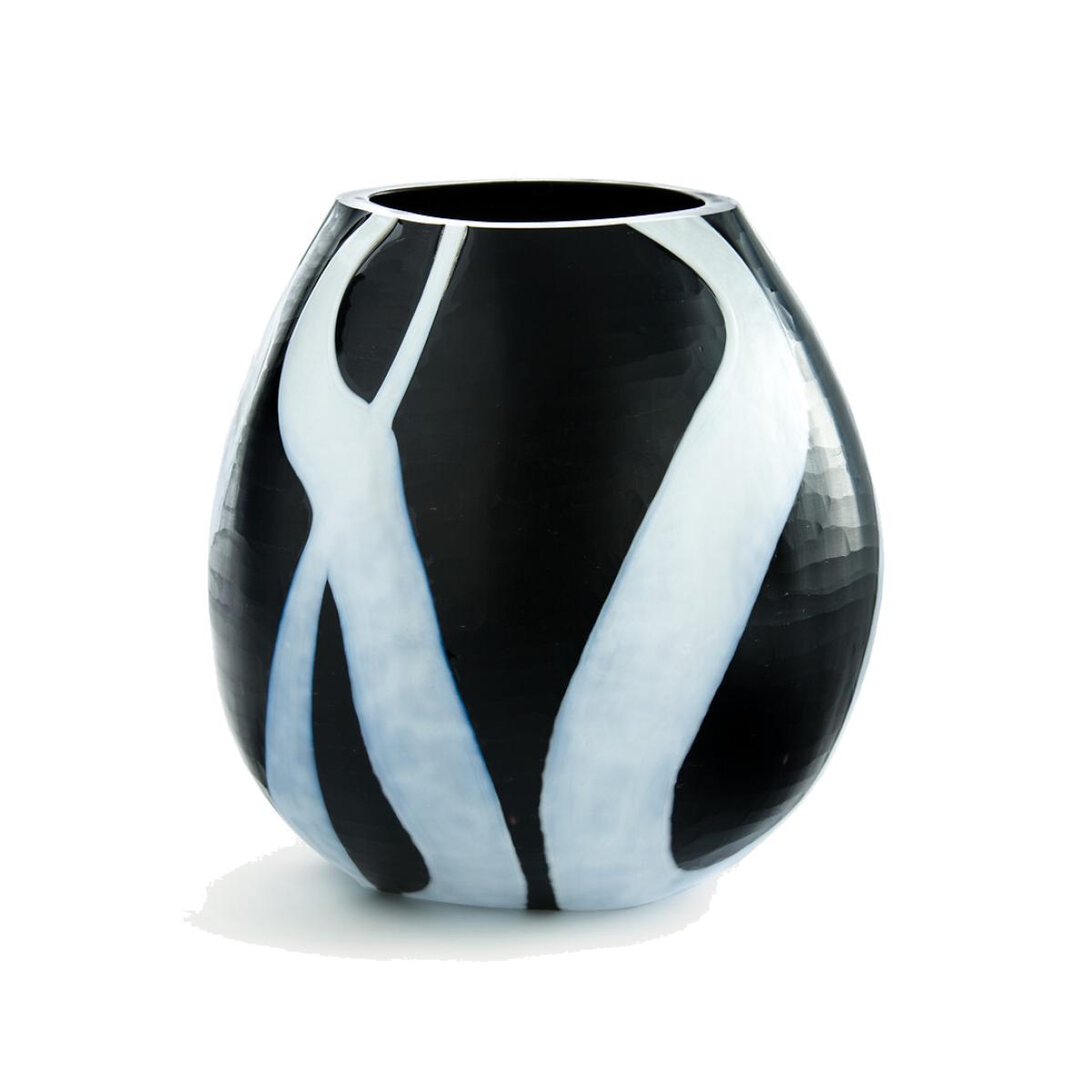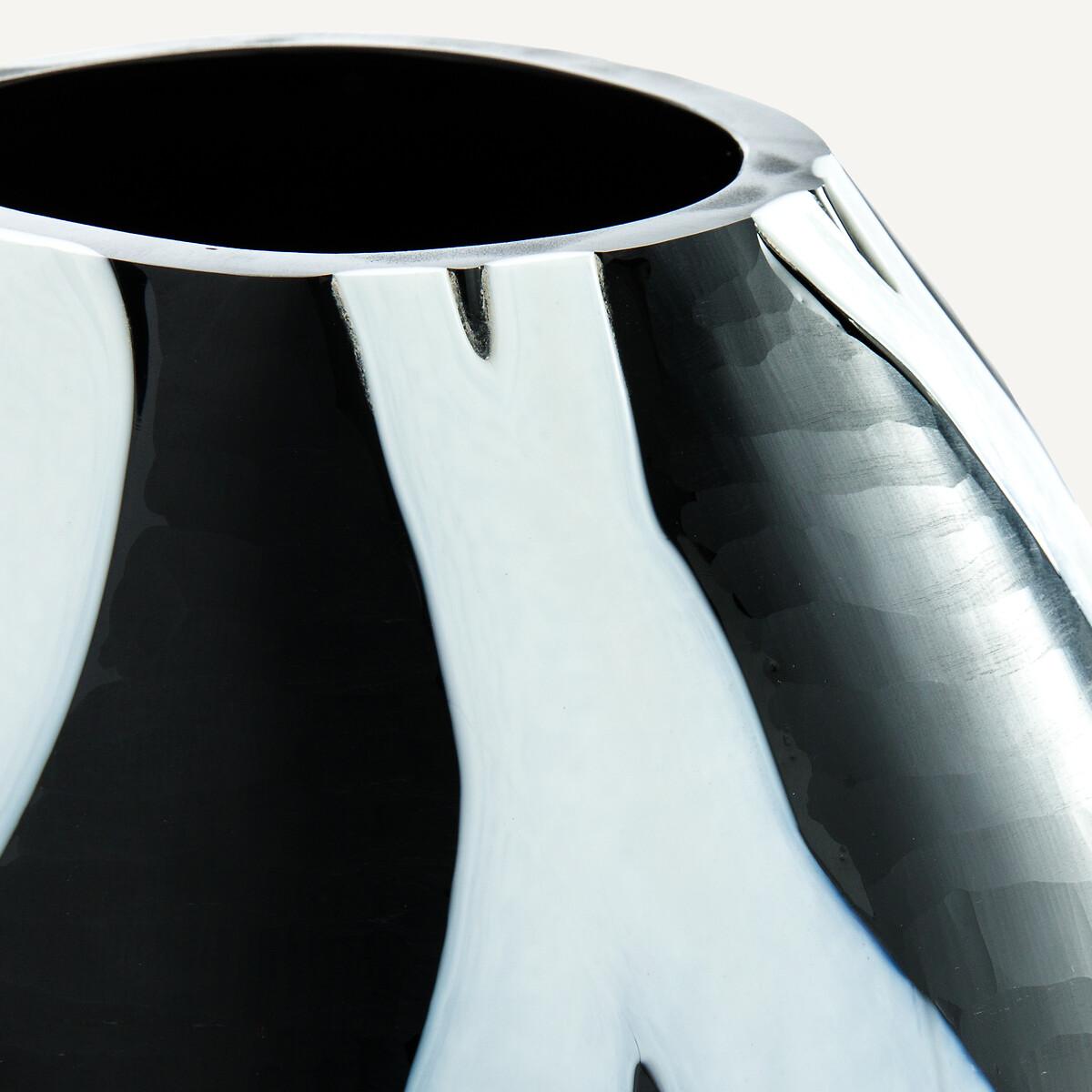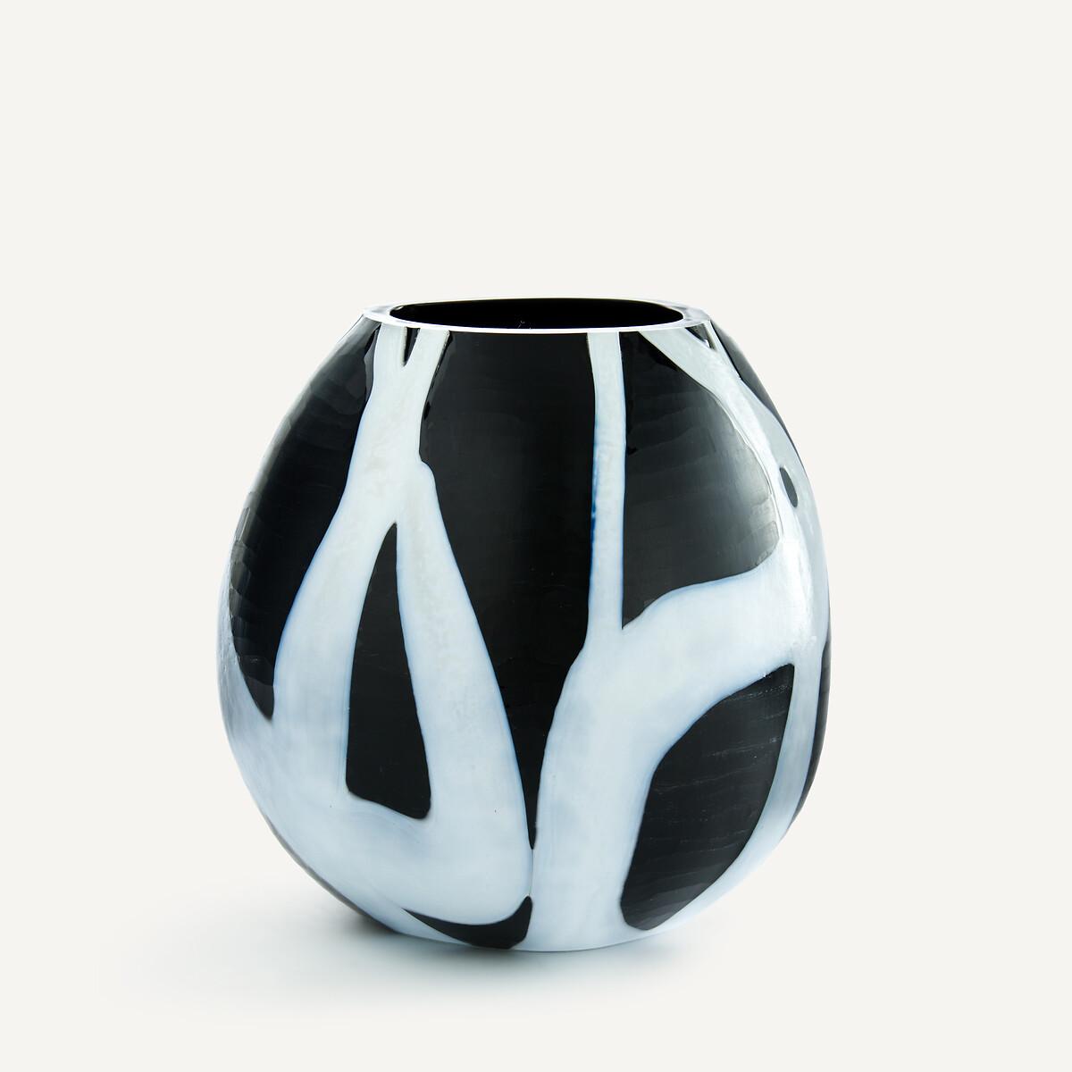 Its black surface is reminiscent of sculpted wood. The raw, natural look is softened by its round shape and glossy white, hand-painted lines with blurred edges, giving it a contemporary graphic touch. Product Details • Hand-blown glass, dyed then hand-painted • Artisanal craftsmanship. Each piece is unique. Shapes, sizes and colours may vary slightly from one product to another. Dimensions • Diameter: 20.5cm • Height: 20cm. Dimensions and weight of parcel • 1 parcel • L26.5 x H27 x D26cm. 2.8kg