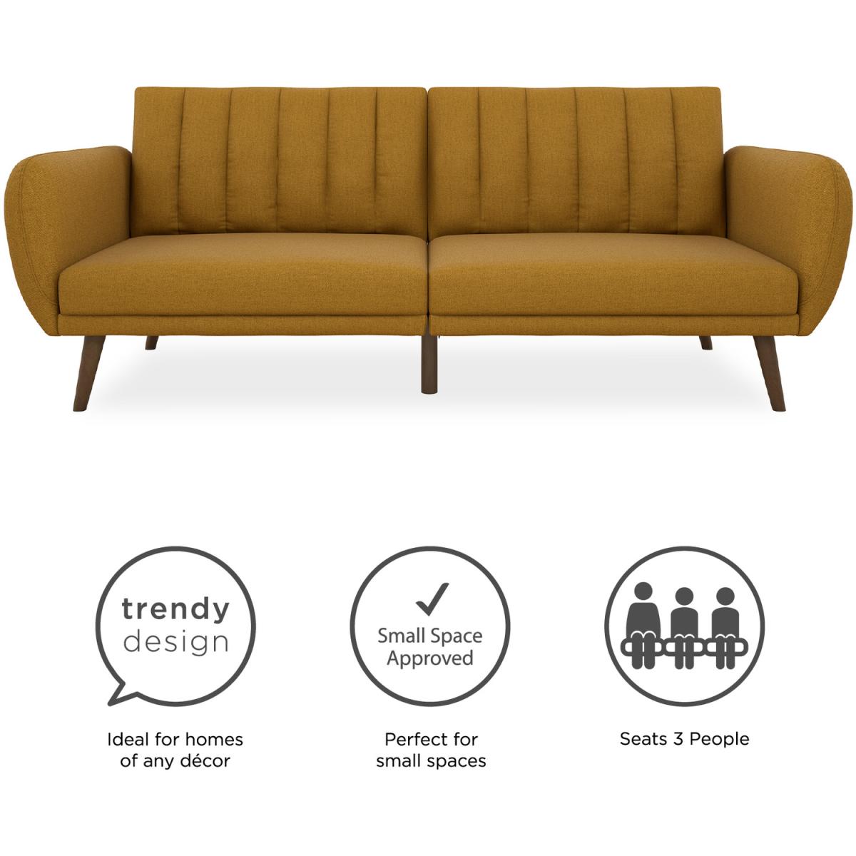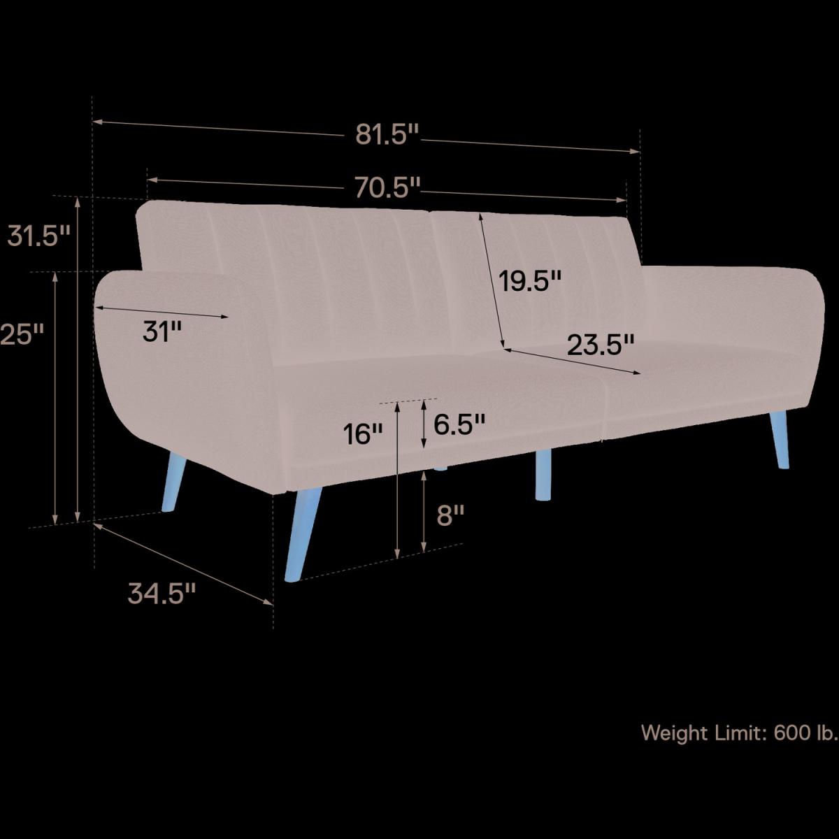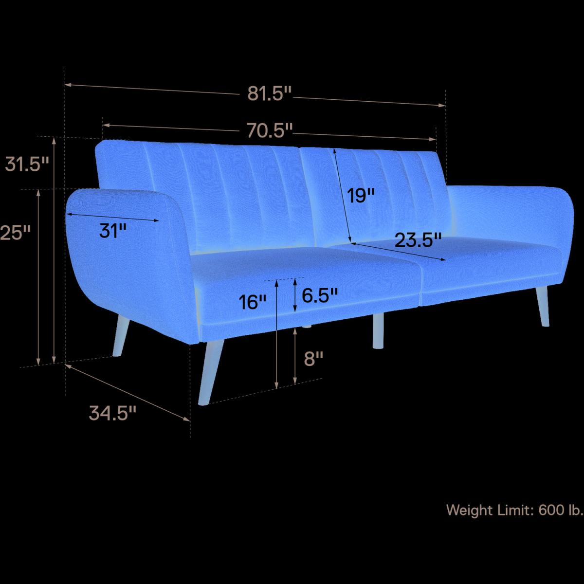 Be embraced by the comfortable cushioning of the Brittany linen futon. With its ribbed tufted cushioned back, the Brittany Linen futon gives your body all the support you need to sit and relax for hours. The combination of curved armrests and slanted legs work together to provide a unique rounded look that stands out. The linen upholstery adds another element of elegance making this a perfect statement piece for any living space.