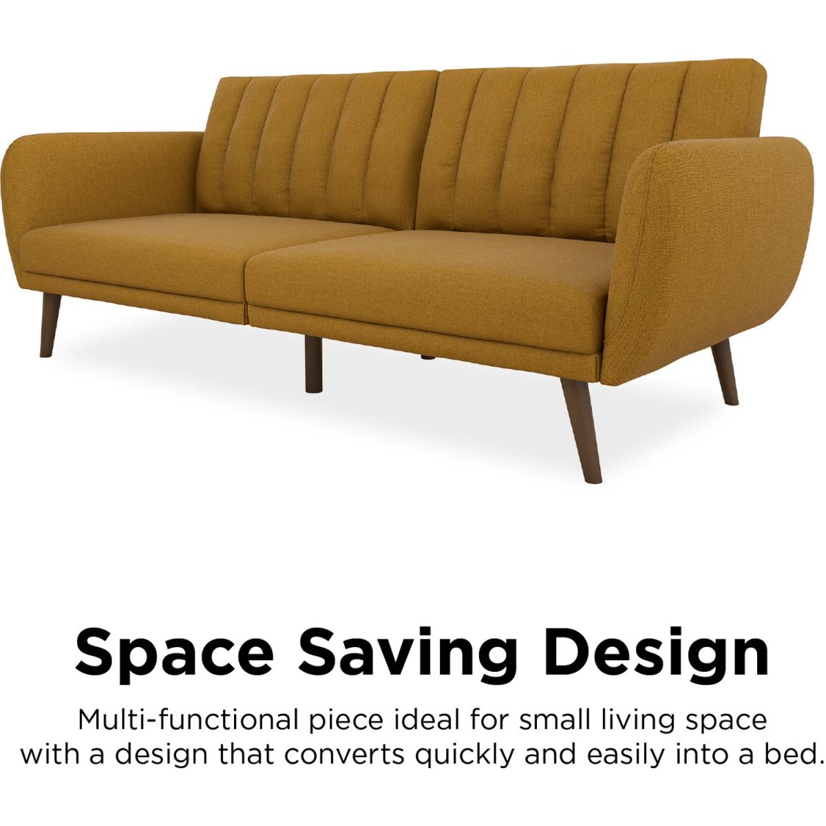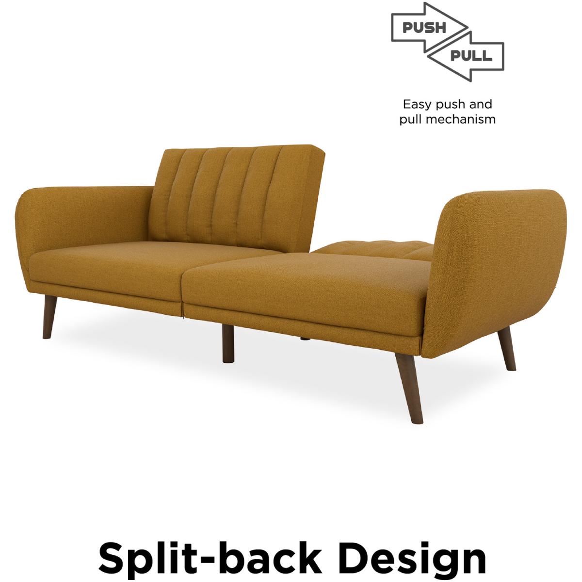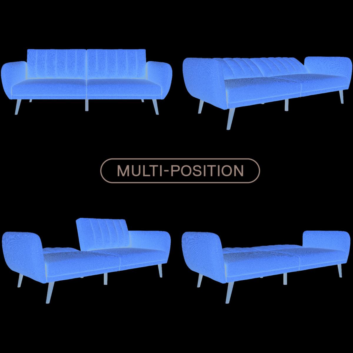 Be embraced by the comfortable cushioning of the Brittany linen futon. With its ribbed tufted cushioned back, the Brittany Linen futon gives your body all the support you need to sit and relax for hours. The combination of curved armrests and slanted legs work together to provide a unique rounded look that stands out. The linen upholstery adds another element of elegance making this a perfect statement piece for any living space.