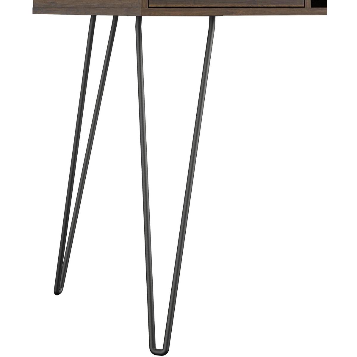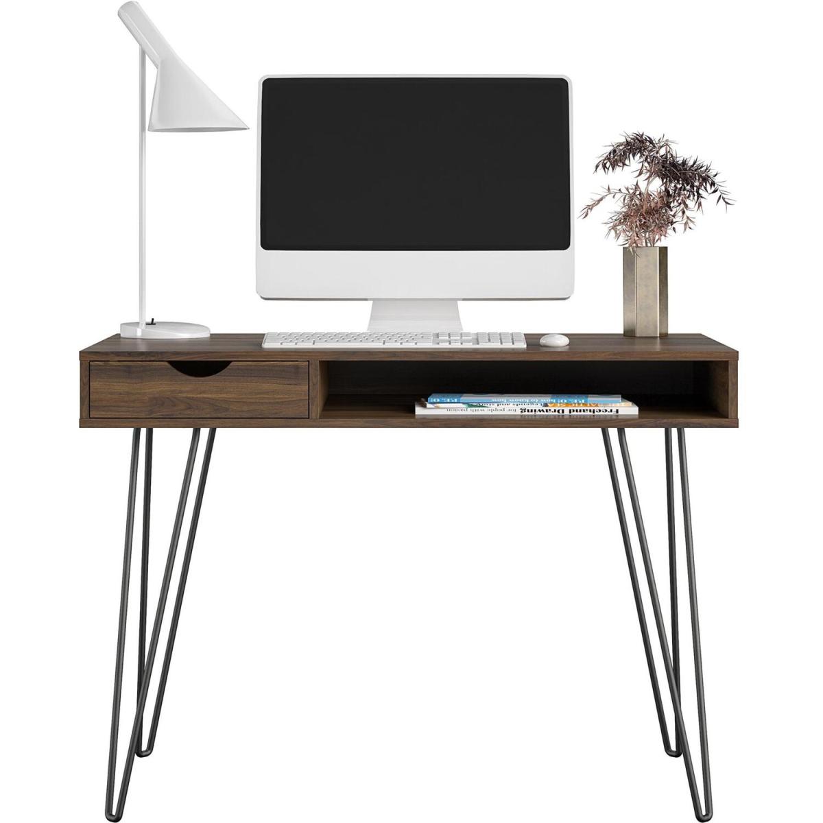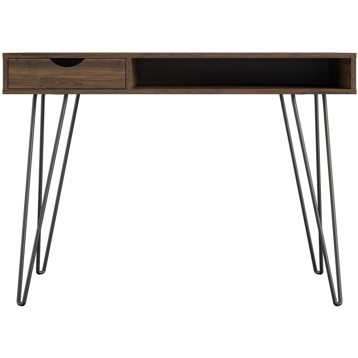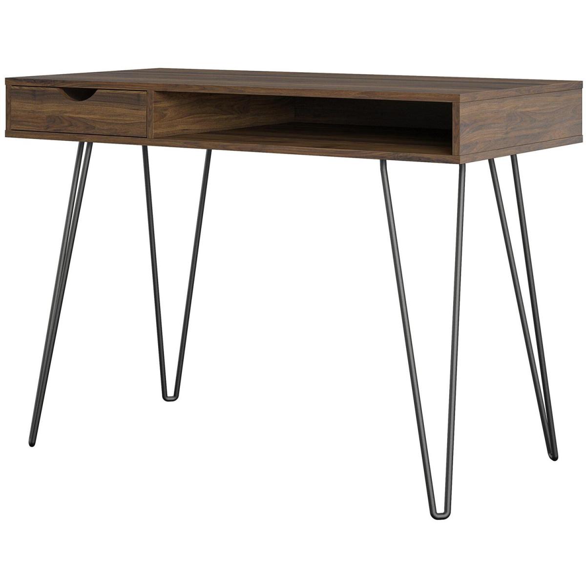 Add some mid-century style to your space with the Novogratz Concord Computer Desk with Storage. Inspired by mid-century design, the classic woodgrain finish on the laminated particleboard pairs with the black metal hairpin legs for a retro twist.